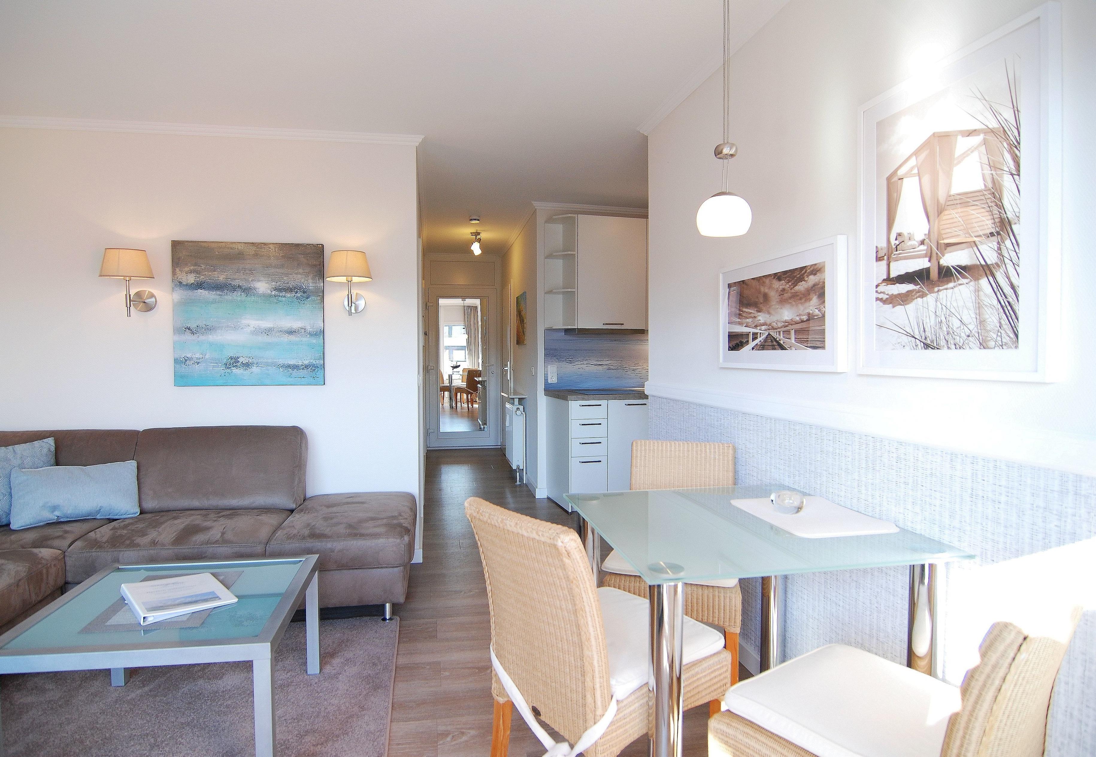 Die Wohnungen des Typs A1S verfügen über einen Wohn- und Essbereich mit Küchennische sowie einem Schlafzimmer und Badezimmer. Mit ihren 32qm sind sie besonders für den Urlaub zu zweit oder allein geeignet. Können aber auch zu dritt bewohnt werden.