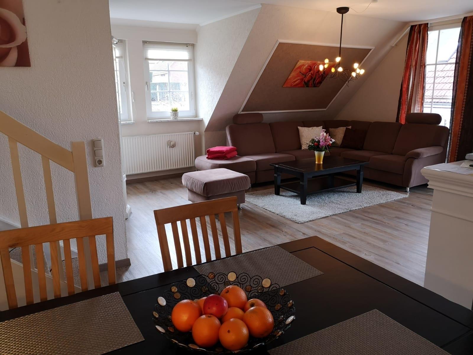 Die Wohnfläche der ca. 120 m² großen Unterkunft verteilt sich über zwei Etagen (1. und 2. Stock) auf ein weitläufiges Wohnzimmer, eine separate Küche sowie das Badezimmer und zwei separate Schlafzimmer.