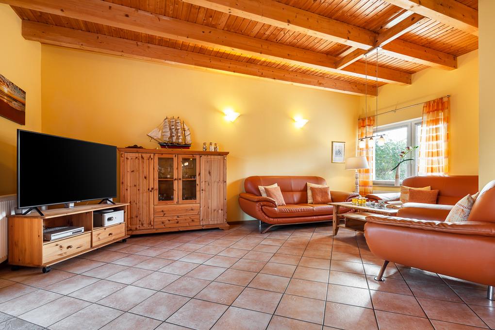 Im großen Wohnzimmer finden Sie eine gemütliche Leder-Couchgarnitur. Hier finden Sie außerdem einen Medienbereich mit Sat-TV, Radio, Leseecke und natürlich einen Internetanschluss. WLAN ist im gesamten Objekt und im Außenbereich kostenlos für Sie nutzbar.