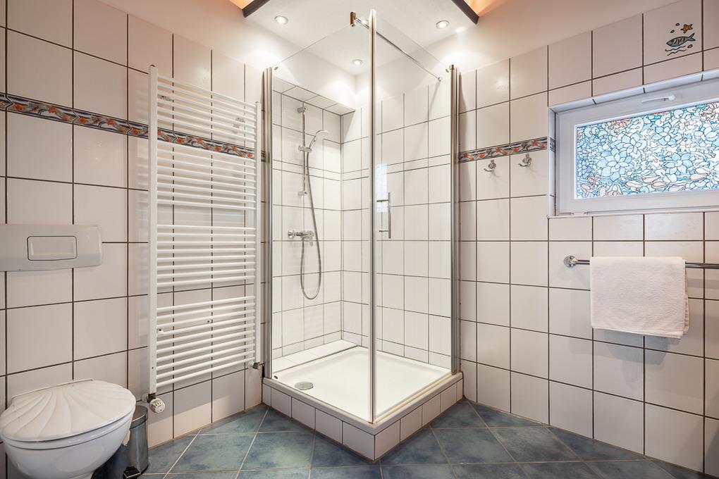 Gegenüber dem Elternschlafzimmer befindet sich unser geräumiges Familien-Duschbad mit WC und Fenster. Für Kinder aber auch für Senioren haben wir Ihnen hier adäquate Hilfshocker bereitgestellt.