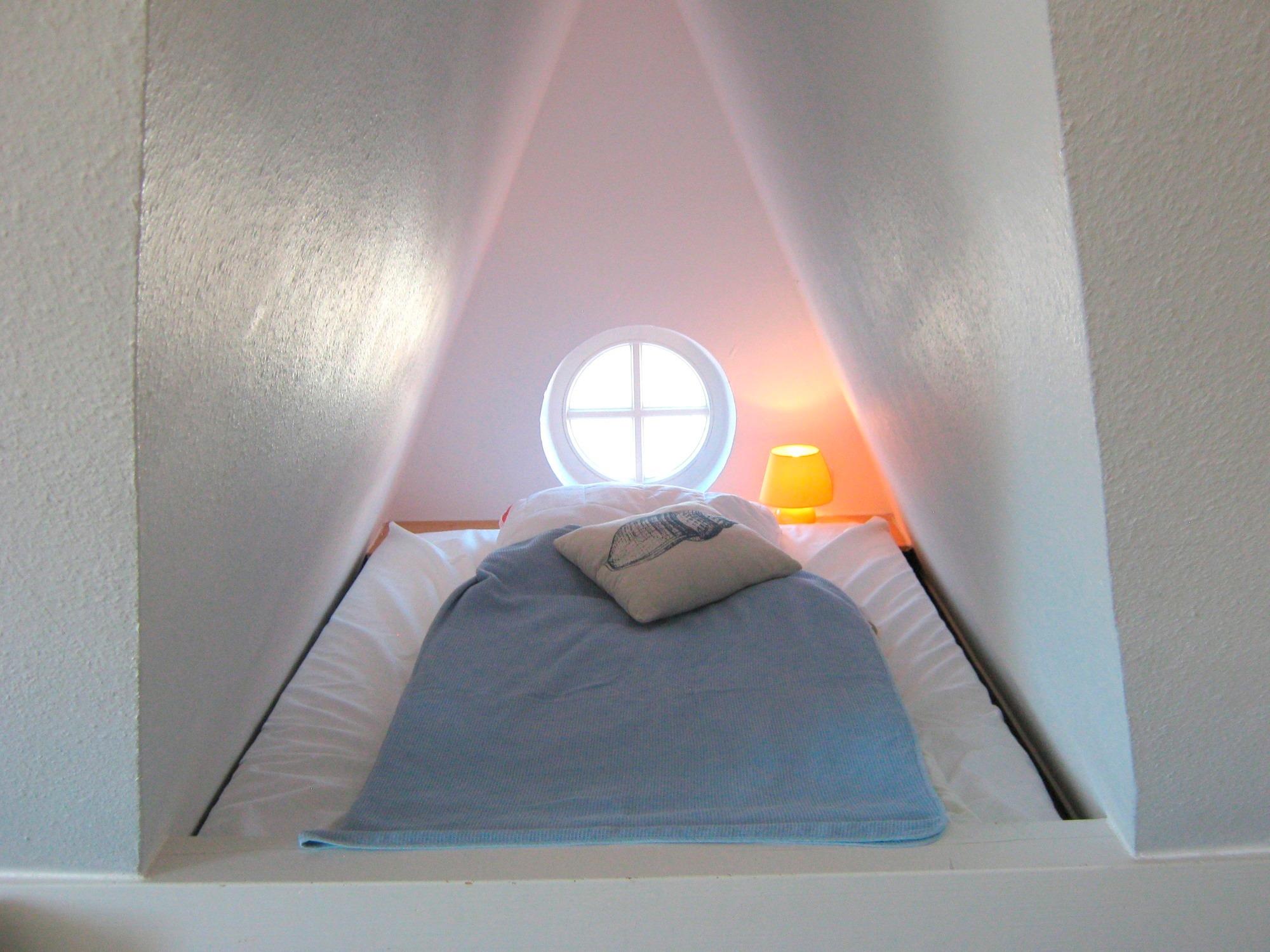 Im ausgebauten Dachgeschoss, der über eine feste Treppe erreichbar ist, befindet sich das Schlafzimmer mit einem großen Doppelbett und einem geräumigen Alkoven mit Fenster. Hier haben Sie eine zusätzliche Schlafmöglichkeit für eine erwachsene Person oder zwei Kinder. Ein Kinderbett und Hochstuhl können bei unserem Verwalter auf Anfrage gemietet werden.