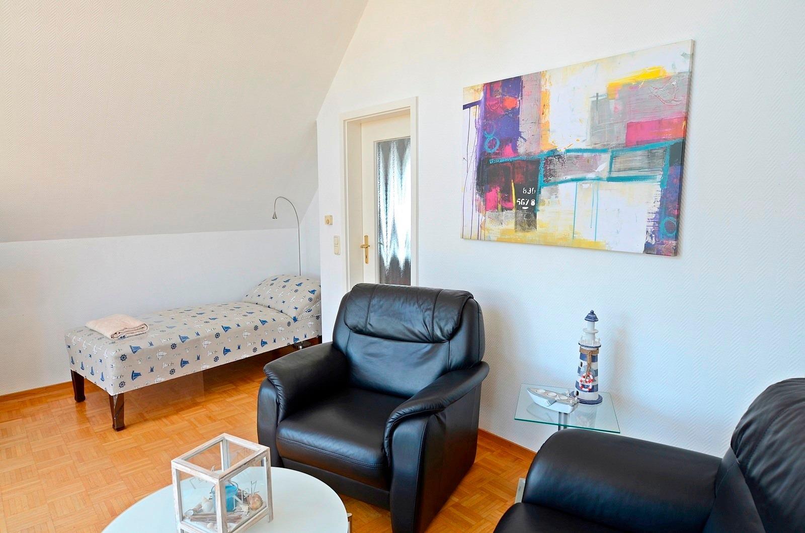 In unserem Ferienhaus Marina II bieten wir Ihnen in verkehrsberuhigter und strandnaher Lage 5 im maritimen Stil möblierte Fewos für 2-4 Personen an. In 5 Min sind Sie am Strand. Sehr schöne Studio-Ferienwohnung in der 1. Etage/Dachgeschoss mit giebelhohem Wohnzimmer, eingerichtet mit 2er Ledersofa und separatem Ledersessel, Chaiselongue in maritimer Optik mit Leseleuchte. Von hier aus haben Sie Zugang zum schönem Südbalkon mit elektrischer Markise - Sitzmöbel, Tisch sowie Polsterauflagen sind vorhanden. Die Küche in schwarz-rot-Optik ist mit Backofen/Ceranfeld, Geschirrspüler, Kühlschrank/Gefrierfach, Waschmaschine, Mikrowelle, Kaffeemaschine, Toaster, Wasserkocher sowie kleiner Essecke für 2 Personen ausgestattet. Das helle, freundliche Schlafzimmer ebenfalls mit Südwest-Balkon, Doppelbett 180/200 (2 Einzelmatratzen 90x200) sowie Einbauschrank und Kommode in weiss. Das