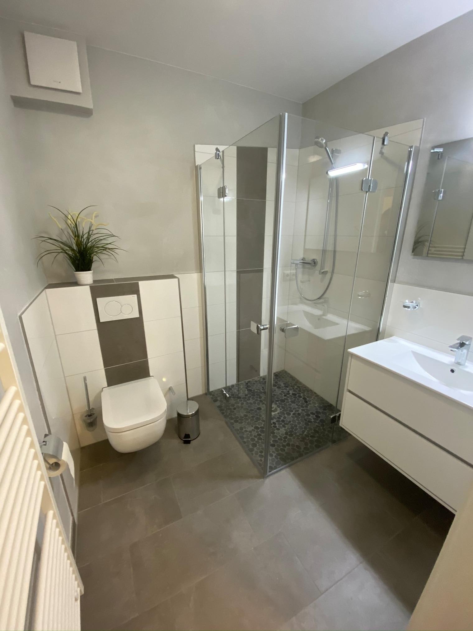 Ein modernes Badezimmer mit einer geräumigen ebenerdigen Dusche, beheizbarem Handtuchhalter und einem Föhn erwartet Sie.