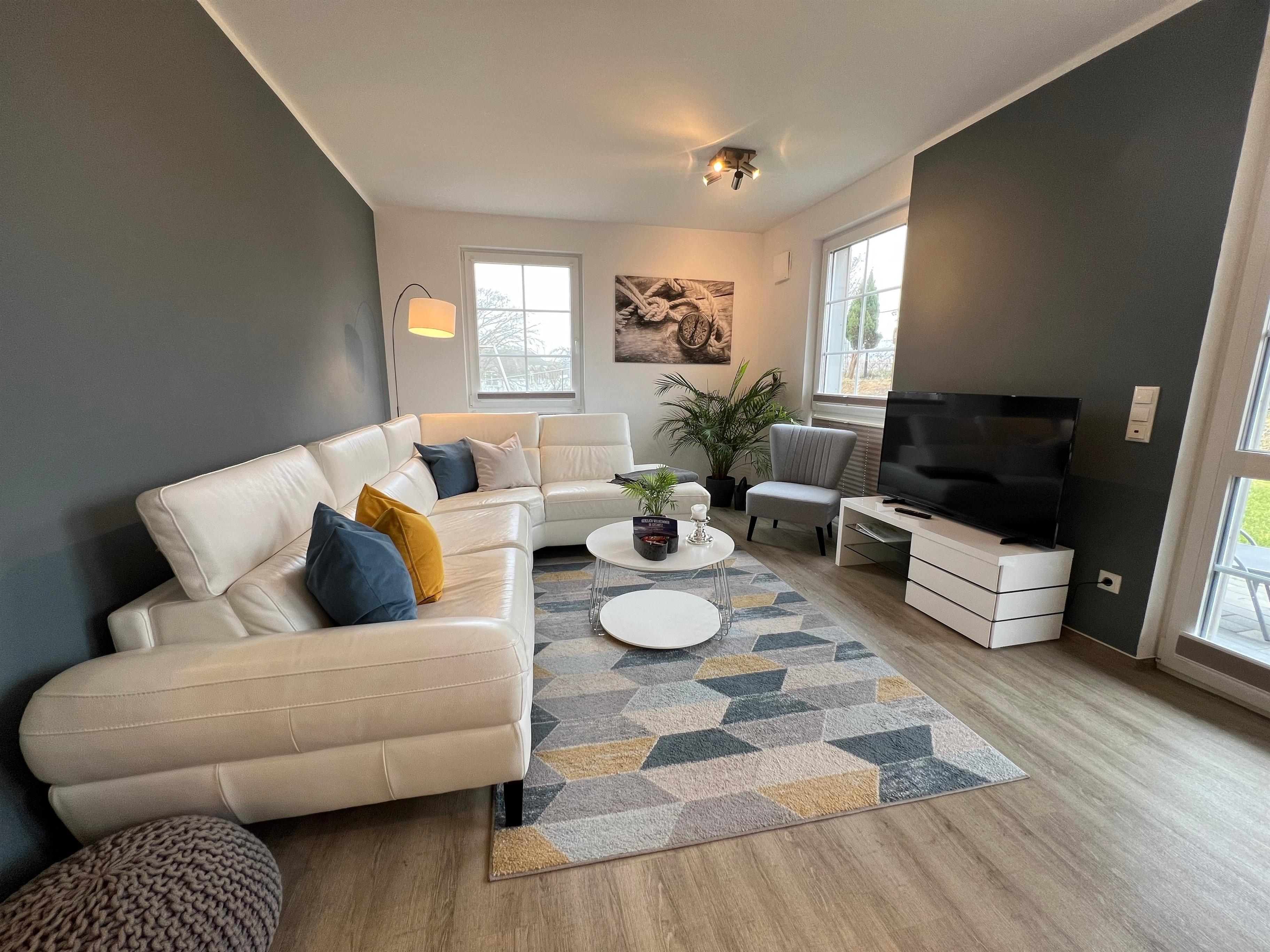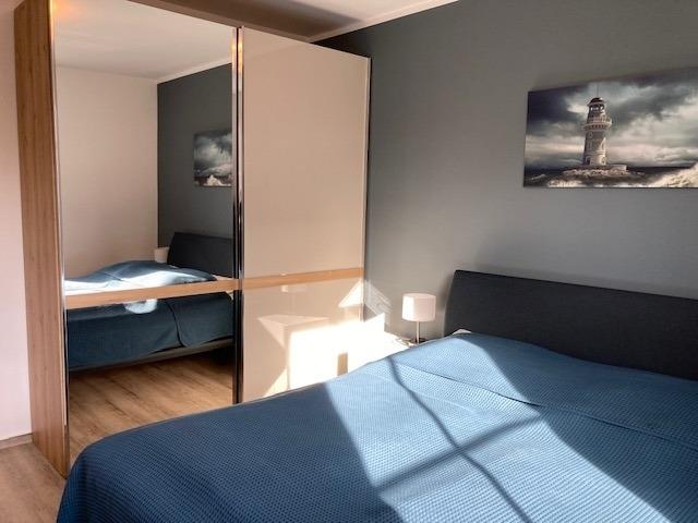 Diese maritim-moderne Wohnung befindet sich im Erdgeschoss und verfügt über einen großzügigen offenen Wohn- und Essbereich mit einer hochwertigen Wohn/Schlafcouch (Liegefläche 140 x 190 cm). Maritime Accessoires sowie die bodentiefen Fenster geben dem Bereich einen besonderen Charme und bringen viel Licht in den Lebensraum. Freuen Sie sich auf eine voll ausgestattete moderne Küche, zwei separate Schlafzimmer mit jeweils einem Boxspringbett (180cm x 200cm und 160cm x 200cm) und einem Kleiderschrank für Ihre Garderobe. Einen zweiten Flachbildfernseher finden Sie in einem dieser Schlafräume.