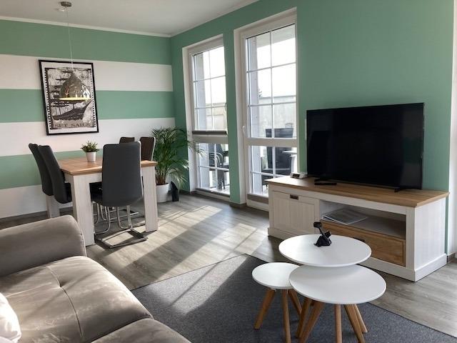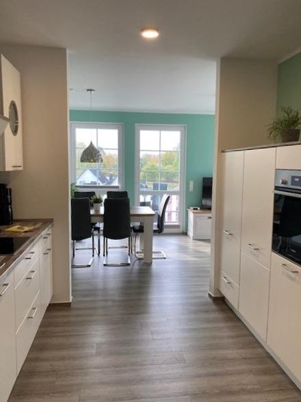 Es erwartet Sie ein helles und modernes Appartement in freundlichen Farben. Im großzügigen Wohn-/Essbereich finden Sie eine voll ausgestattete moderne Einbauküche im maritimen Stil.