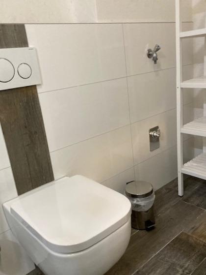 Das moderne Badezimmer verfügt über eine ebenerdigen Dusche, einen beheizbaren Handtuchhalter und einen Föhn.