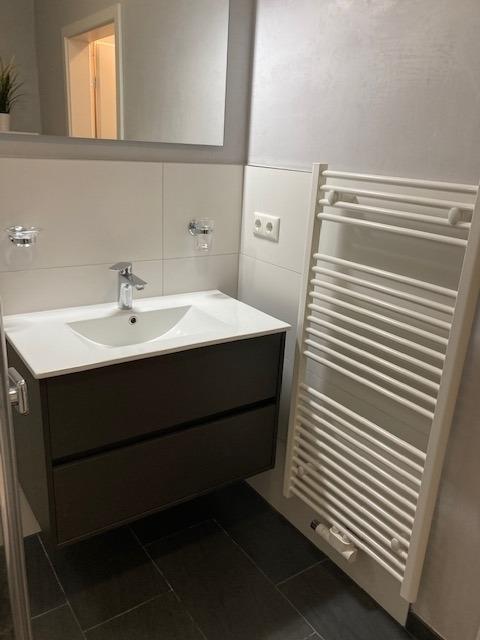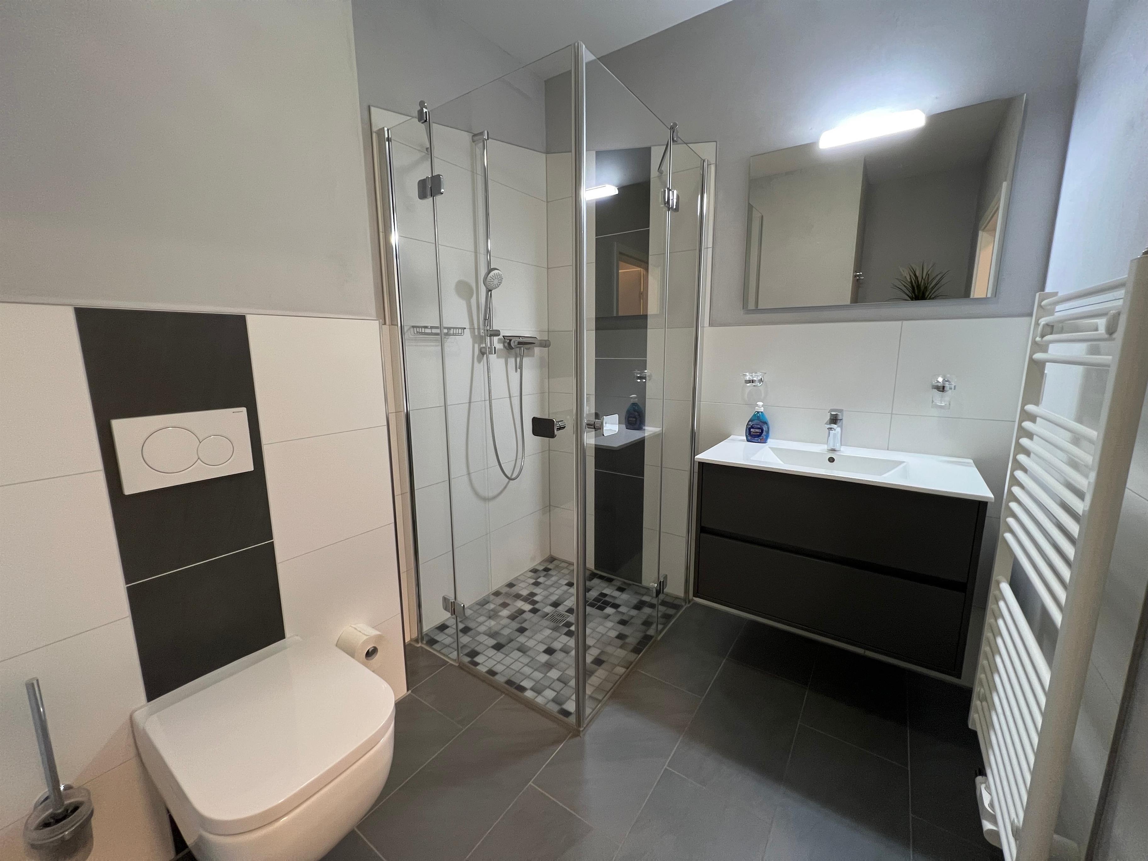 Das moderne Badezimmer bietet Ihnen eine geräumige ebenerdige Dusche, einen beheizbaren Handtuchhalter und einen Föhn.