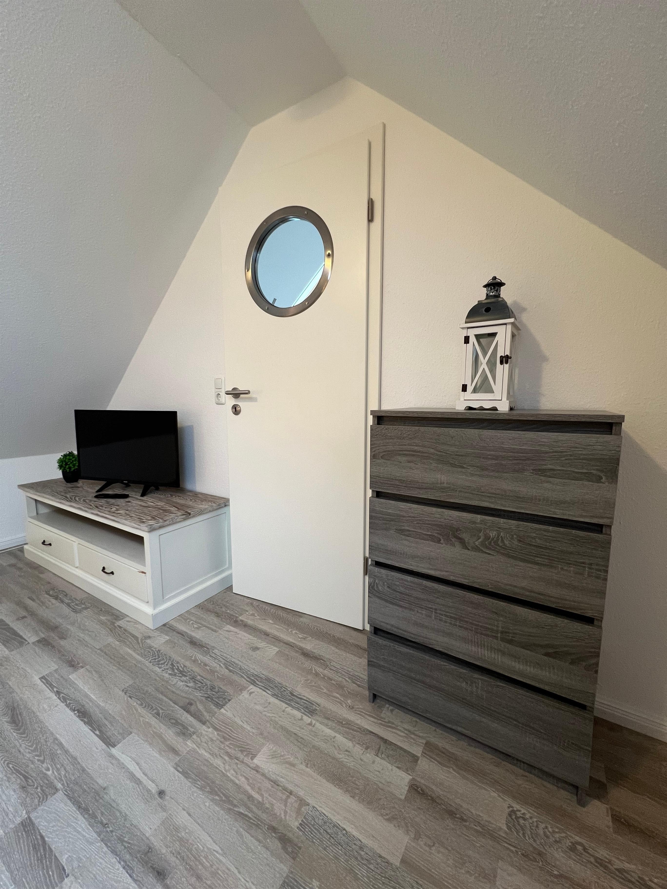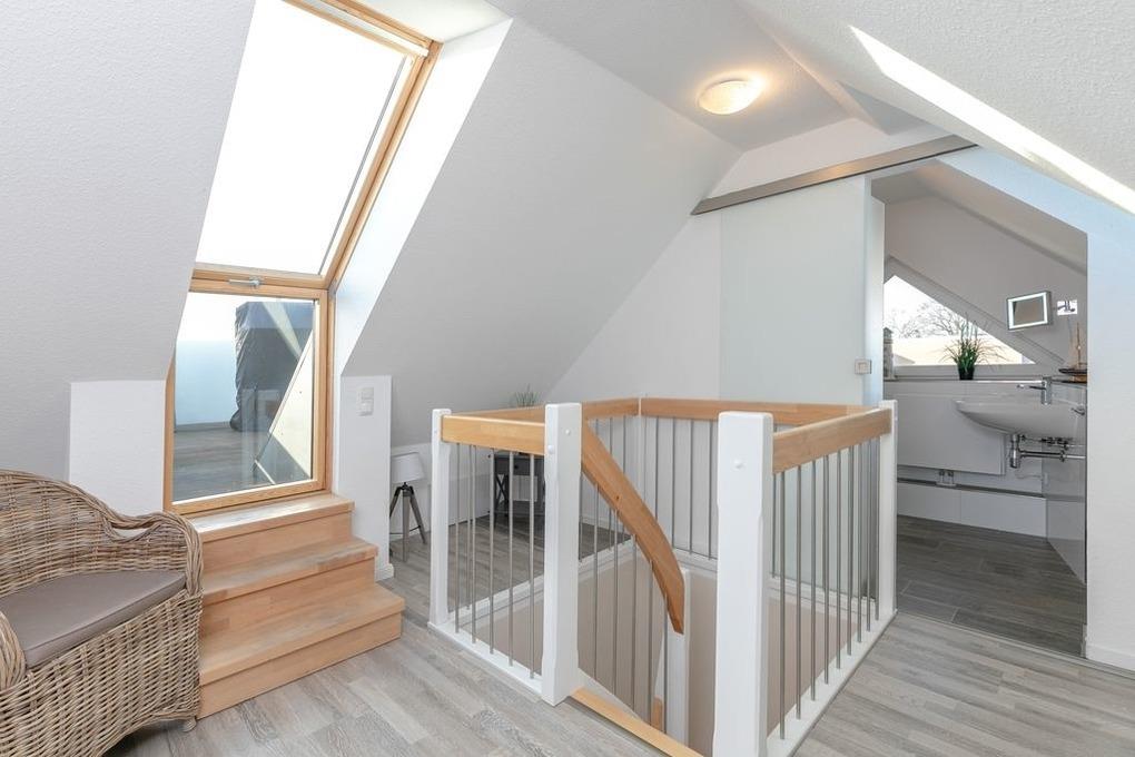 Eine Treppe führt schließlich in den oberen Bereich Ihres Feriendomizils, wo sich ein drittes Schlafzimmer mit 2 Einzelbetten (je 90 x 200cm) befindet. Ein weiteres Badezimmer mit WC, Waschbecken und Badewanne sorgt für einen frischen Start in den Tag. Und nun zu einem weiteren Highlight - ein kleiner Treppenaufgang führt direkt auf eine atemberaubende Dachterrasse mit schönstem Panoramablick über Grömitz, hochwertigen Lounge Möbeln und gemütlichem Strandkorb.