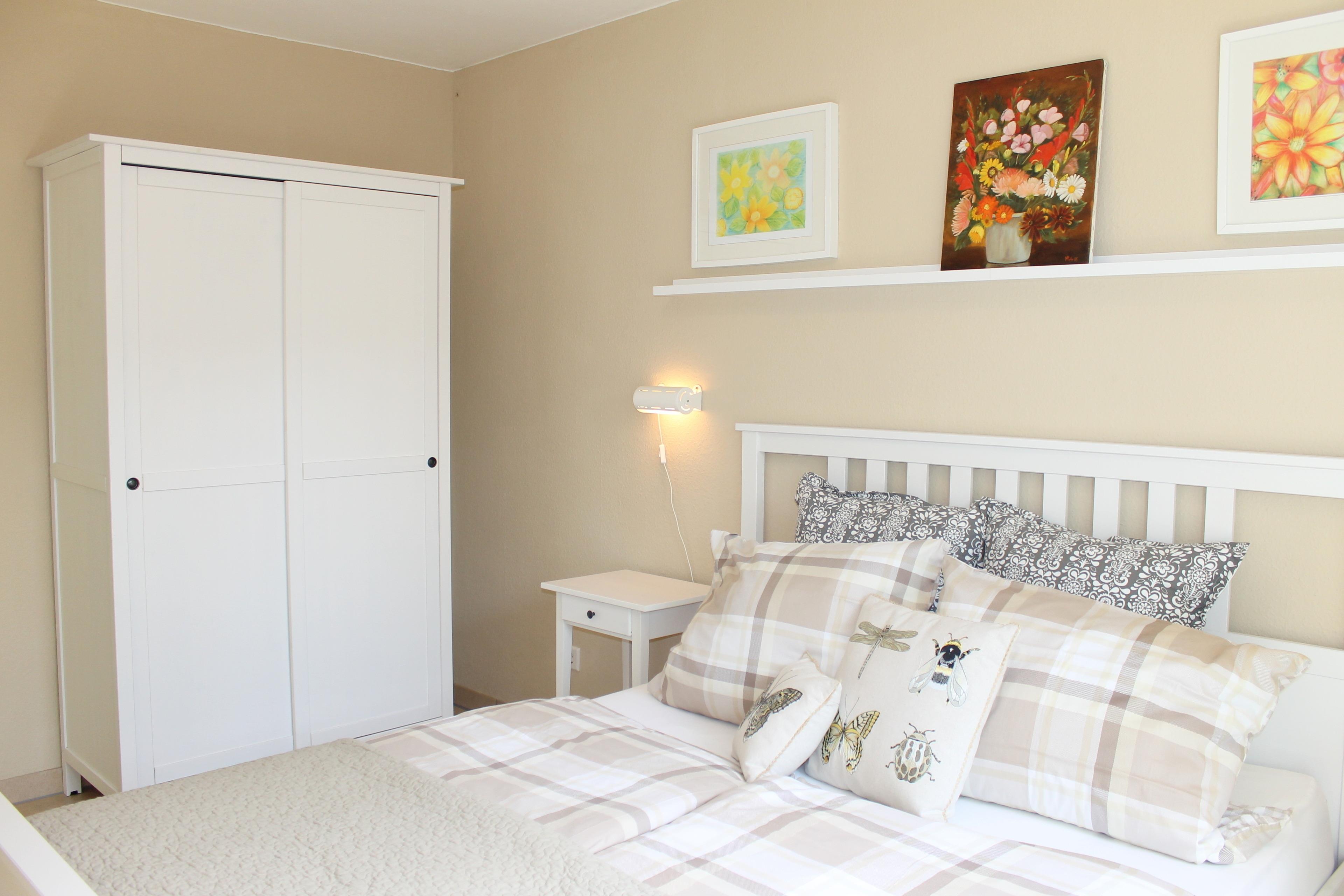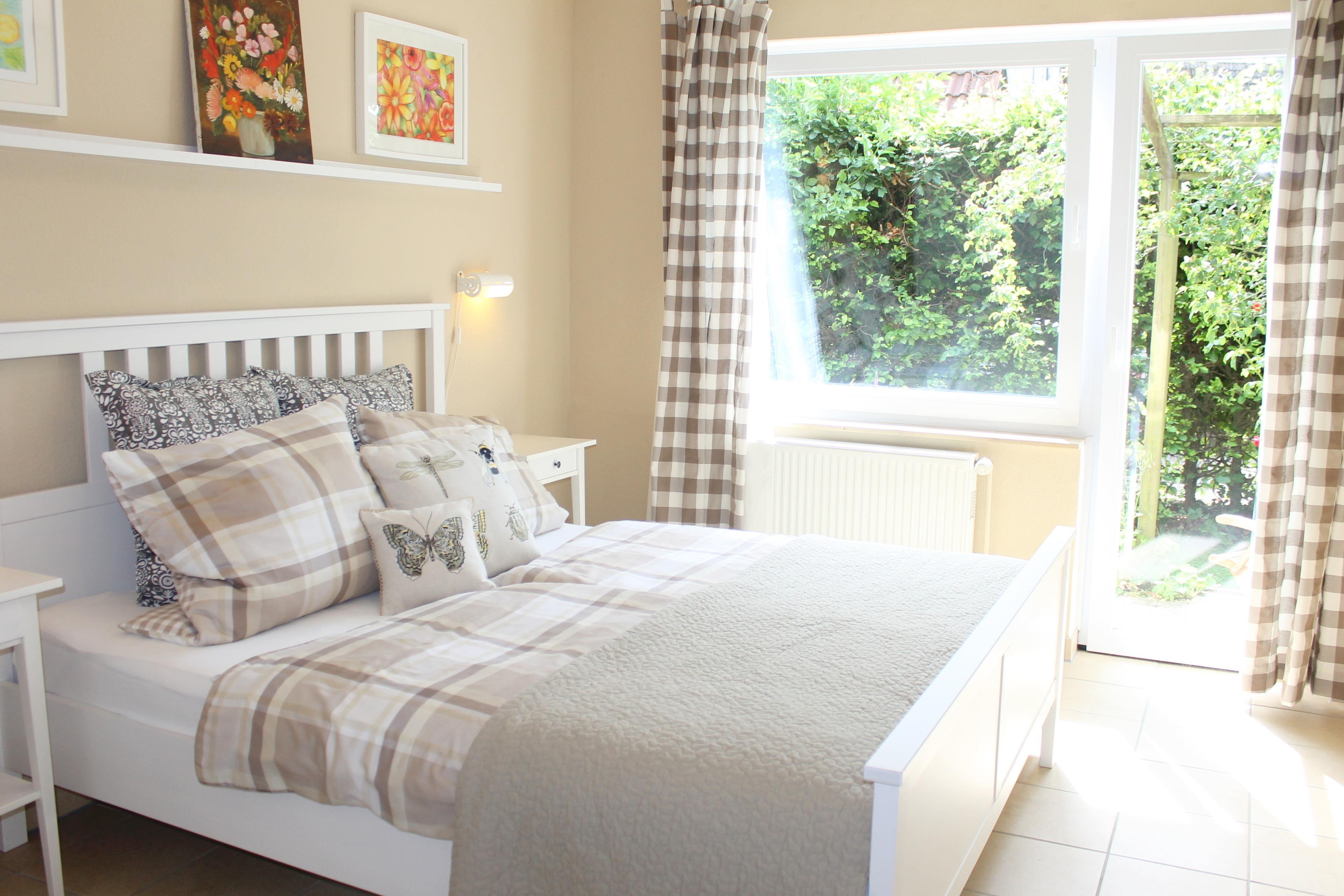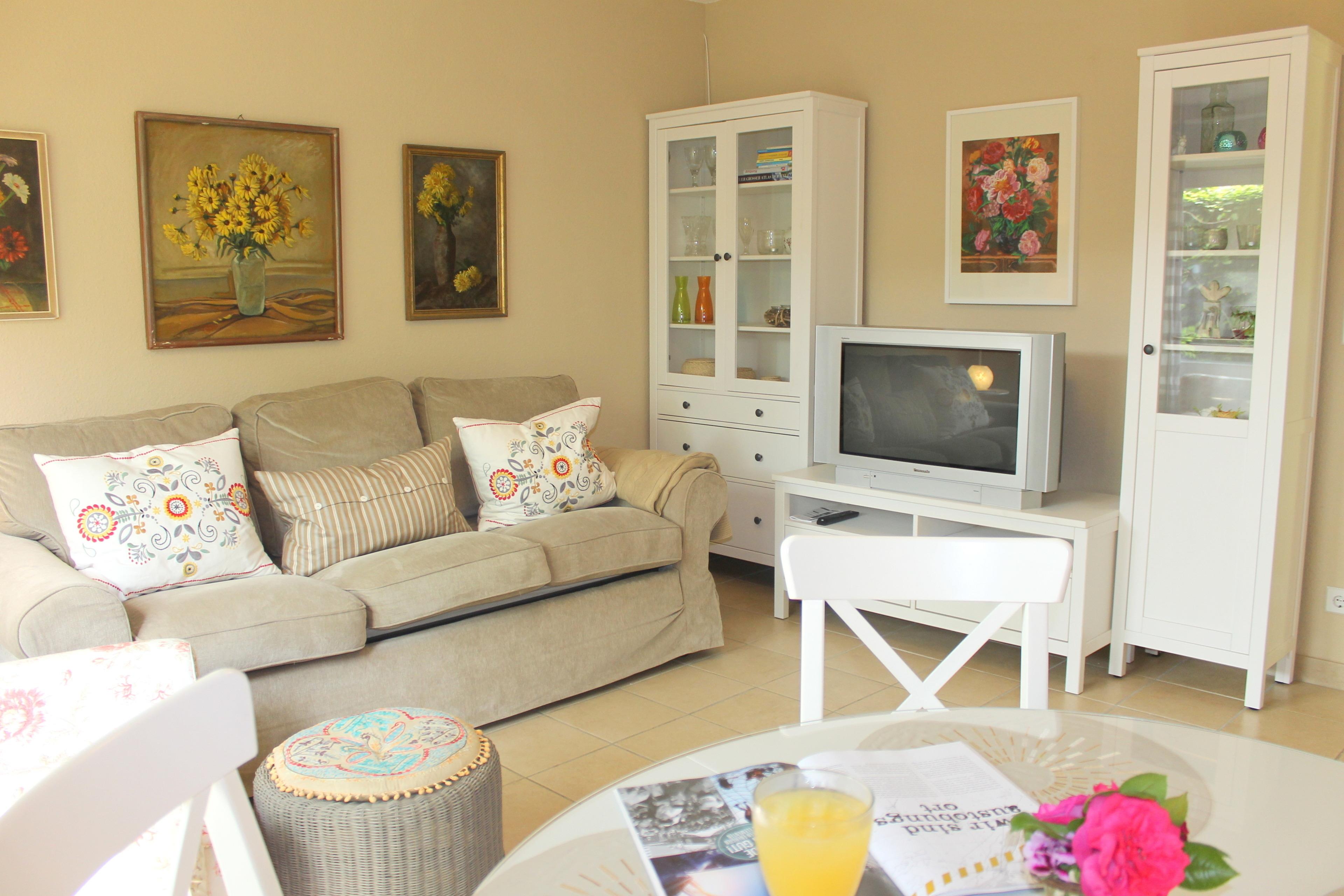 Die Wohnfläche der ca. 45m² Nichtraucher-Wohnung in bevorzugter Lage verteilt sich auf ein Wohn- / Esszimmer, eine separate Küche sowie auf einen Flur, ein Badezimmer und auf ein Schlafzimmer. Der Wohnbereich ist mit einem gemütlichen Sofa (Schlaffunktion - 180 x 200 cm), einem Sessel sowie einer TV- Wand und einem Esstisch versehen, ein TV sowie eine Stereoanlage sind vorhanden. Vom Wohnraum aus gelangen Sie auf die möblierte Sonnenterrasse. Das ruhig zum Garten gelegene Schlafzimmer verfügt über ein Doppelbett ( 160 x 200 cm), zwei Nachttische sowie über einen Kleiderschrank, auch von hier gelangen Sie auf die Terrasse. Die separate Küche ist u.a. mit Geschirrspülmaschine, Backofen, 4 Kochfelder, Kaffeemaschine und weiteren Küchengeräten versehen. Das Tageslicht-Badezimmer verfügt über eine Dusche, WC sowie einen Waschtisch. Vor dem Eingangsbereich befindet sich eine überdachte Sitzmöglichkeit. Im Garten befindet sich eine zusätzliche Sitzgelegenheit sowie ein Grillplatz und zwei Sonnenliegen.