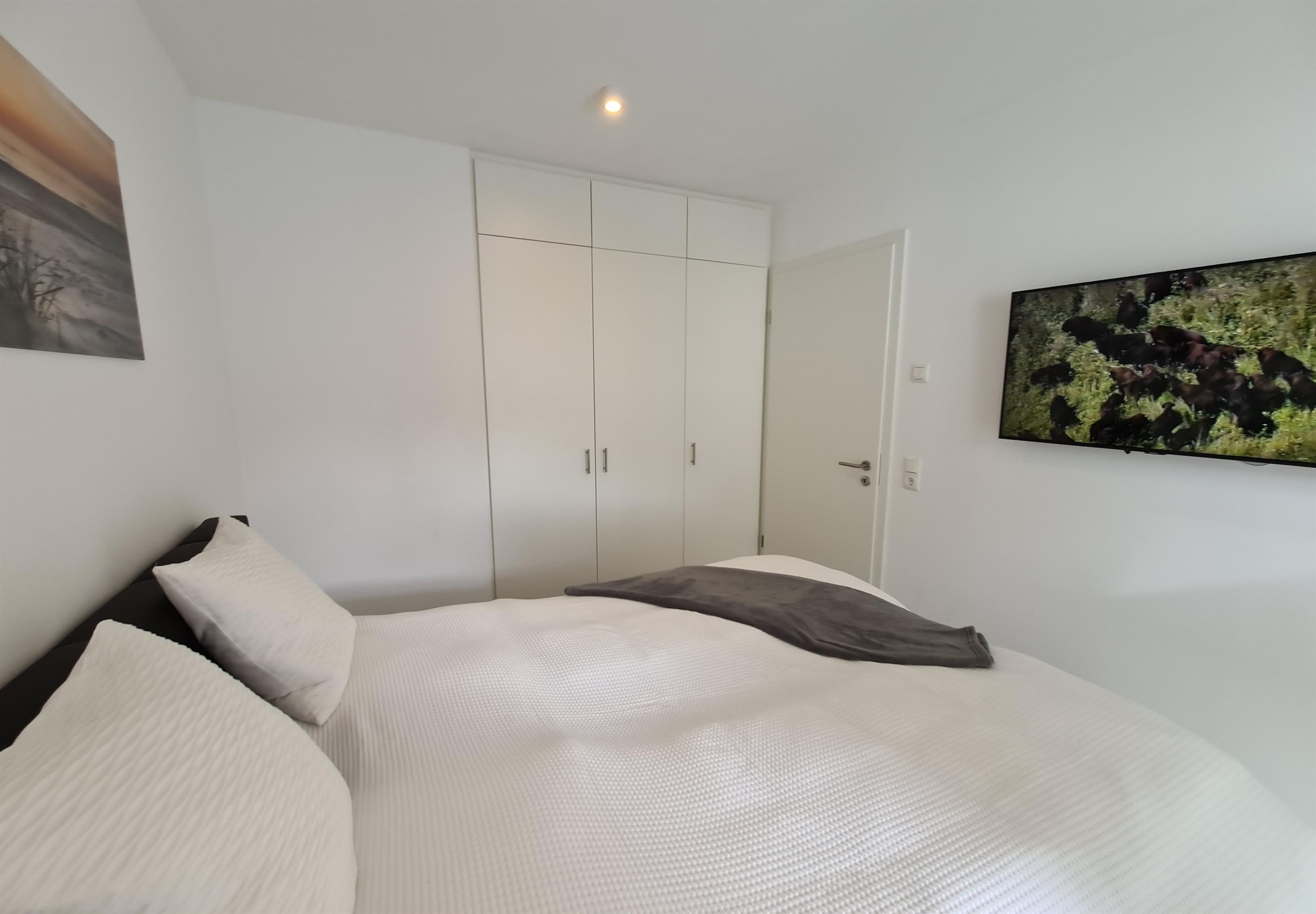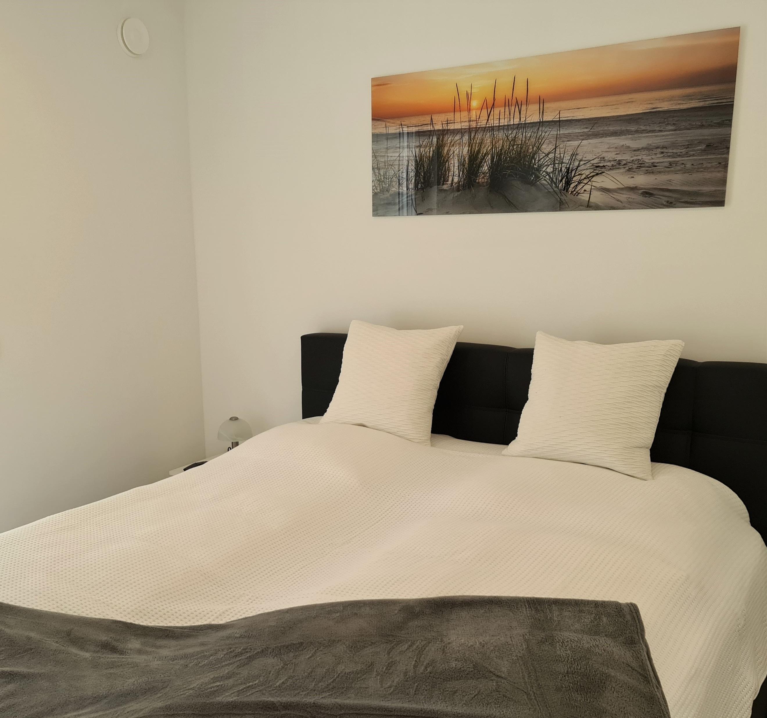 Das Schlafzimmer verfügt über ein Boxspringbett 180x200 cm, Nachttischen, einem Kleiderschrank und einem weiteren Smart-TV. Auch vom Schlafzimmer aus gelangen Sie auf die Terrasse.
