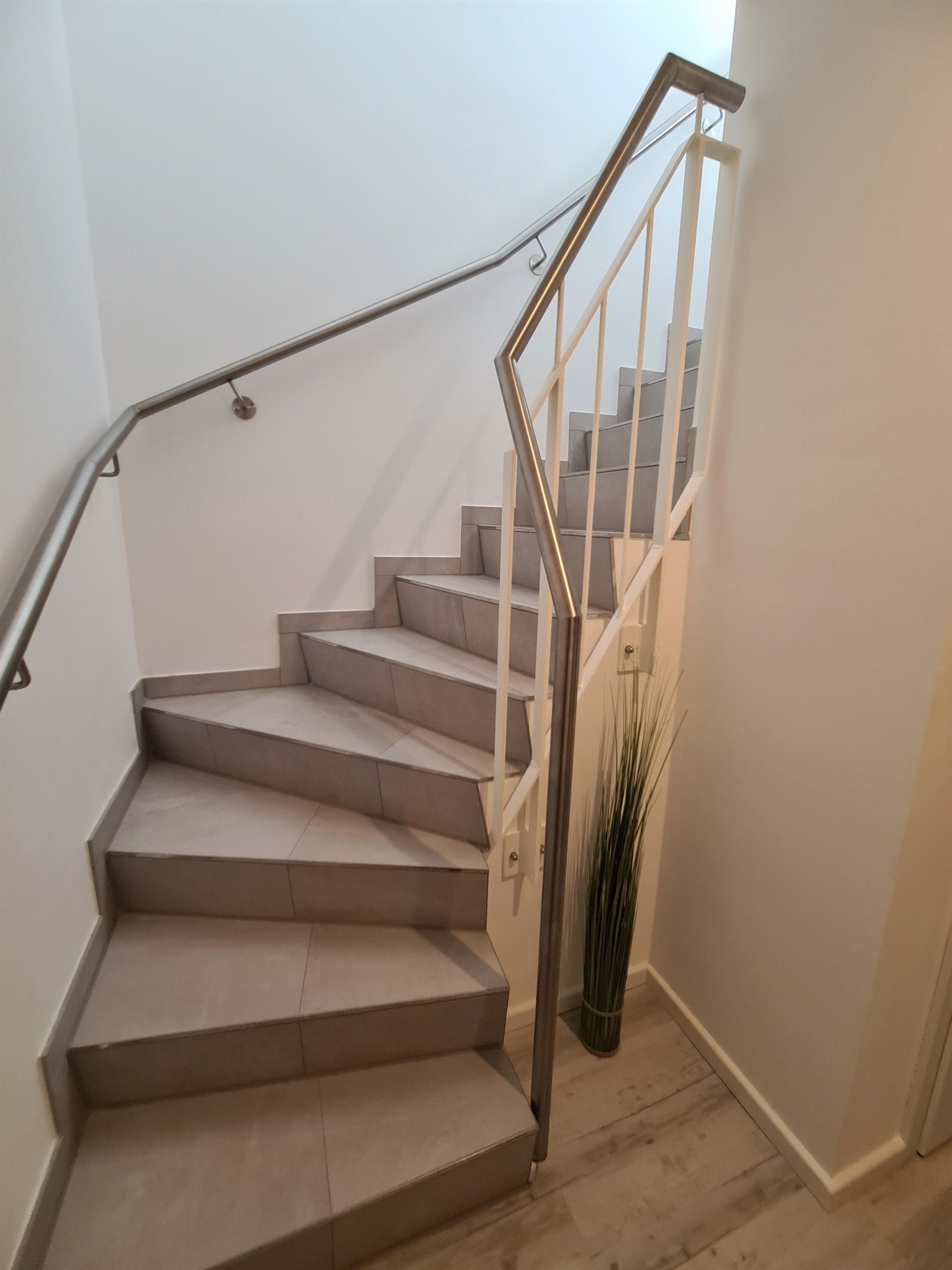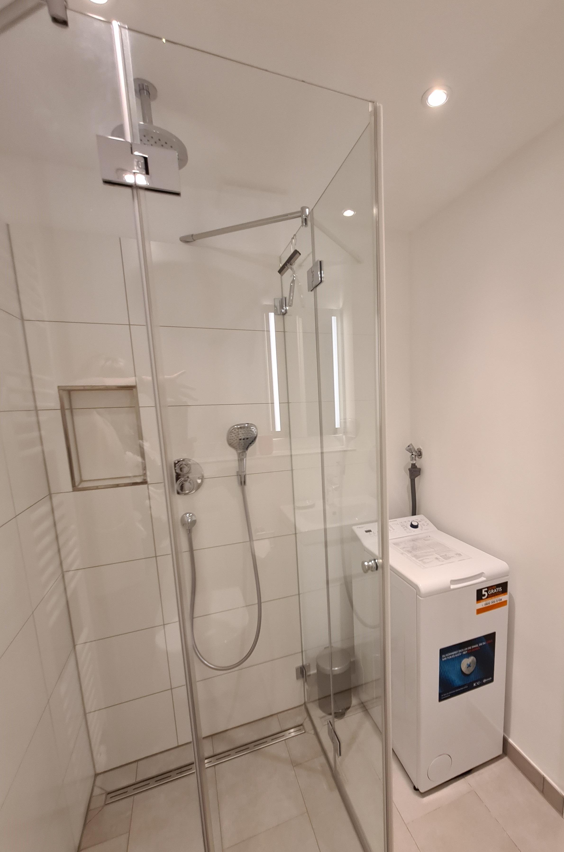 Vom Wohnzimmer abgehend führt Sie eine Treppe in den Souterrainbereich. Hier befindet sich das 2. Schlafzimmer, ausgestattet mit zwei einzelnen Boxspringbetten, die zu einem Doppelbett zusammen geschoben werden können , zwei Nachttischen, einem geräumigen Kleiderschrank sowie einem Smart-TV. Außerdem gibt es hier ein weiteres Duschbad mit Walk-in-Dusche, WC, Waschbecken und Haartrockner.