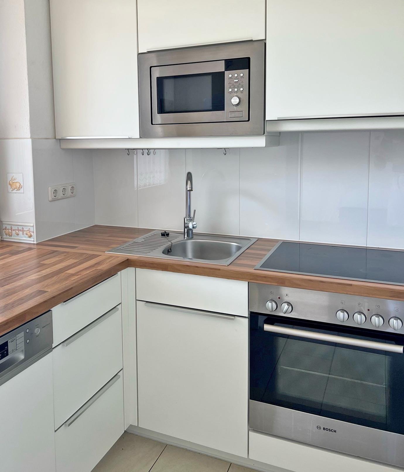 Hochwertige, komplett ausgestattete moderne Küche mit 4 Platten Cerankochfeld, Backofen, Kühlschrank, Gefrierschrank, Spülmaschine und Mikrowelle. Außerdem stehen eine Kaffeemaschine, ein Toaster und ein Wasserkocher zur Verfügung.