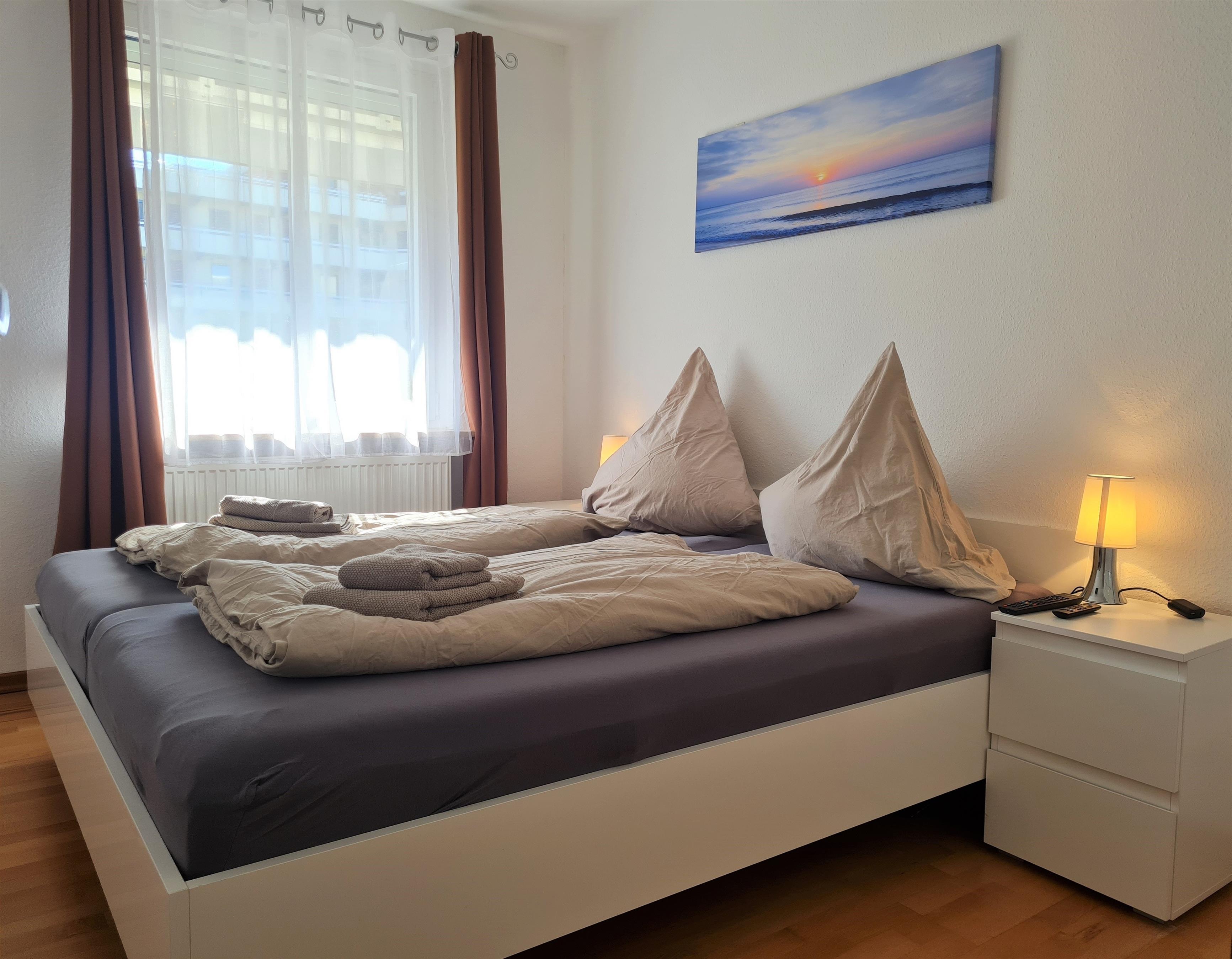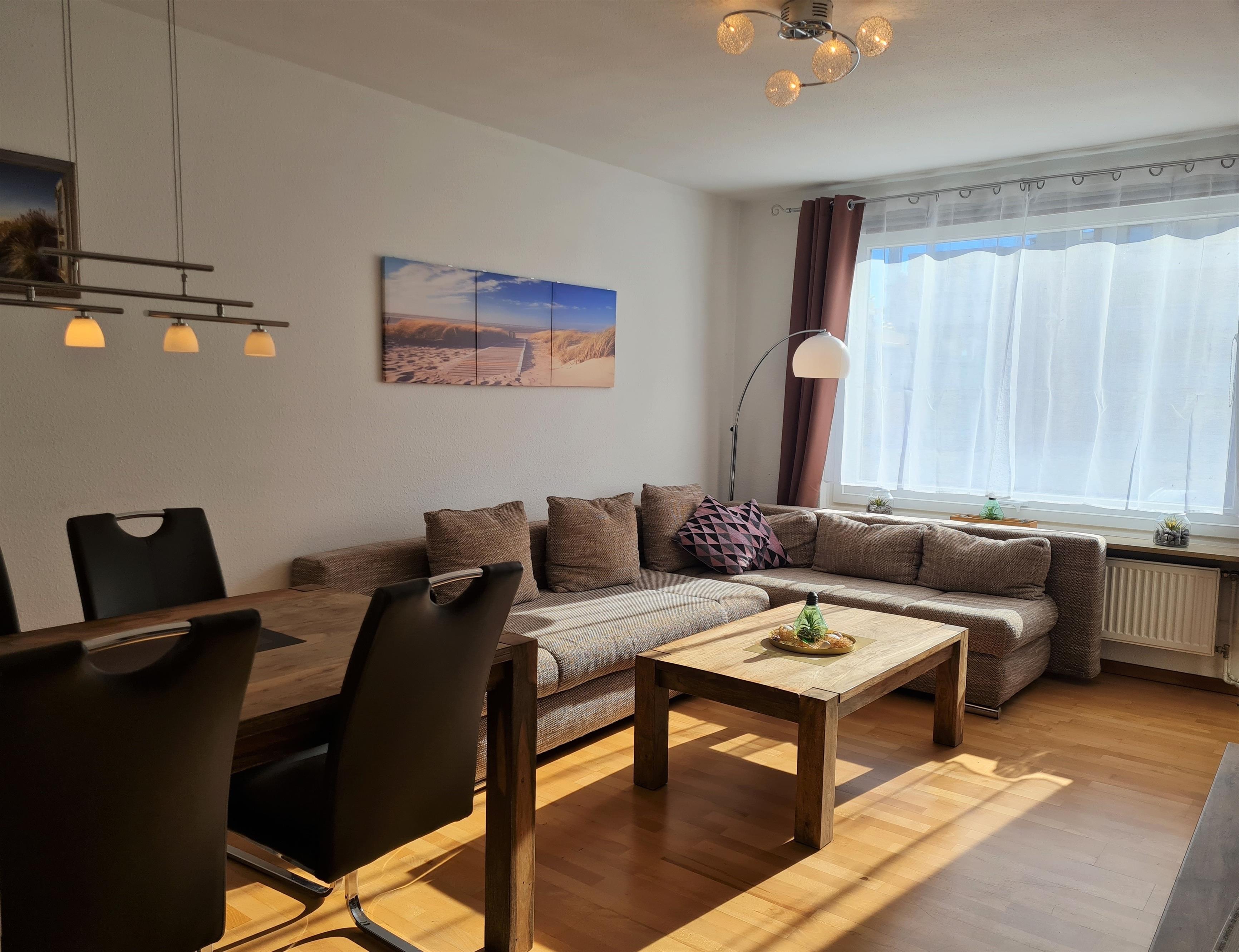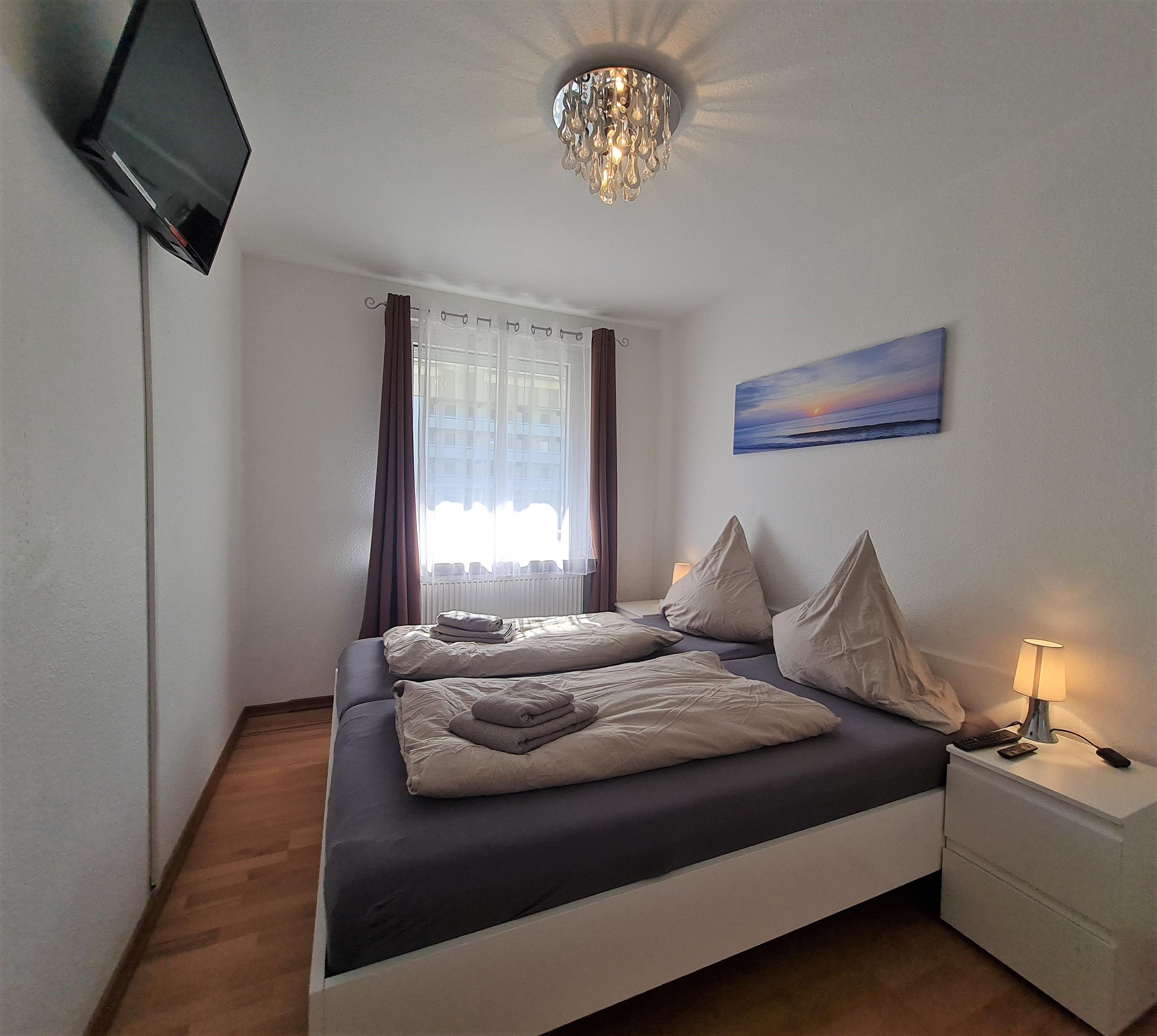 Die Wohnfläche der ca. 43 m² großen Ferienwohnung verteilt sich auf ein modernes Wohn- und Esszimmer, ausgestattet mit sehr bequemen Boxspring- Couches und Durchreiche zur separaten nagelneuen und stylischen Küche mit allem drum und dran, einen Flur, ein schickes Badezimmer mit großer, Doppel- Regendusche mit niedrigem Einstieg und Handtuchheizung, Schminkspiegel usw., sowie auf ein nettes separates Schlafzimmer mit komfortablen Doppelbett ohne Fußteil & neuen, sehr bequemen Boxspringmatratzen (180 x 200 cm / getrennte Matratzen), extra Flachbild- TV mit Amazon Fire TV & Netflix Zugang (Bitte haben Sie für die Freischaltung Ihre eigenen Anmeldedaten dabei) und festinstalliertem Safe im Kleiderschrank. (Den Schlüssel für den Safe erhalten Sie auf Anfrage von der Wohnungsverwaltung)