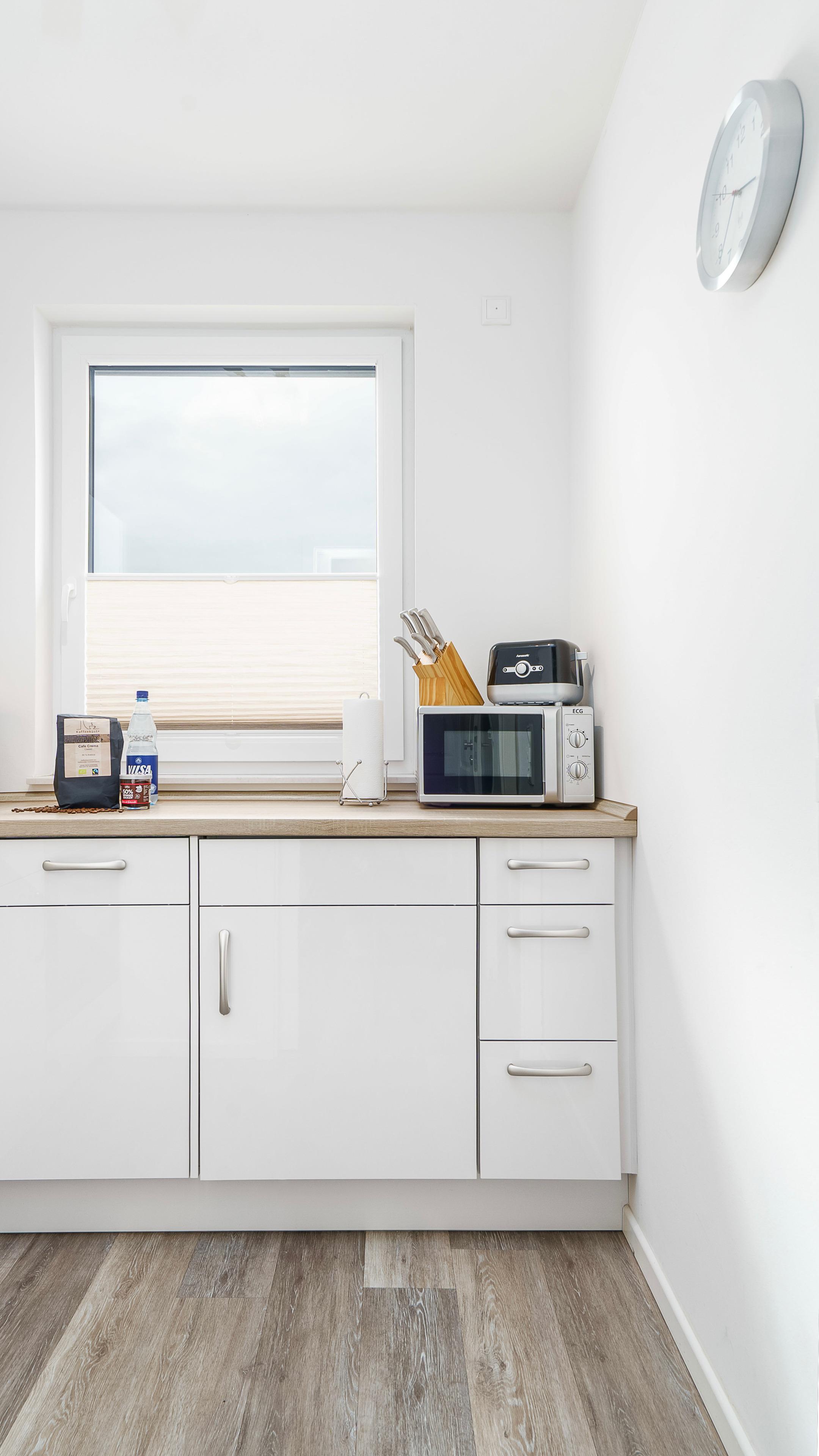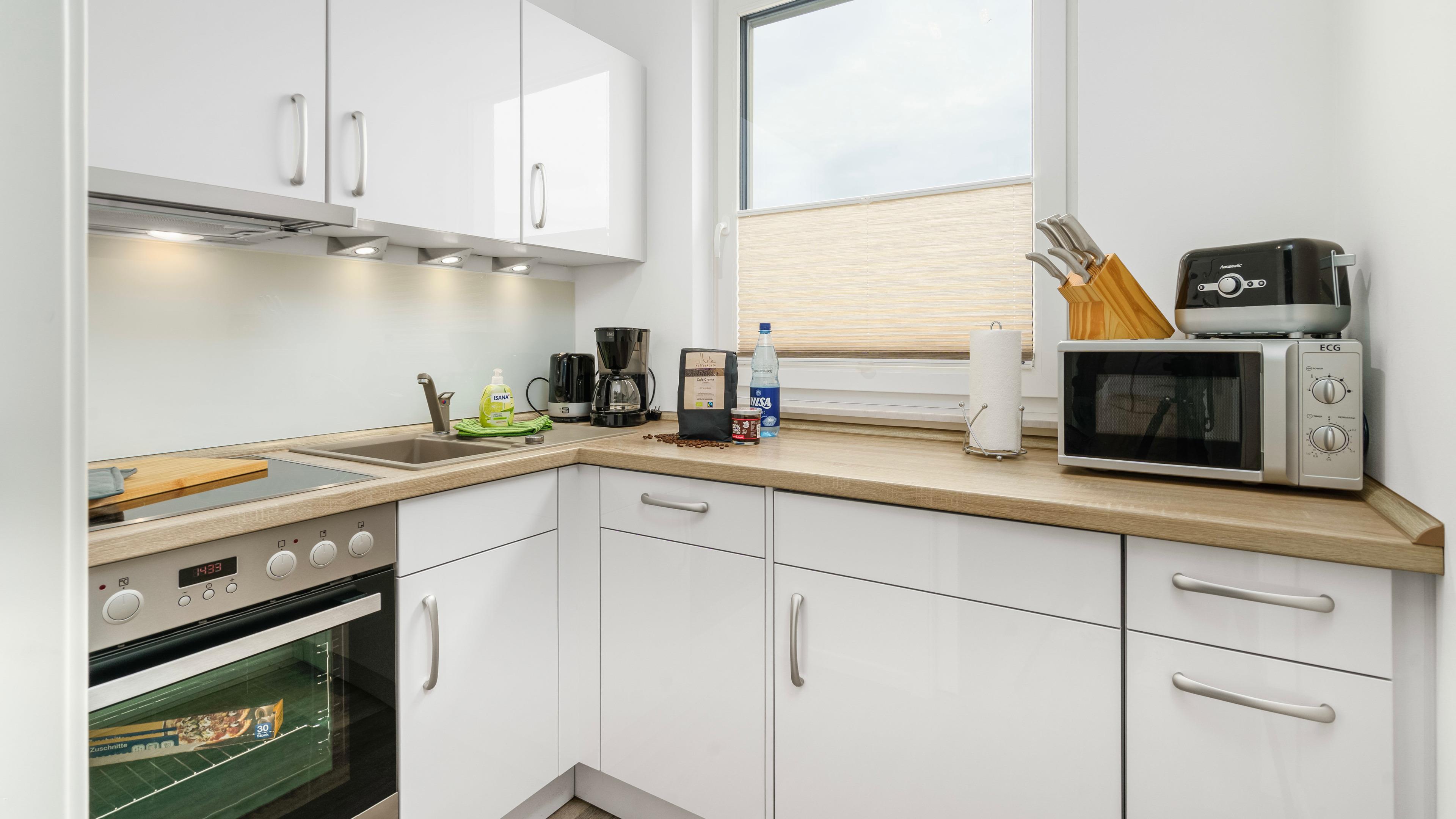 Die separate, hochwertige Küche ist mir einem Elektroherd mit Ceranfeld und Backofen, Spülmaschine, Kaffeemaschine, Toaster, Mikrowelle und vielem mehr ausgestattet.