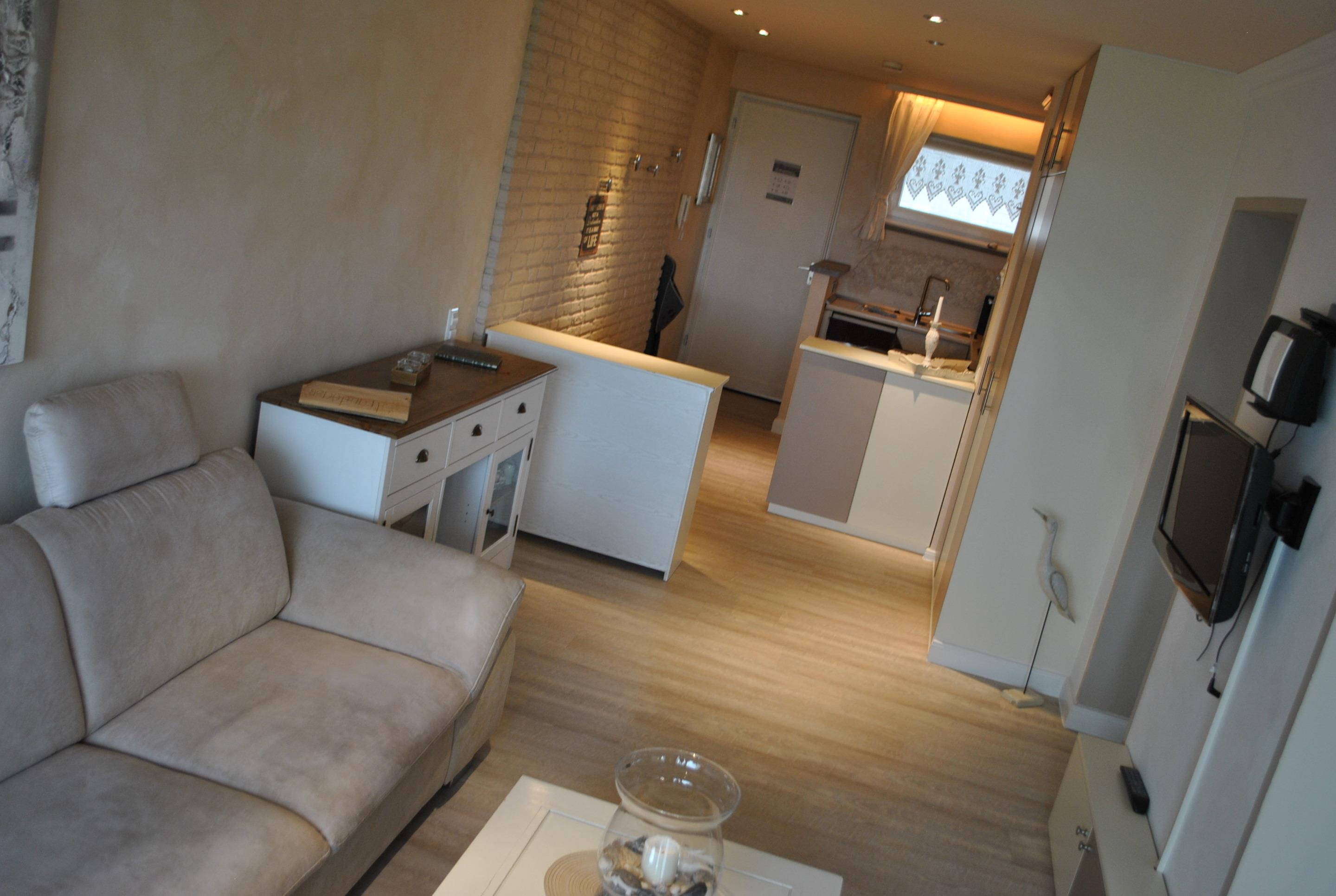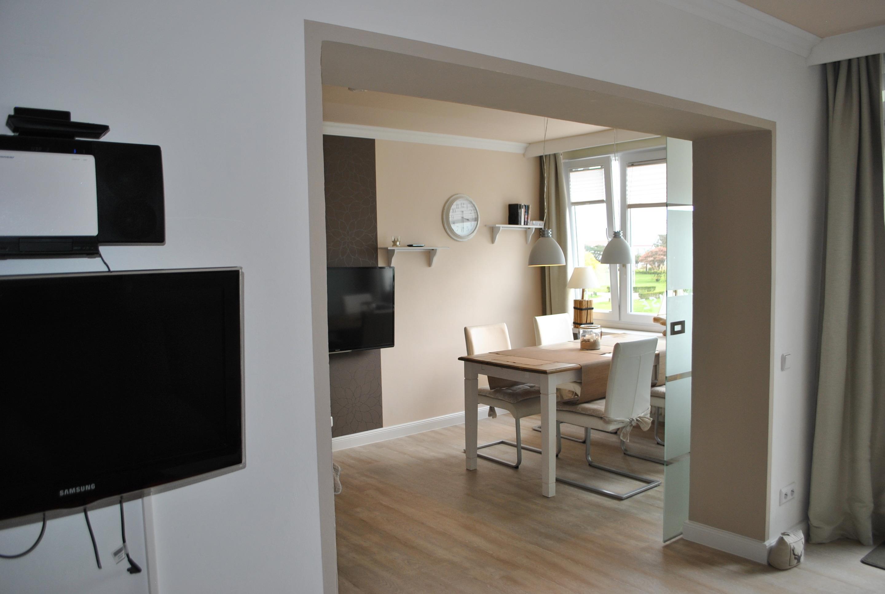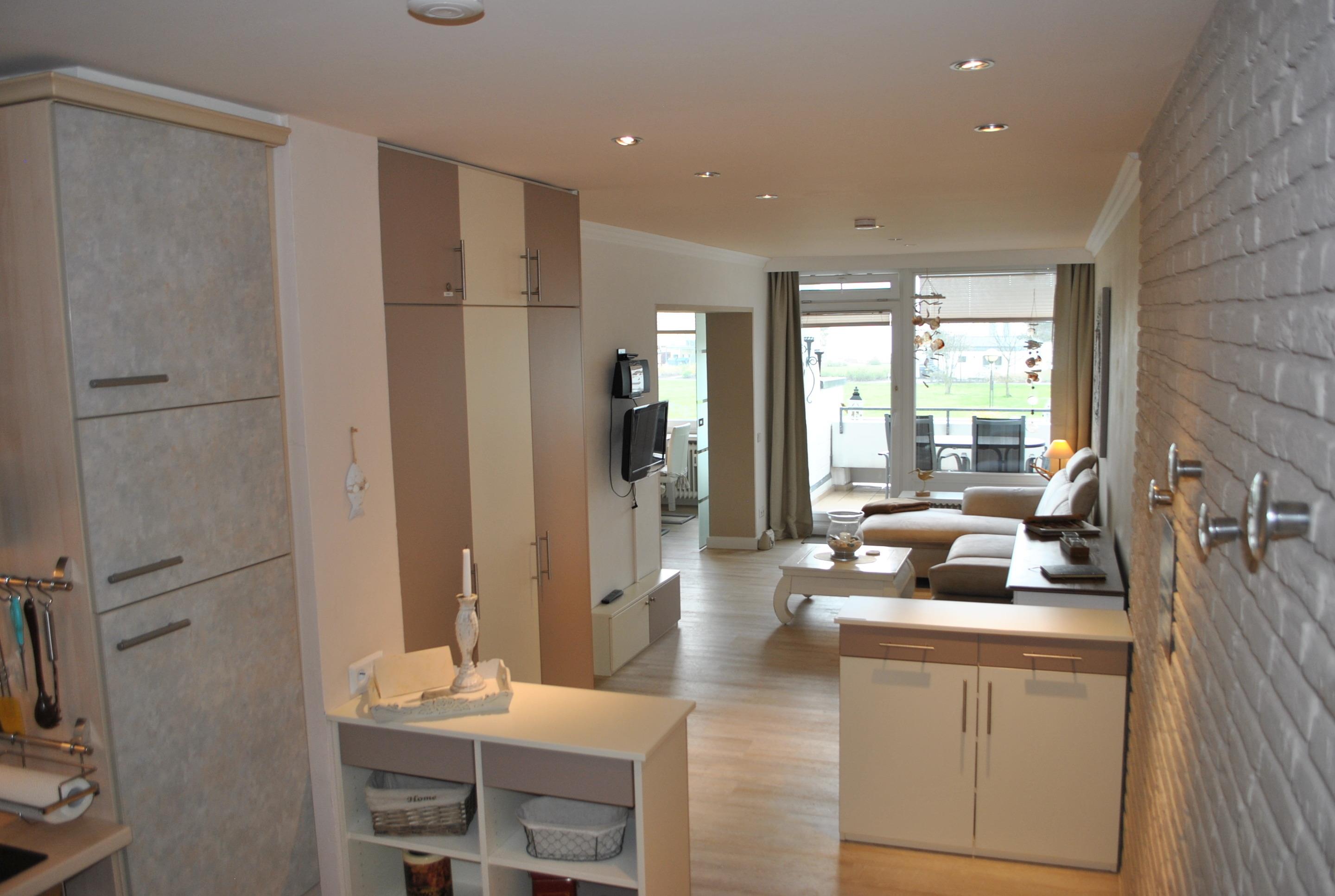Die lichtdurchflutete "Strandoase" (Nr. 2.08) liegt in der 2. Etage (Aufzug vorhanden) und bietet viel Platz für bis zu 4 Personen. Die Wohnfläche der ca. 58 m² großen Ferienwohnung verteilt sich auf eine offene Küche - Herd (Ceranfeld) mit Backofen, ein Kühlschrank mit Gefrierfach, ein Geschirrspüler und div. Kleinküchengeräte sowie dem angrenzenden großzügigen Wohnzimmer. Vom Wohnzimmer aus haben Sie Zugang zum möblierten Seeblickbalkon und den Esszimmerbereich - mit Blick auf `s Meer. Der Schlafbereich (1,60er x 2,00m Doppelbett mit Boxspringmatratzen) ist durch eine Glasschiebetür zum Wohnzimmer getrennt, sodass immer ein wohliger Rückzugsort geboten ist. Des weiteren verfügt die Wohnung über ein weiteres, separates Schlafzimmer mit einem Etagenbett (90 x 2 m) für 2 Erwachsene oder Kinder. In diesem Zimmer kann bequem auch ein Kinderreisebett zusätzlich aufgestellt werden, dass bei Bedarf kostenlos zur Verfügung gestellt wird. Die Wohnung "Strandoase" ist mit kostenfreiem WLAN 3 Fernsehgeräten inkl. 1 DVD-Player ausgestattet, so dass auch bei schlechtem Wetter im Urlaub ausgewählte Filme oder Sportsendungen zum Entspannen einladen! Das schöne Badezimmer ist mit einer ebenerdigen Dusche von 1,10m x 0,90m und einem geräumigen Waschtisch ausgestattet.