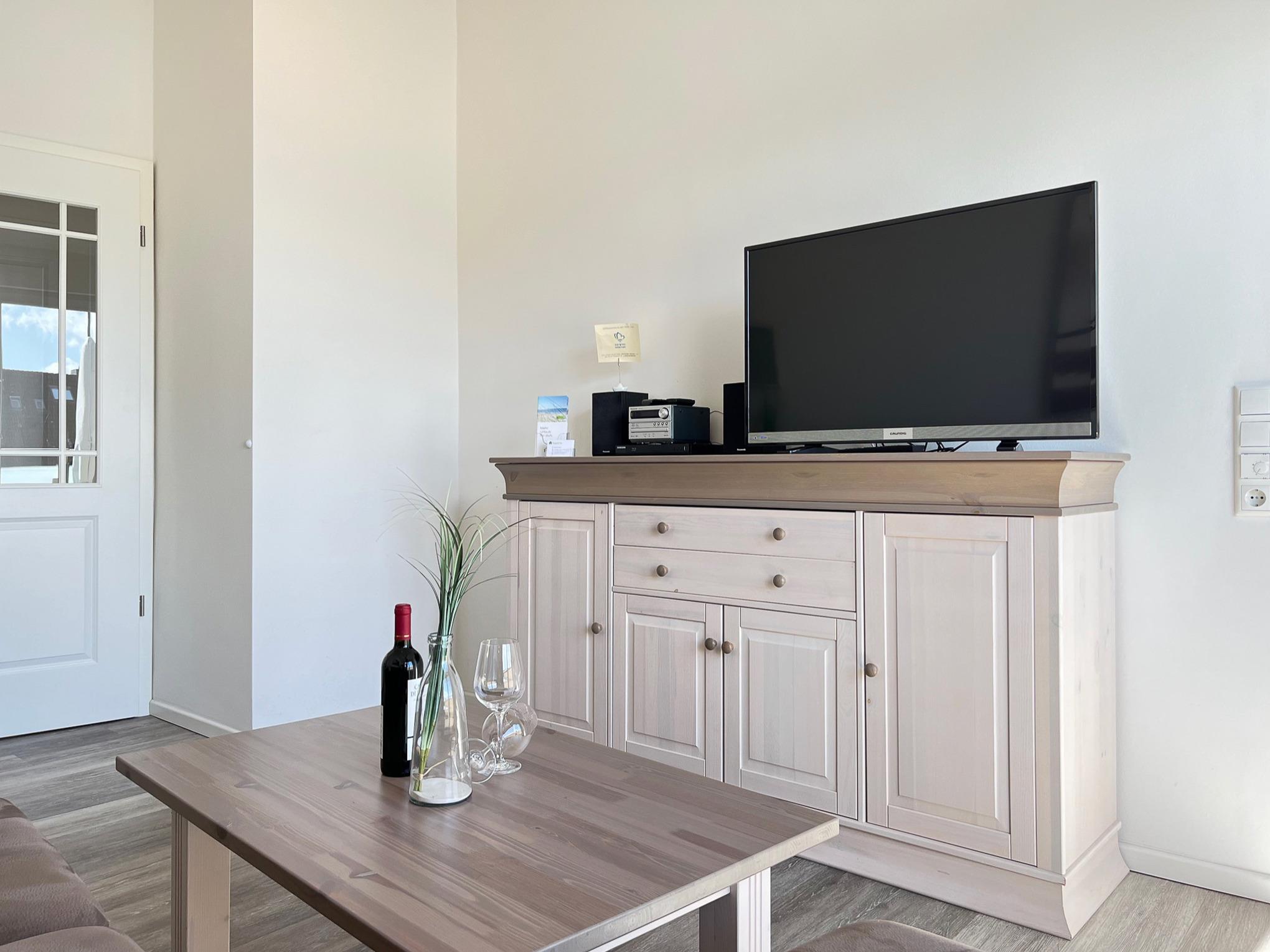 Vom Flur aus gelangt man in das helle und sonnige Wohn- und Esszimmer (mit Flachbild-TV, Hifi-Anlage und kostenlosem Internetzugang). Durch das Wohnzimmer geht es auf die 15 qm große Süddachterrasse. Eine gemütliche Sitzecke und Sonnenliegen laden zum Ausspannen ein.