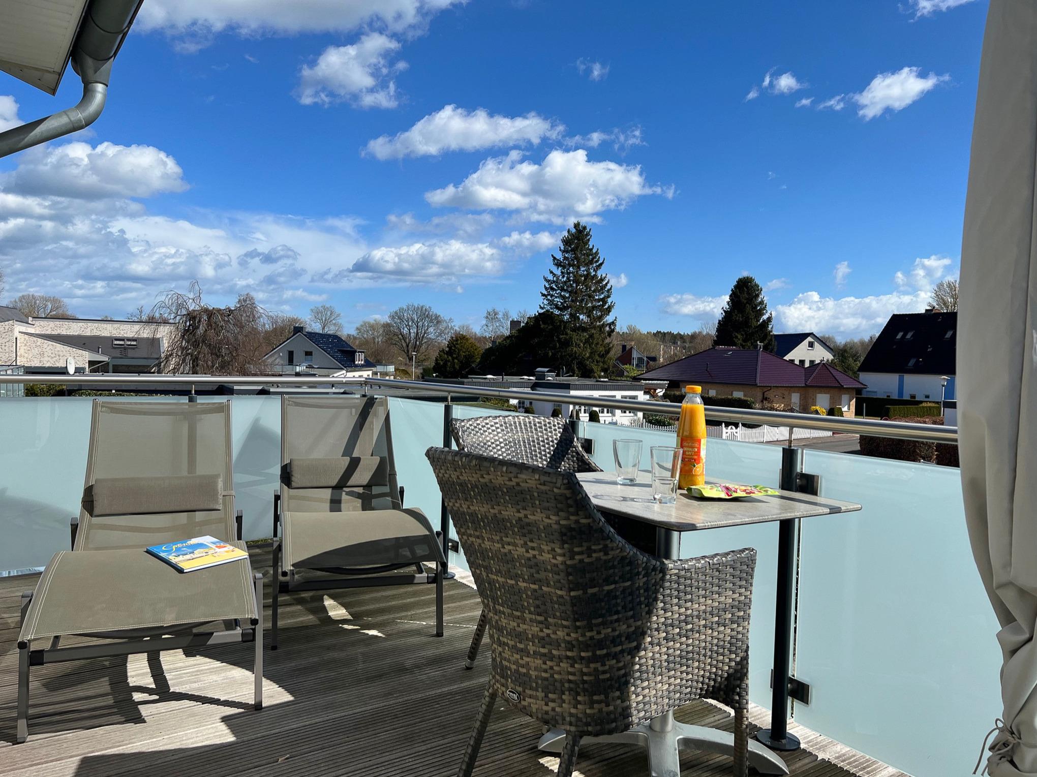 Modernes Sauna-Apartment mit Balkon und Strandkorb, nur 400 Meter vom Strand in Grömitz entfernt.