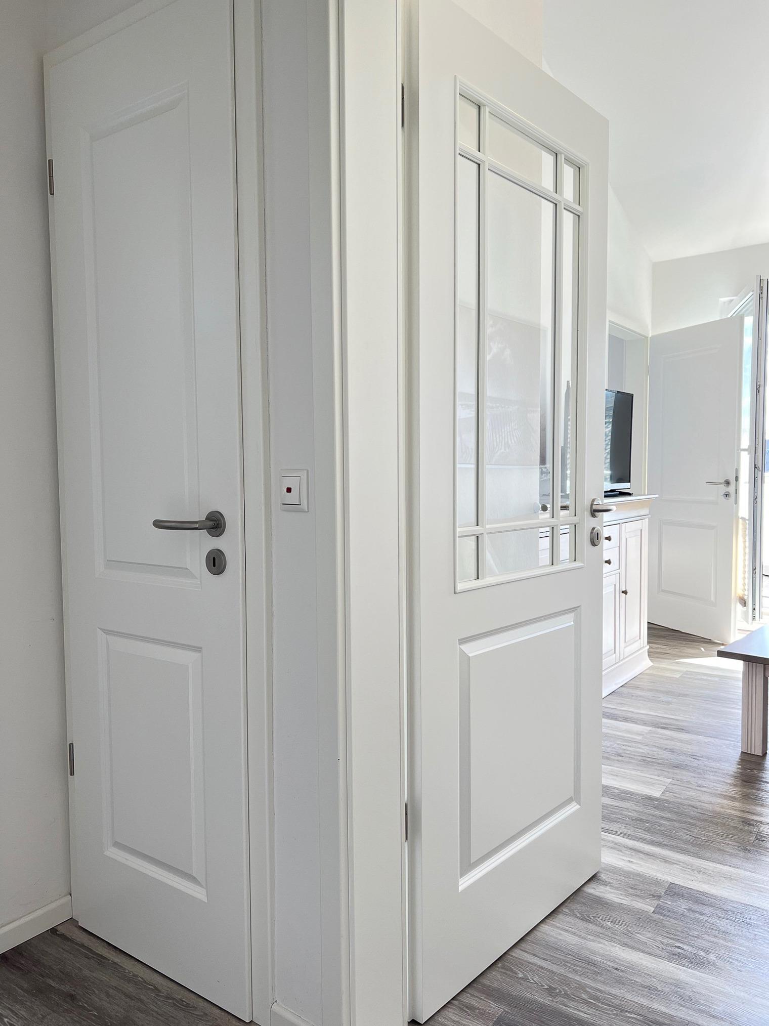 Das Schlafzimmer ist mit einem Doppelbett, Schrank und einem Flachbild-TV ausgestattet. Auch aus dem Schlafraum gelangt man direkt auf den Balkon und beginnt den Tag mit belebender Morgensonne.