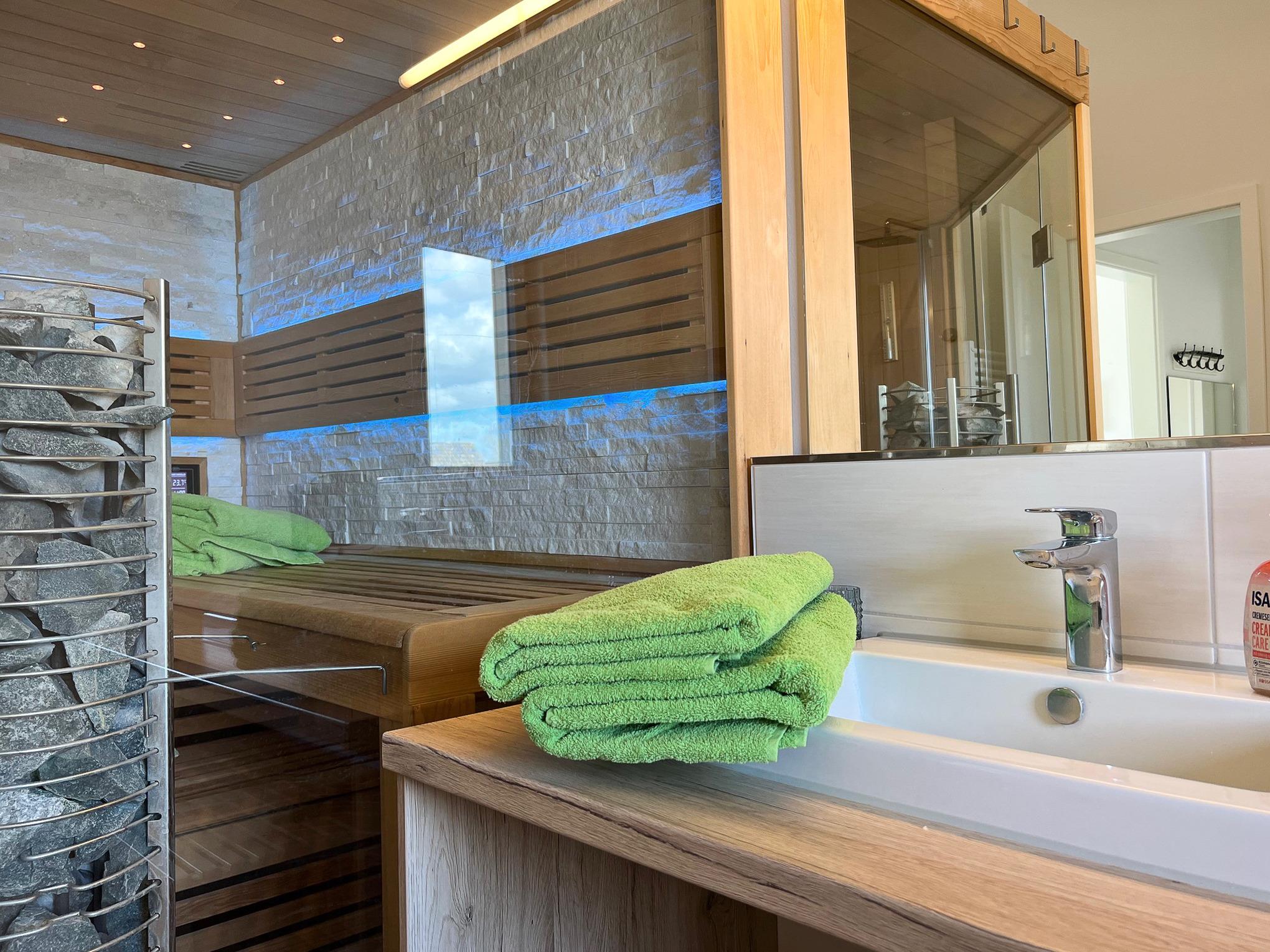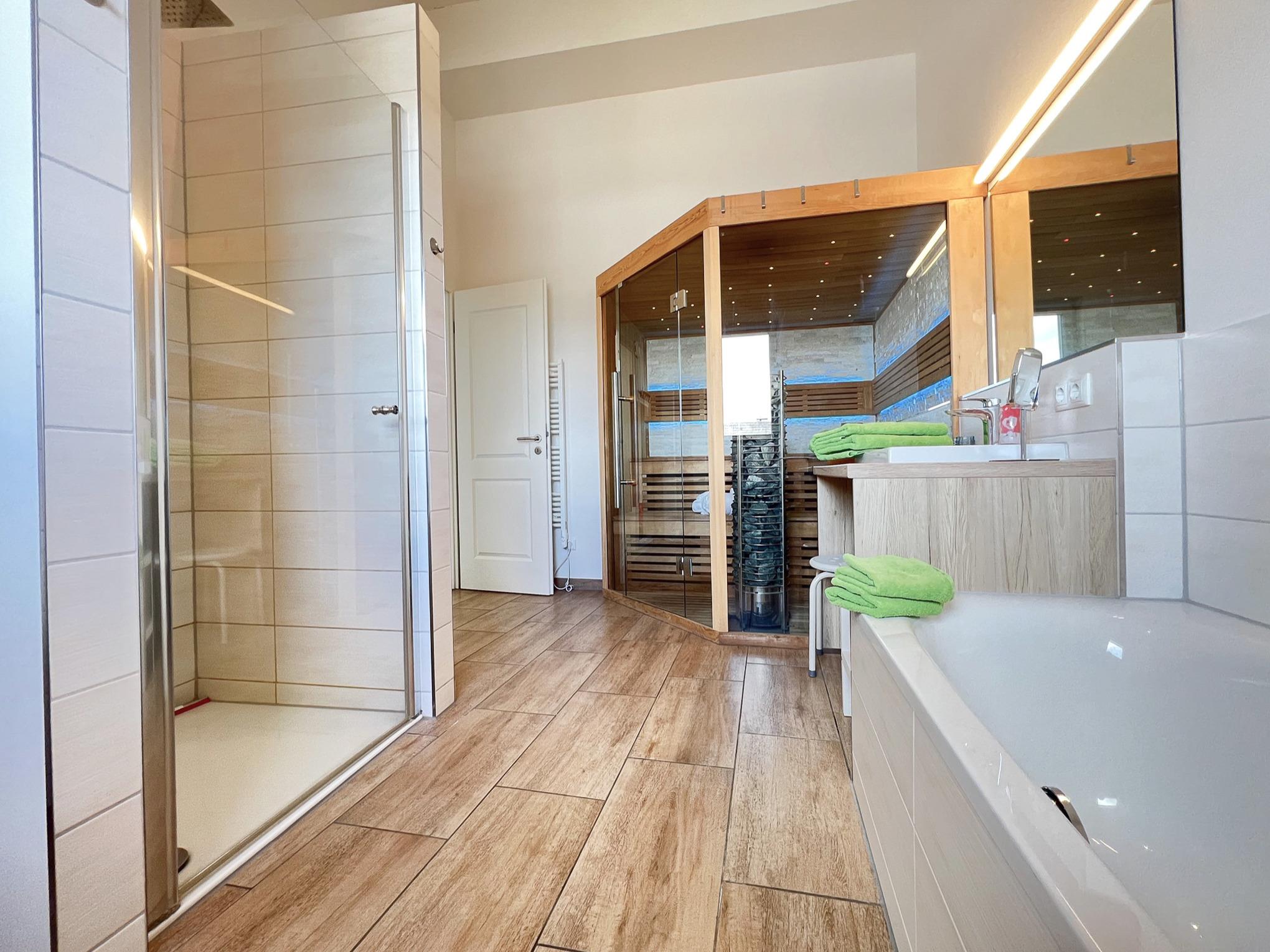 Im Badezimmer können Sie in der Wellness-Sauna mit Musik und in der Wellness-Dusche die Seele baumeln lassen.