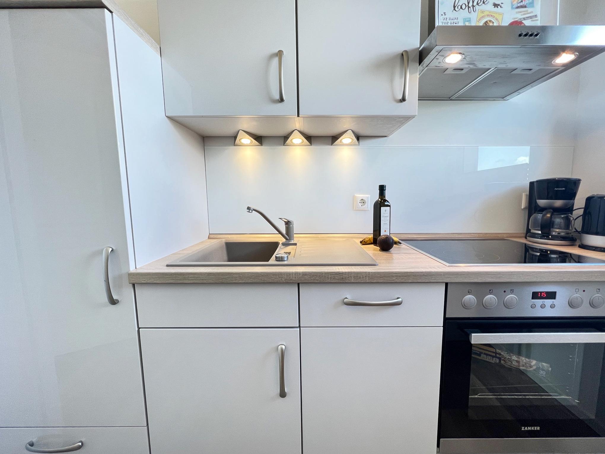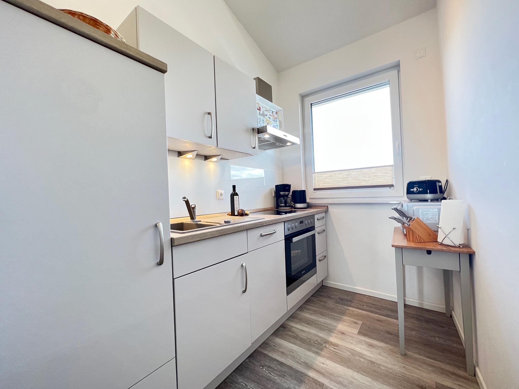 Die separate, hochwertige Küche ist mir einem Elektroherd mit Ceranfeld und Backofen, Spülmaschine, Kaffeemaschine, Toaster, Mikrowelle uvm. ausgestattet.