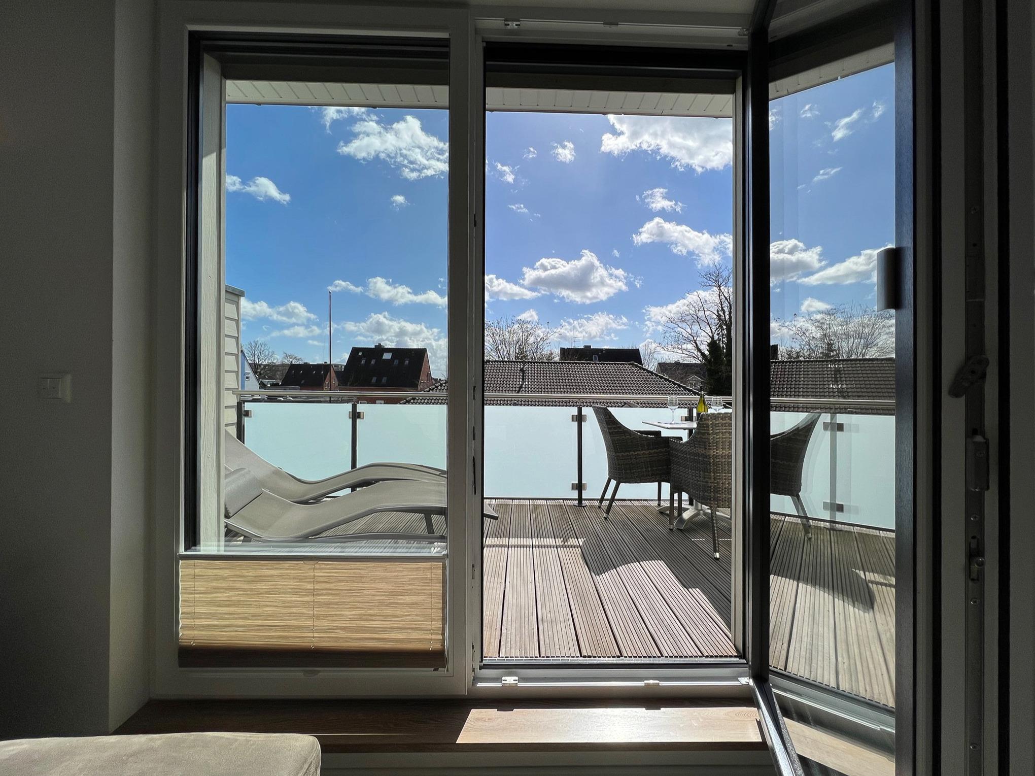 Vom Flur aus gelangt man in das helle und sonnige Wohn- und Esszimmer (mit Flachbild-TV, Hifi-Anlage und kostenlosem Internetzugang). Durch das Wohnzimmer geht es auf die 15 qm große Süddachterrasse. Eine gemütliche Sitzecke und Sonnenliegen laden zum Ausspannen ein.