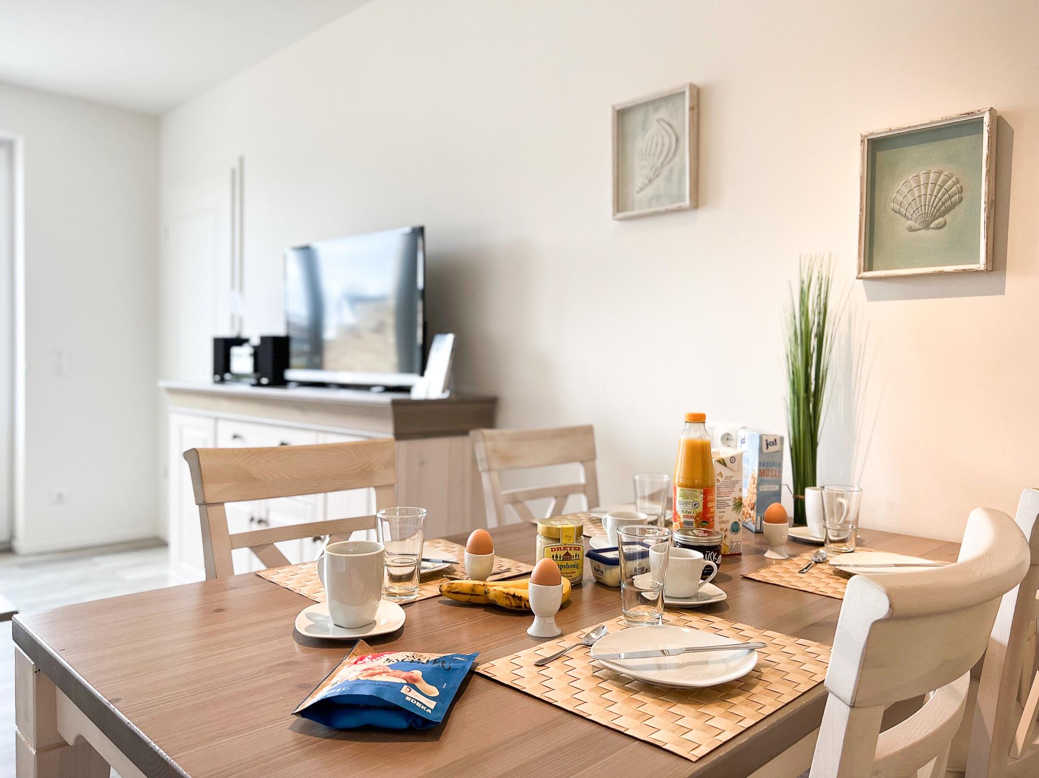 Der Wohn-/Essbereich (mit Flachbild-TV, Hifi-Anlage und kostenlosem Internetzugang) ist mit hellen modernen Möbeln ausgestattet. Von dort aus gelangt man auf die Südd-Terrasse (2 Wellnessliegen, Terrassenmöbel, Sonnenschirm).