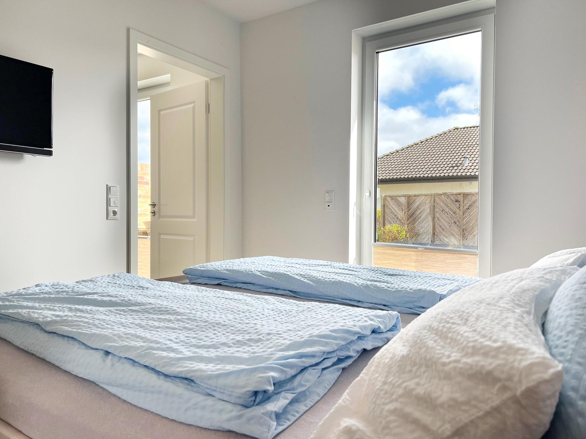 Das 1. Schlafzimmer ist mit zwei Einzelbetten (Boxspring), Schrank und einem Flachbild-TV ausgestattet. Im 2. Schlafzimmer befindet sich ein Boxspring-Doppelbett, Schrank und ebenfalls ein Flachbild-TV. Aus diesem Schlafraum gelangt man direkt auf die 15 qm große Süd-Terrasse und beginnt den Tag mit belebender Morgensonne.