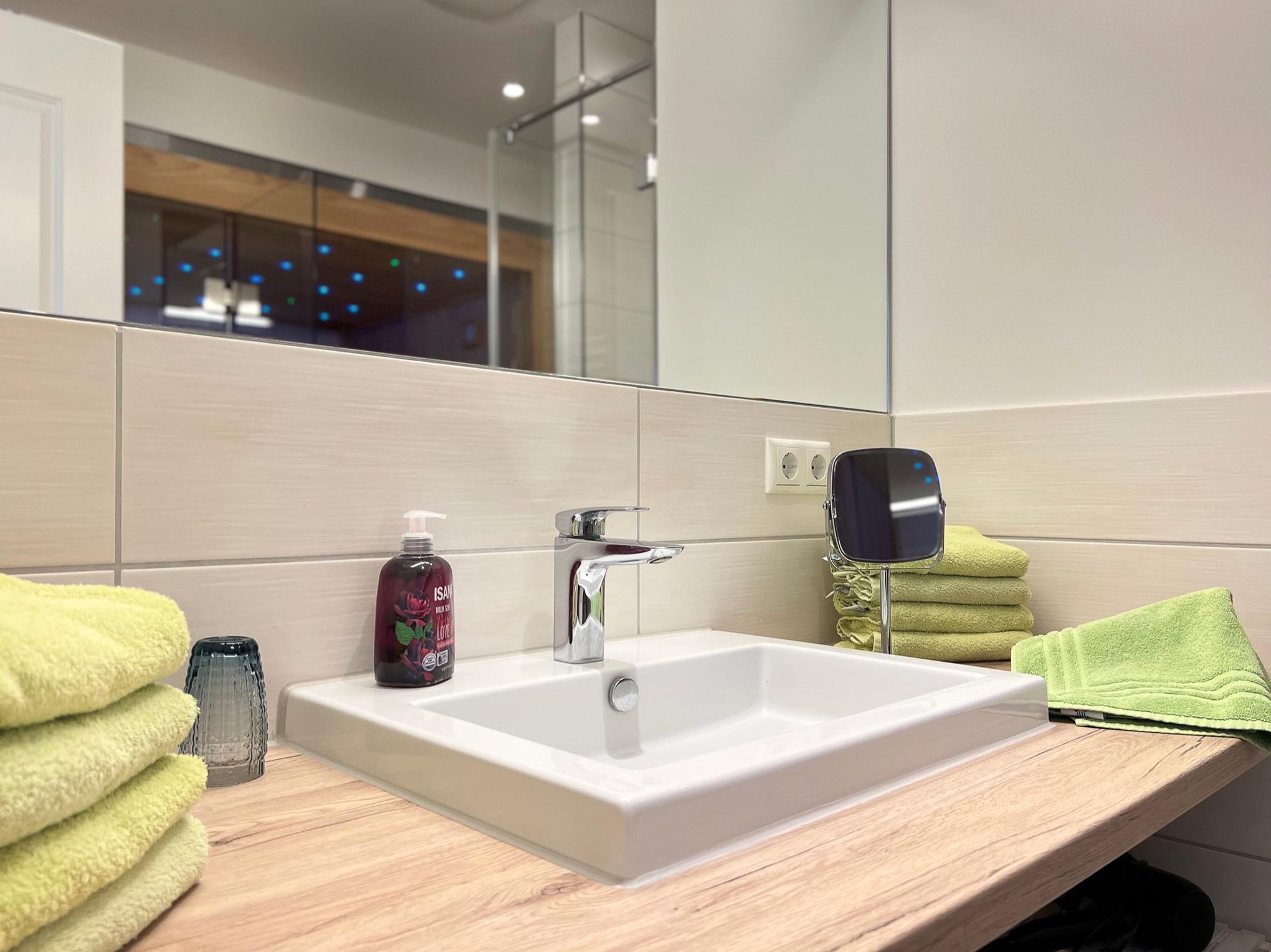 Das Badezimmer liegt zwischen den beiden Schlafräumen. Es ist eingerichtet mit einer ebenerdigen Wellnessdusche und einer Sauna. Eine Waschmaschine ist ebenfalls vorhanden.
