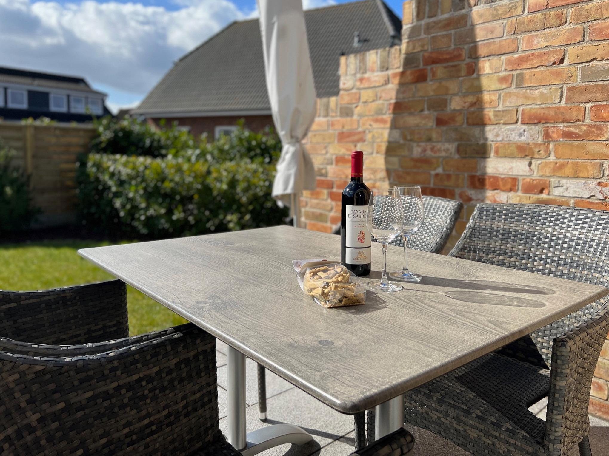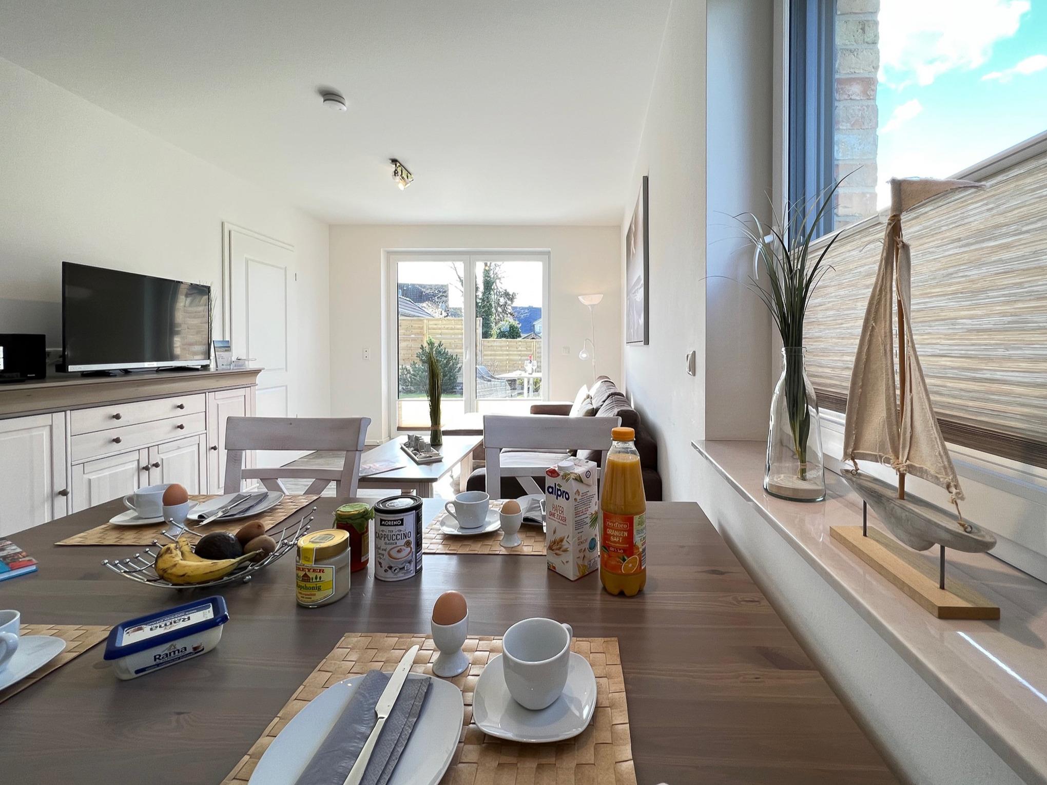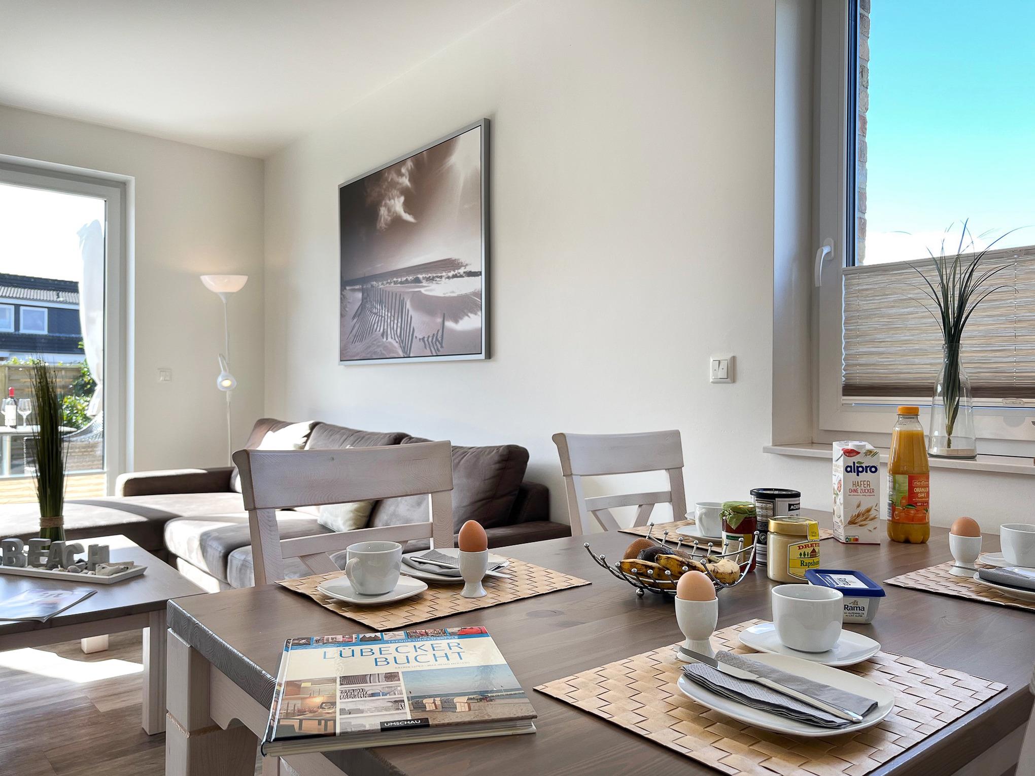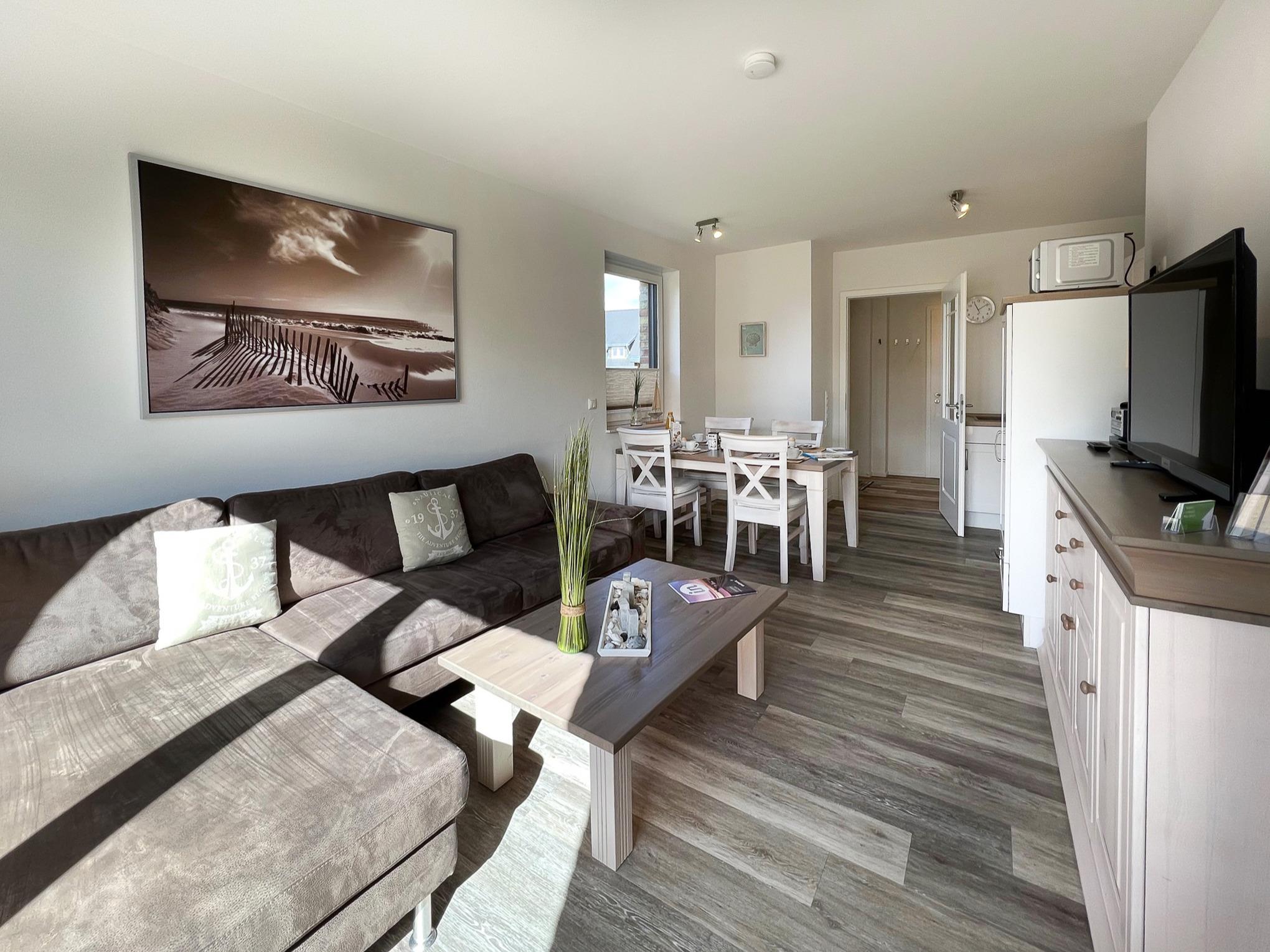 Vom Flur aus gelangt man in das sonnen-helle Wohn- und Esszimmer (mit Flachbild-TV, Hifi-Anlage und kostenlosem Internetzugang). Der komfortable Wohnbereich ist mit hellen modernen Möbeln ausgestattet. Von dort aus gelangt man auf die großzügige Süd-Terrasse (2 Wellnessliegen, Terrassenmöbel, Sonnenschirm).