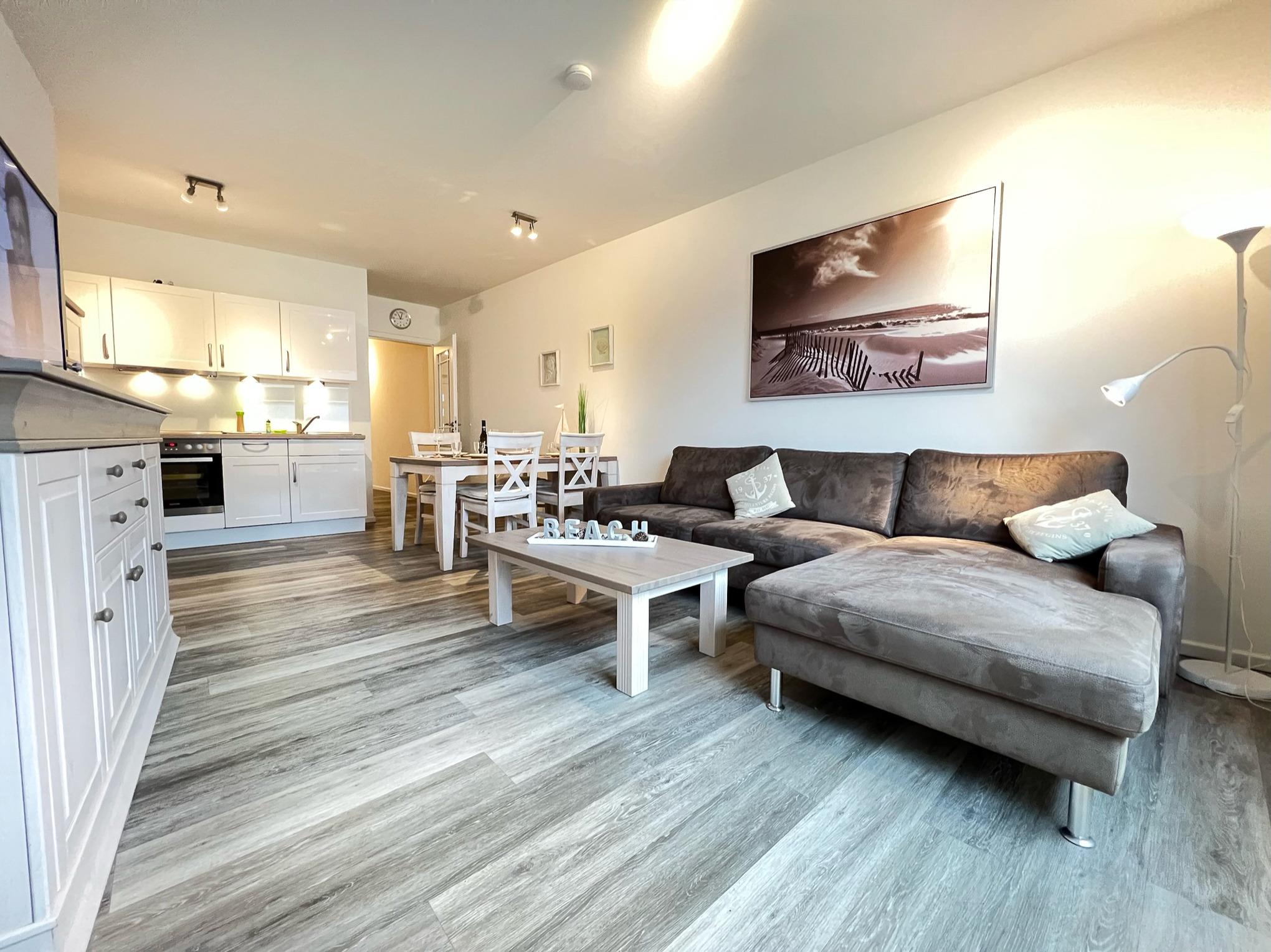 Die besonders schöne 3-Zimmerwohnung für 2-4 Personen befindet sich im Erdgeschoss und verfügt über eine in den großzügigen Wohn-/Essbereich integrierte umfangreich ausgestattete Komfort-Küche (Cerankochfeld, Backofen, Mikrowelle, Spülmaschine, Kühlschrank mit Gefrierfach etc.).