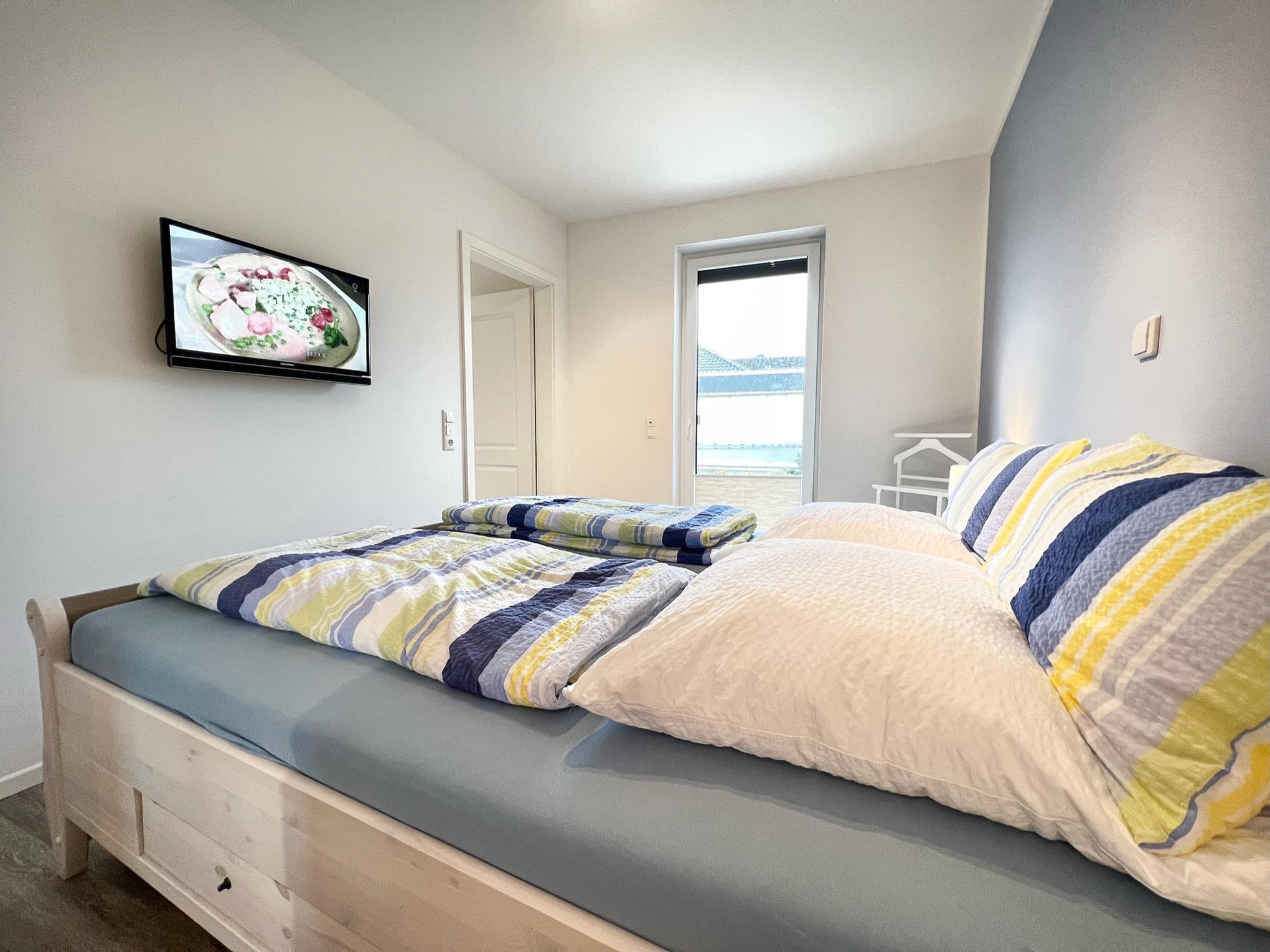 Beide Schlafzimmer sind mit einem Boxspring-Doppelbett, Schrank und einem Flachbild-TV ausgestattet. Aus dem 2. Schlafraum gelangt man direkt auf die 15 qm große Terrasse und beginnt den Tag mit belebender Ostsee-Sonne.