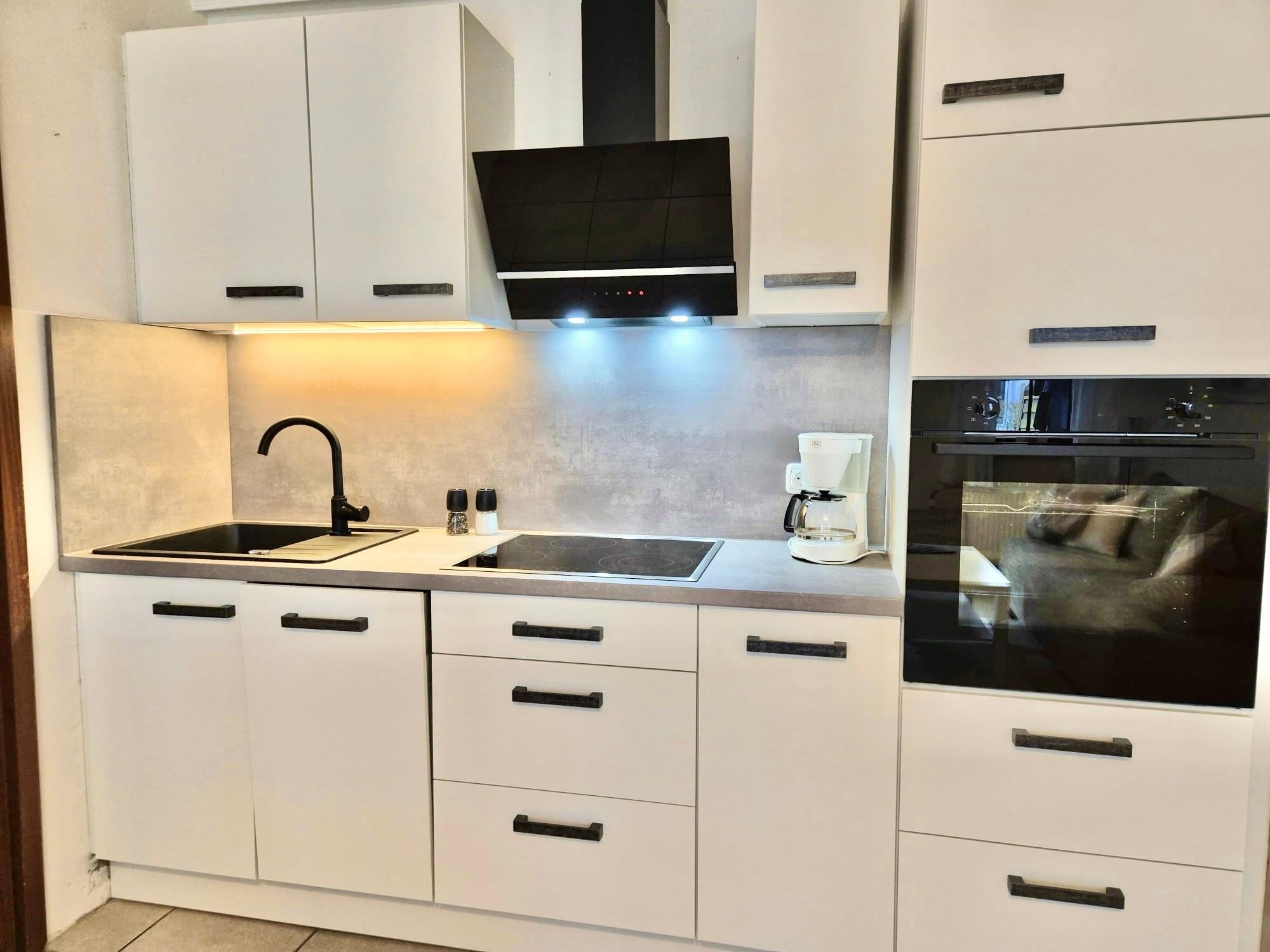 Die offene, moderne Küchenzeile ist nagelneu und hochwertig ausgestattet: Induktionskochfeld, Mikrowelle, Backofen, Kühlschrank mit Gefrierfach, Geschirrspüler sowie alle gängigen Küchengeräte lassen keine Wünsche offen.