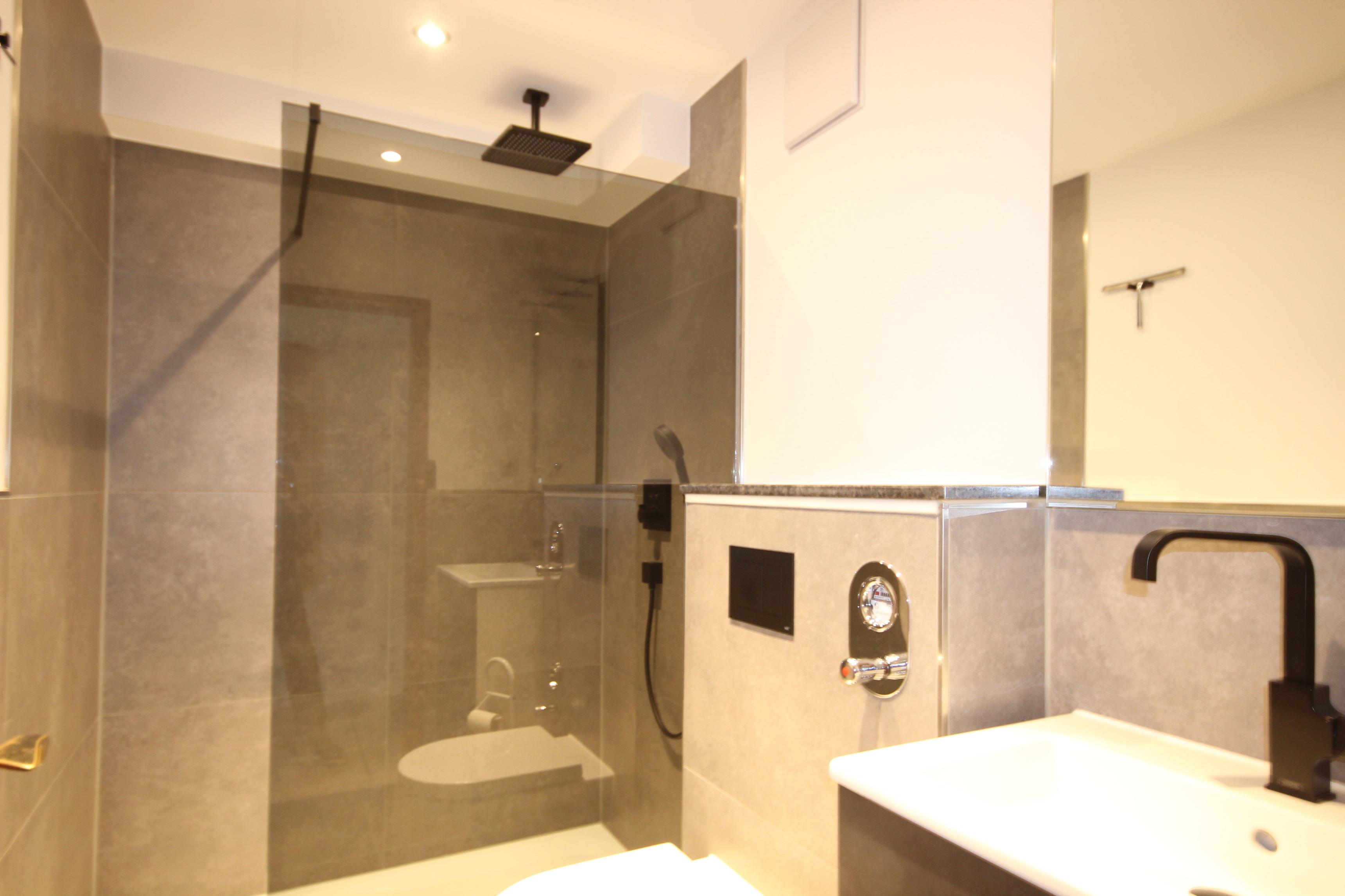 Das frisch renovierte Badezimmer überzeugt mit moderner Ausstattung: bodentiefe Dusche, WC und Waschbecken sorgen für einen angenehmen Start in den Tag.