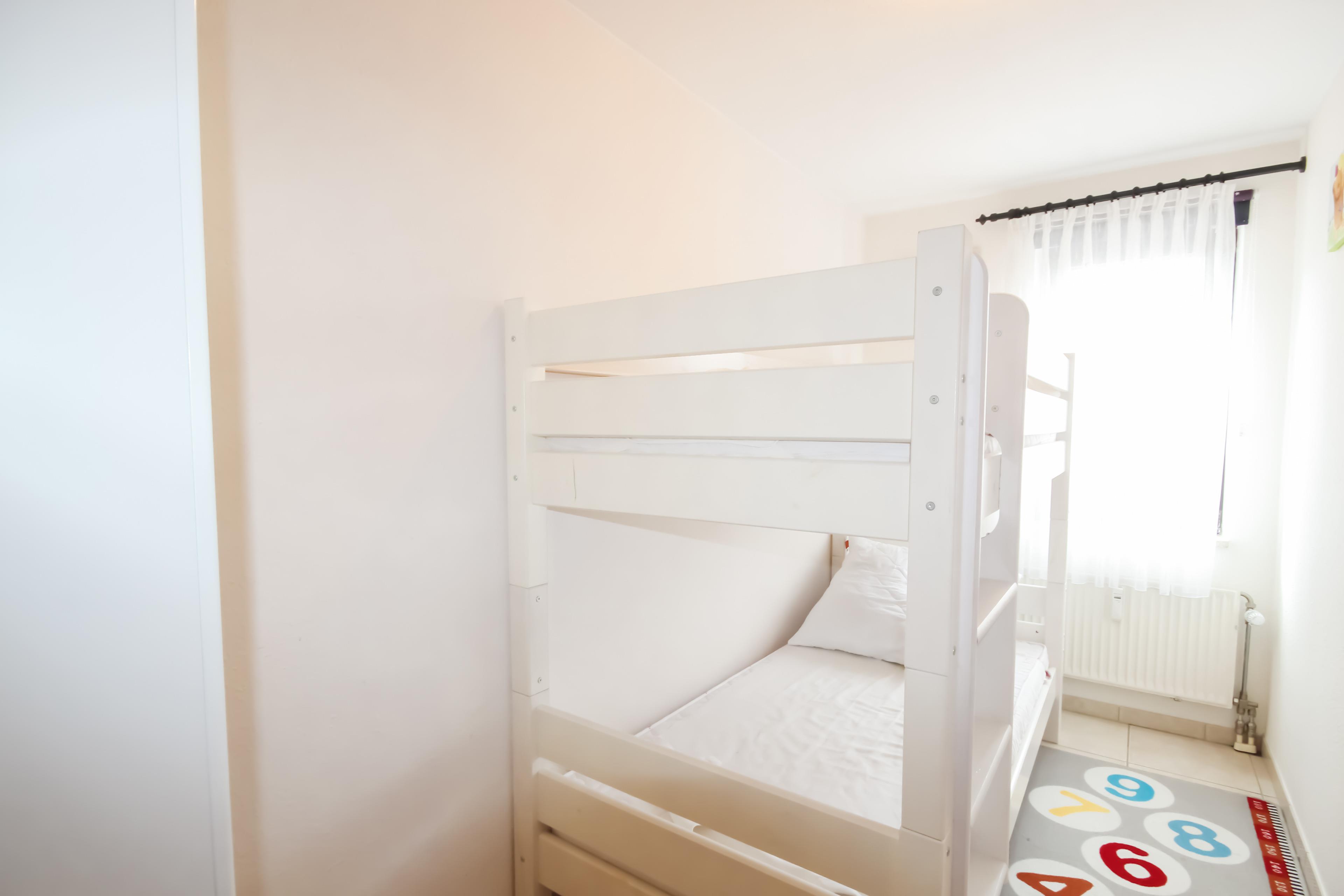Im Hauptschlafzimmer erwartet Sie ein komfortables Doppelbett sowie ein geräumiger Kleiderschrank. Das zweite Schlafzimmer verfügt über ein praktisches Etagenbett und ebenfalls einen Kleiderschrank – ideal für Kinder oder mitreisende Gäste.