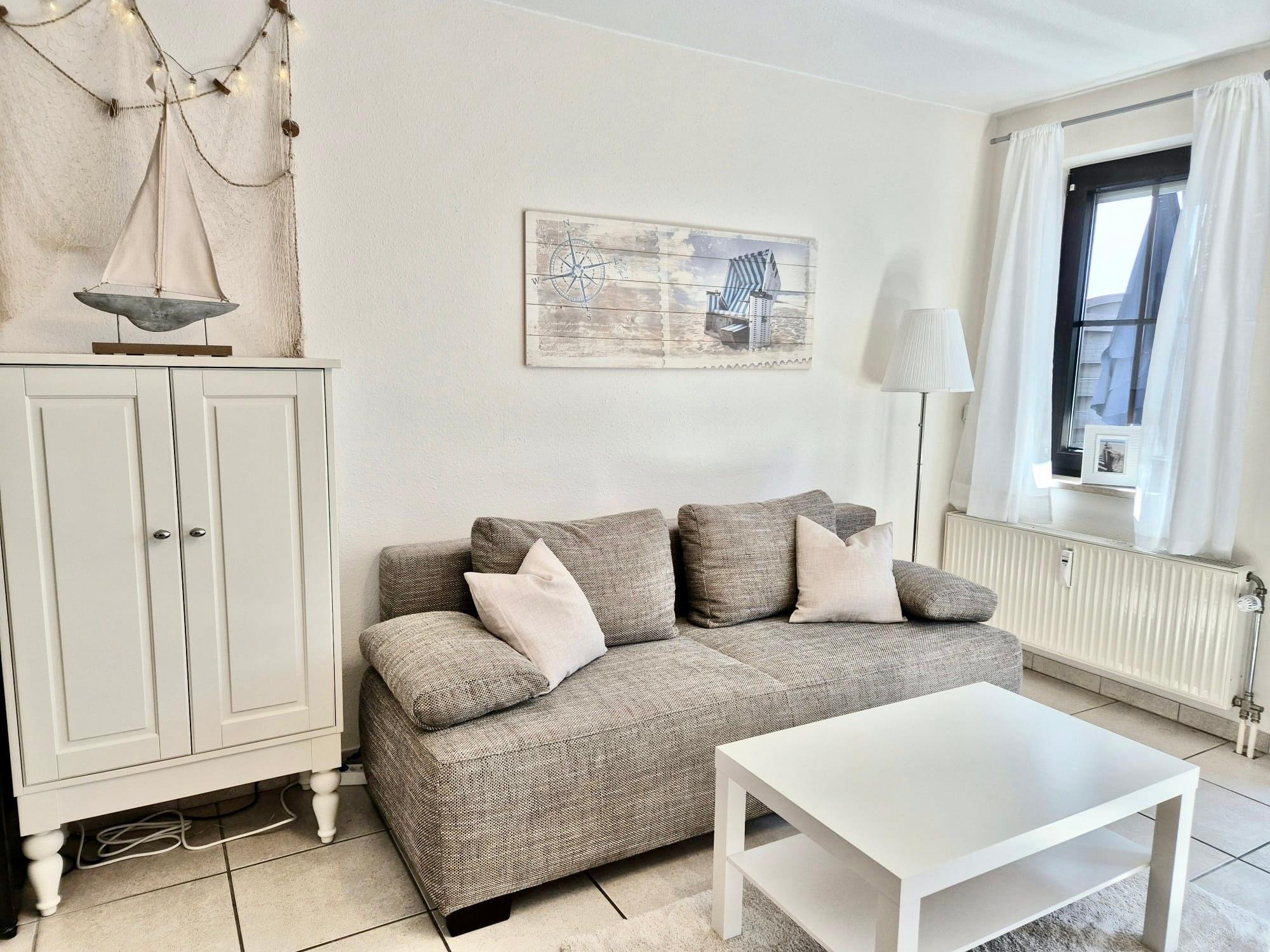 Das maritim gestaltete Wohnzimmer lädt mit einer gemütlichen Couchgarnitur, einem Sideboard, Kabel-TV, Radio und einem Esstisch für 4 Personen zum Verweilen ein. Von hier aus gelangen Sie direkt auf die sonnige Süd-West-Terrasse – perfekt für entspannte Stunden an der frischen Luft. WLAN steht Ihnen kostenfrei zur Verfügung.