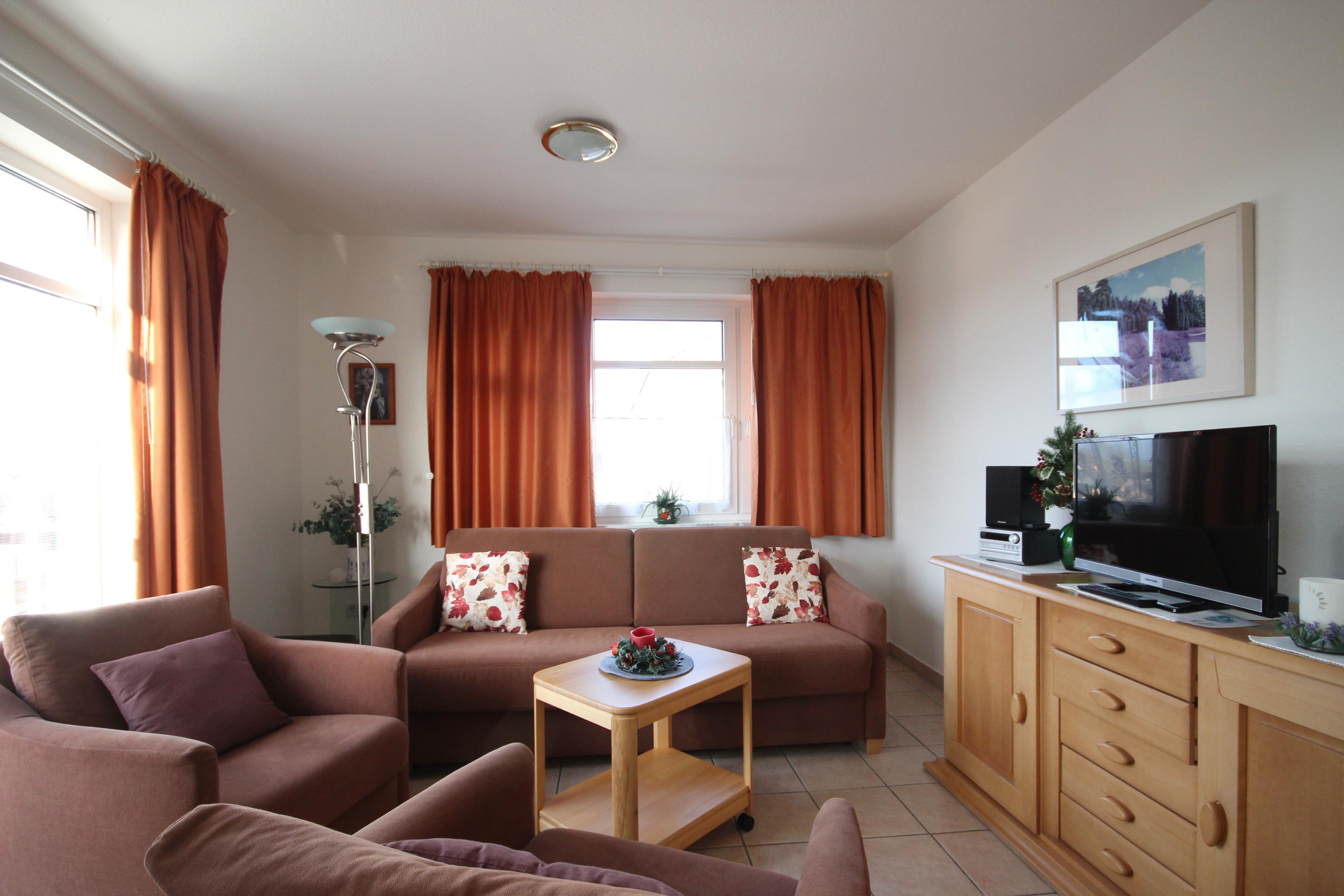 Der schön geschnittene Wohn-/Essraum mit TV, WLAN und Radio ist gemütlich mit einer Couch-Garnitur sowie Essplatz für 4 Personen und Sideboard eingerichtet. Das Sofa ist bequem für 2 Personen zum Bett ausziehbar.