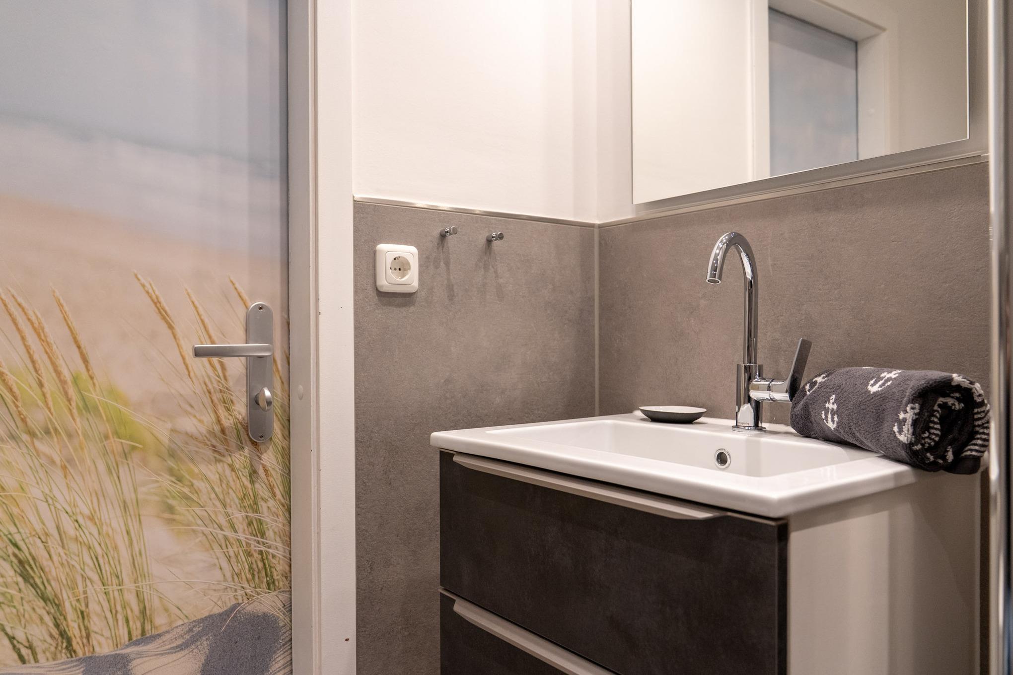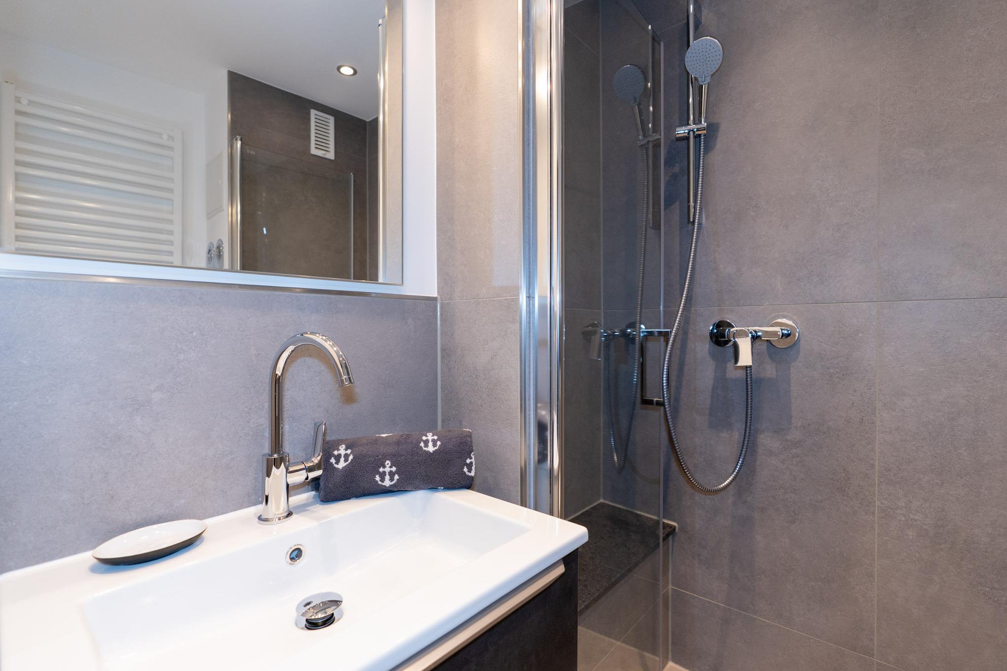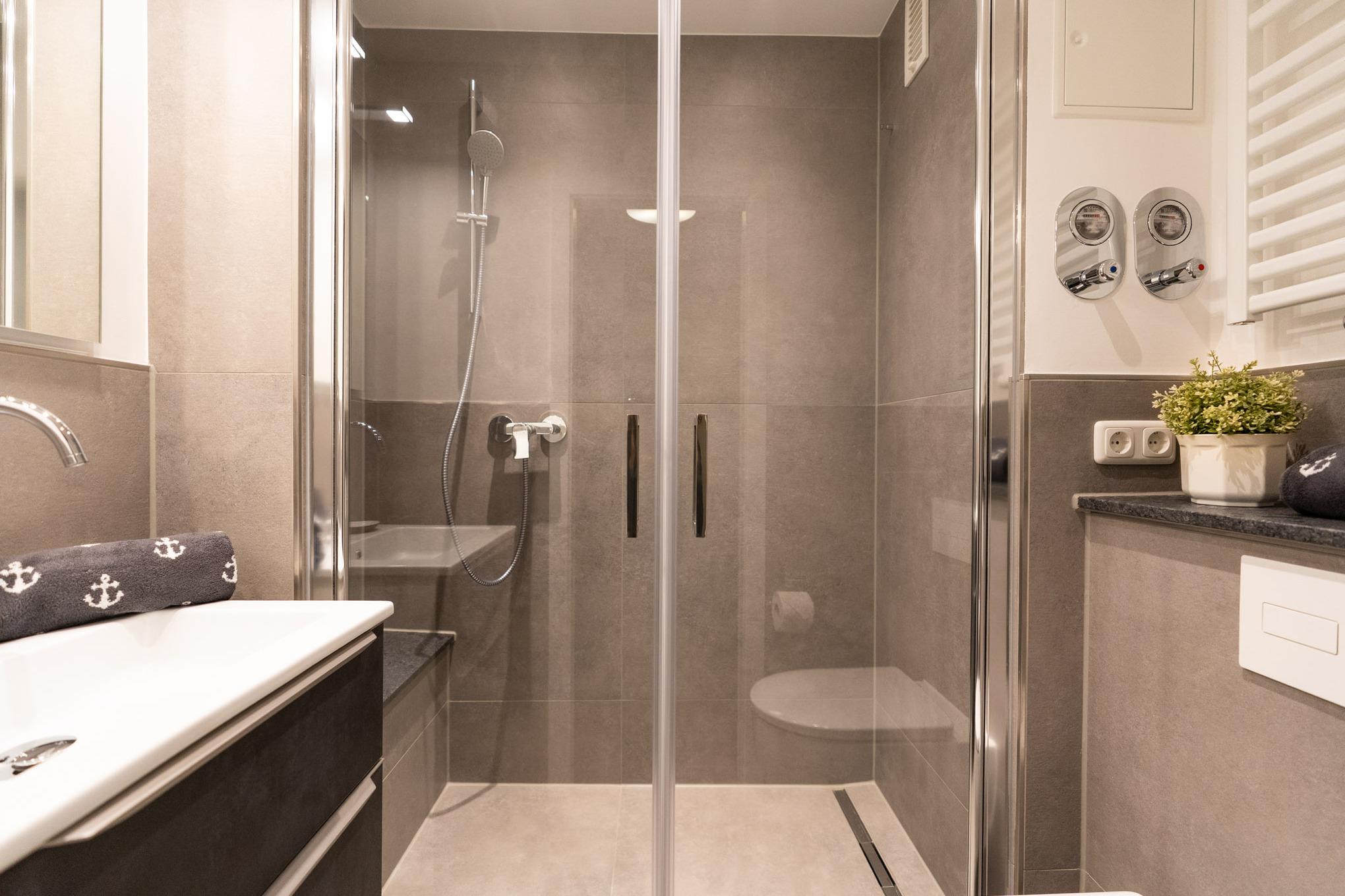 Das Badezimmer wurde im Winter 2025/26 vollständig erneuert. Eine geräumige Dusche mit Doppelflügeltür und Sitzbank, ein Hänge-WC, Waschbecken mit Stauraum im Unterschrank sowie ein Spiegel mit integrierter Beleuchtung und ein Handtuchheizkörper wurden hier in modernem Stil installiert.