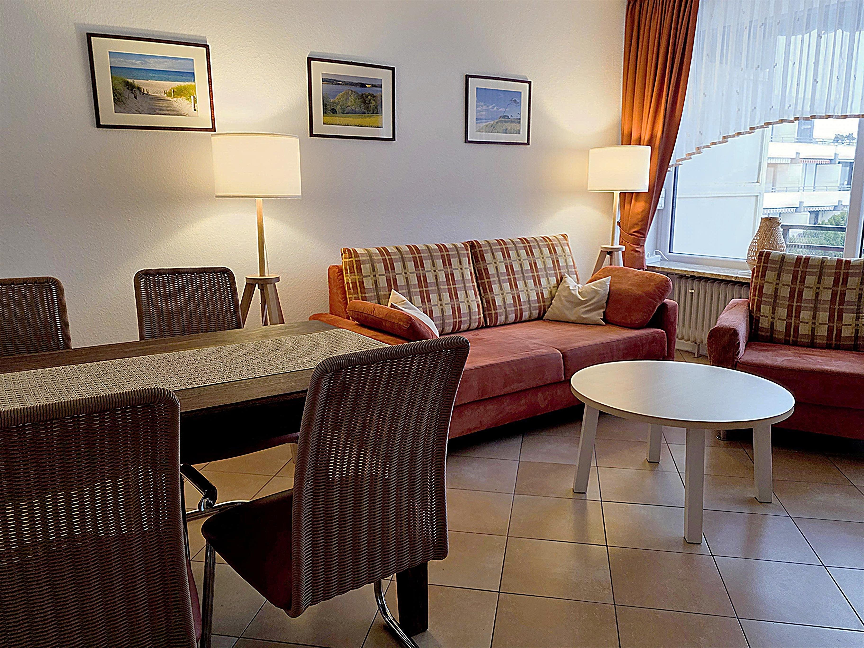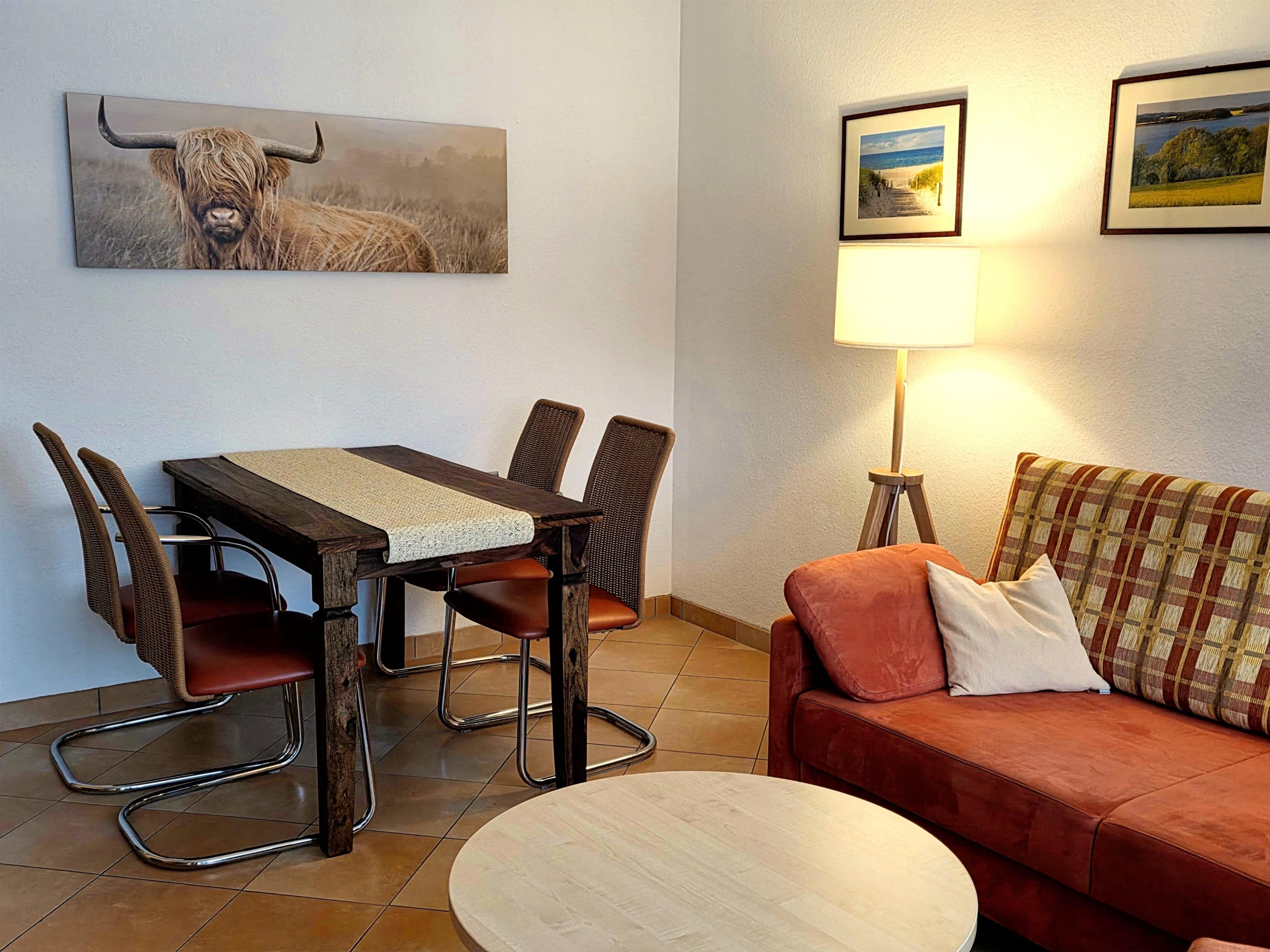Das gemütlich eingerichtete Wohnzimmer verfügt über ein Schlafsofa für 1 - 2 Personen, einen Essplatz für 4 Personen, CD-Radio, TV, Schrankwand. Hier haben Sie Zugang zum sonnigen, möblierten Süd-Balkon, auf dem Sie Ihre Urlaubstage genießen können.