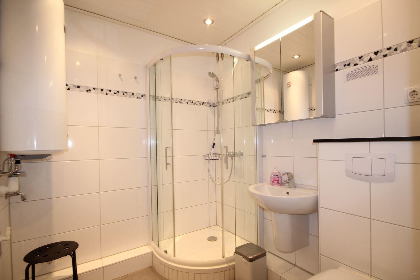 Helles Bad mit Duschkabine, WC & Waschtisch.