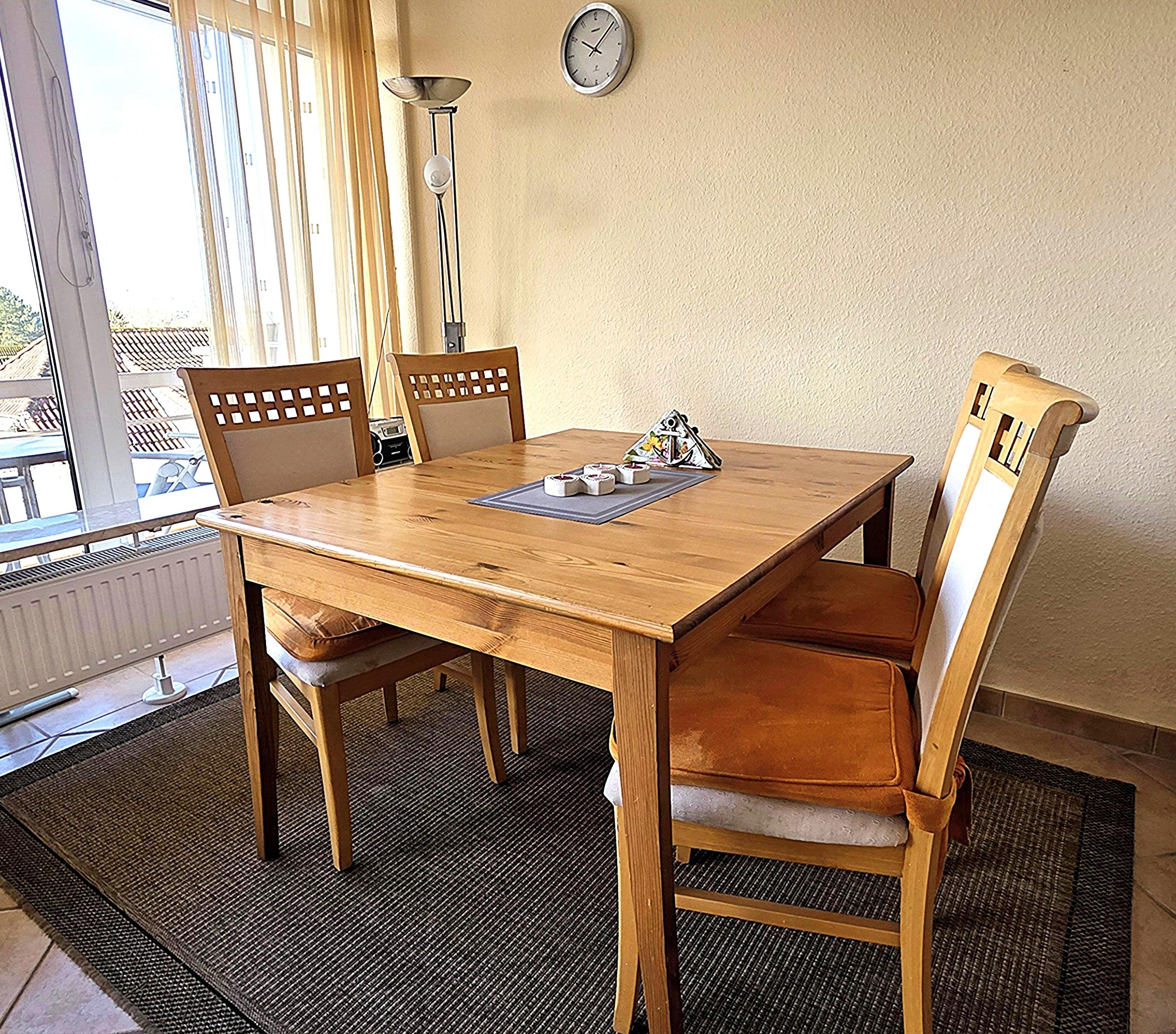 Wohnzimmer: Im hellen geräumigen Wohnbereich befindet sich ein Essplatz für 4 Personen und ein Ecksofa zum Ausziehen, TV, Disk-Kompakt-Anlage + MP3-Player sowie ein bequemer Fernsehsessel. Eine sonnige Loggia mit Markise gehört ebenfalls dazu.