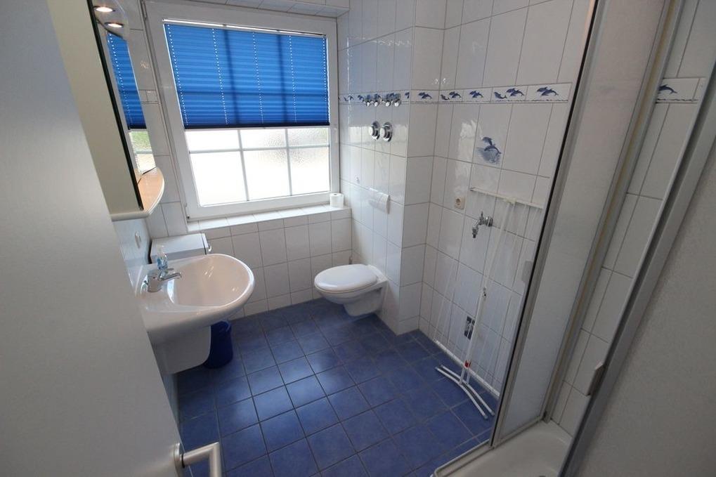 Eine helles, freundliches Tageslicht-Duschbad mit Waschbecken, WC und Eckduschkabine ist vorhanden.