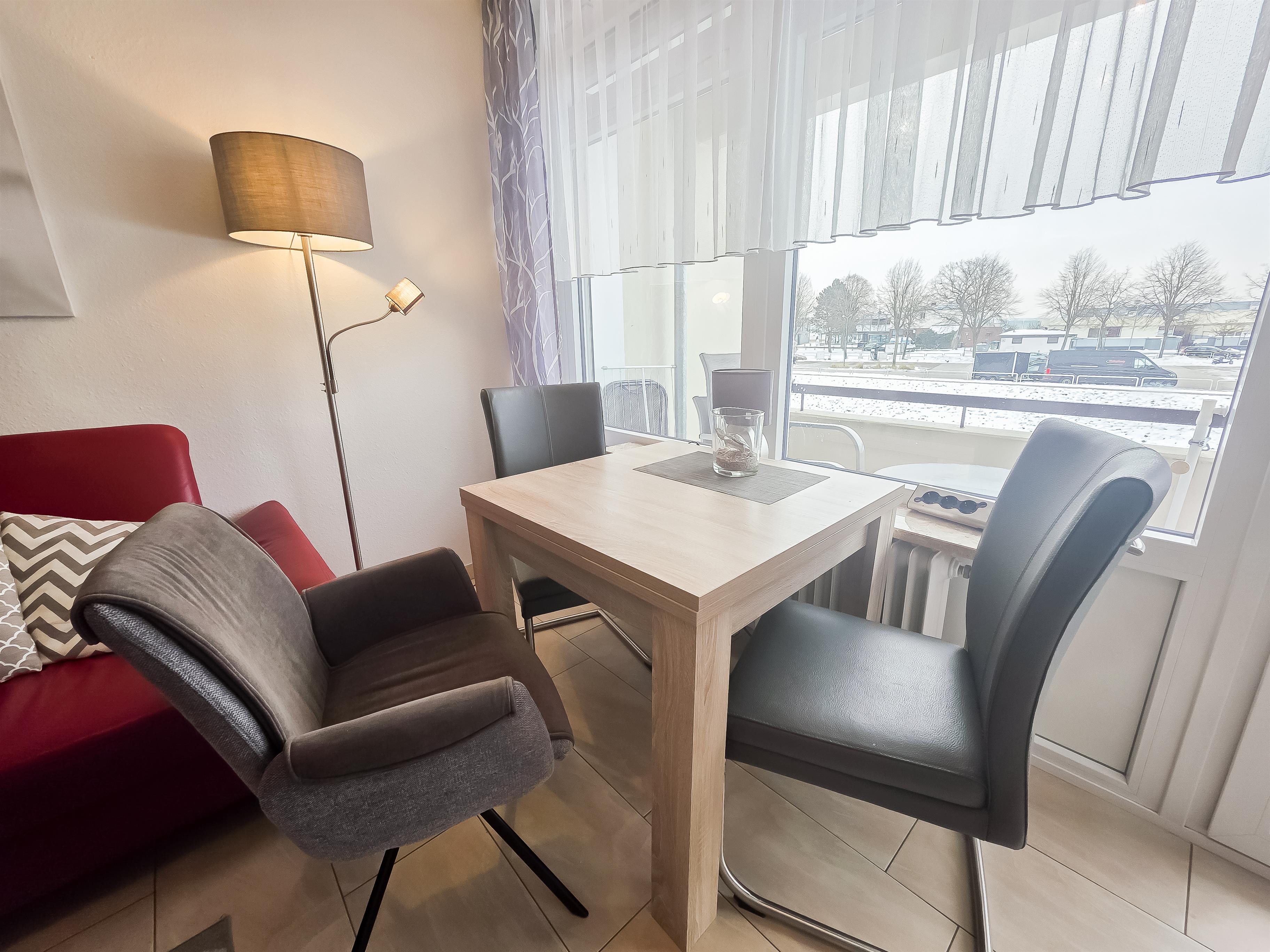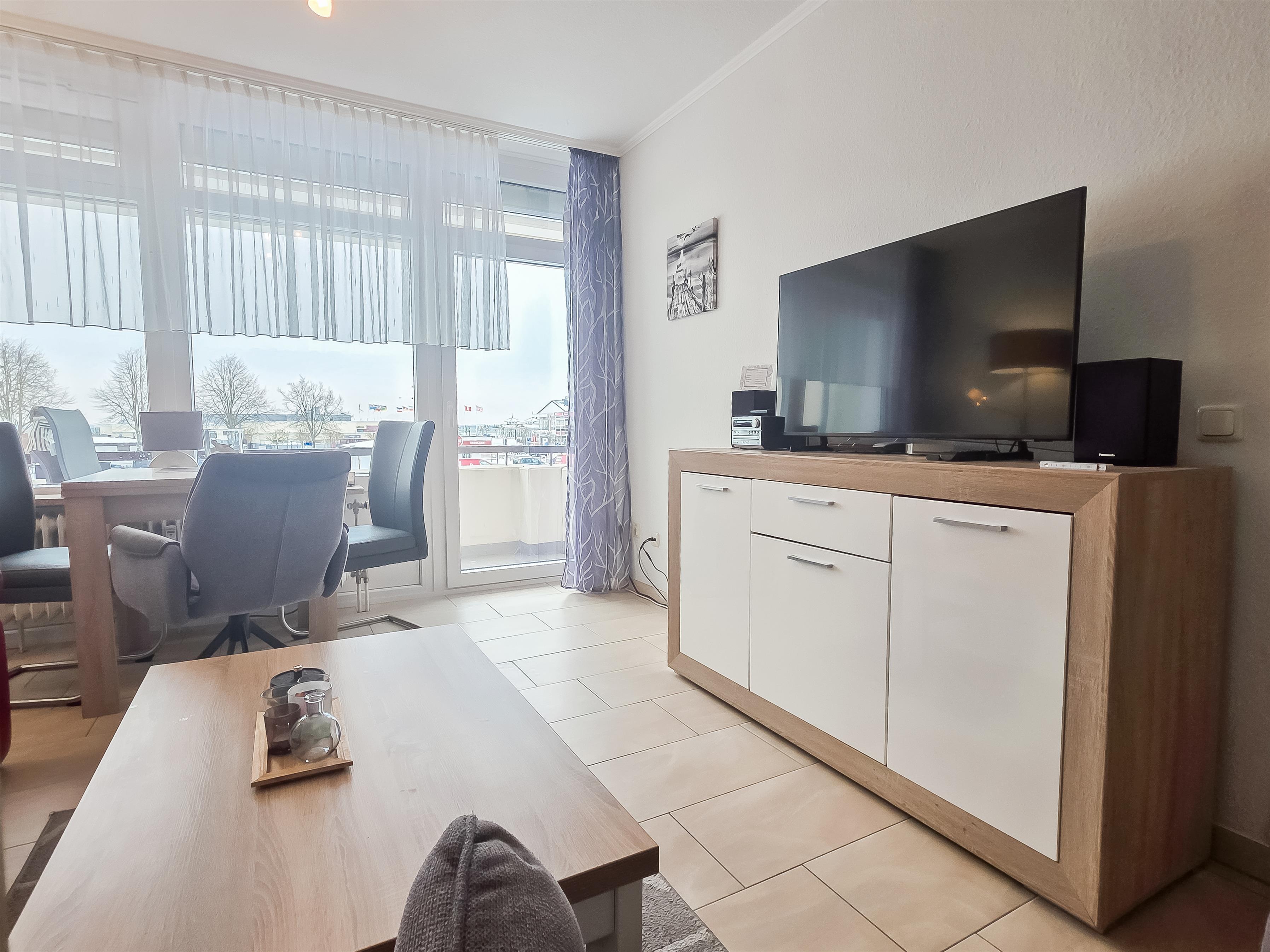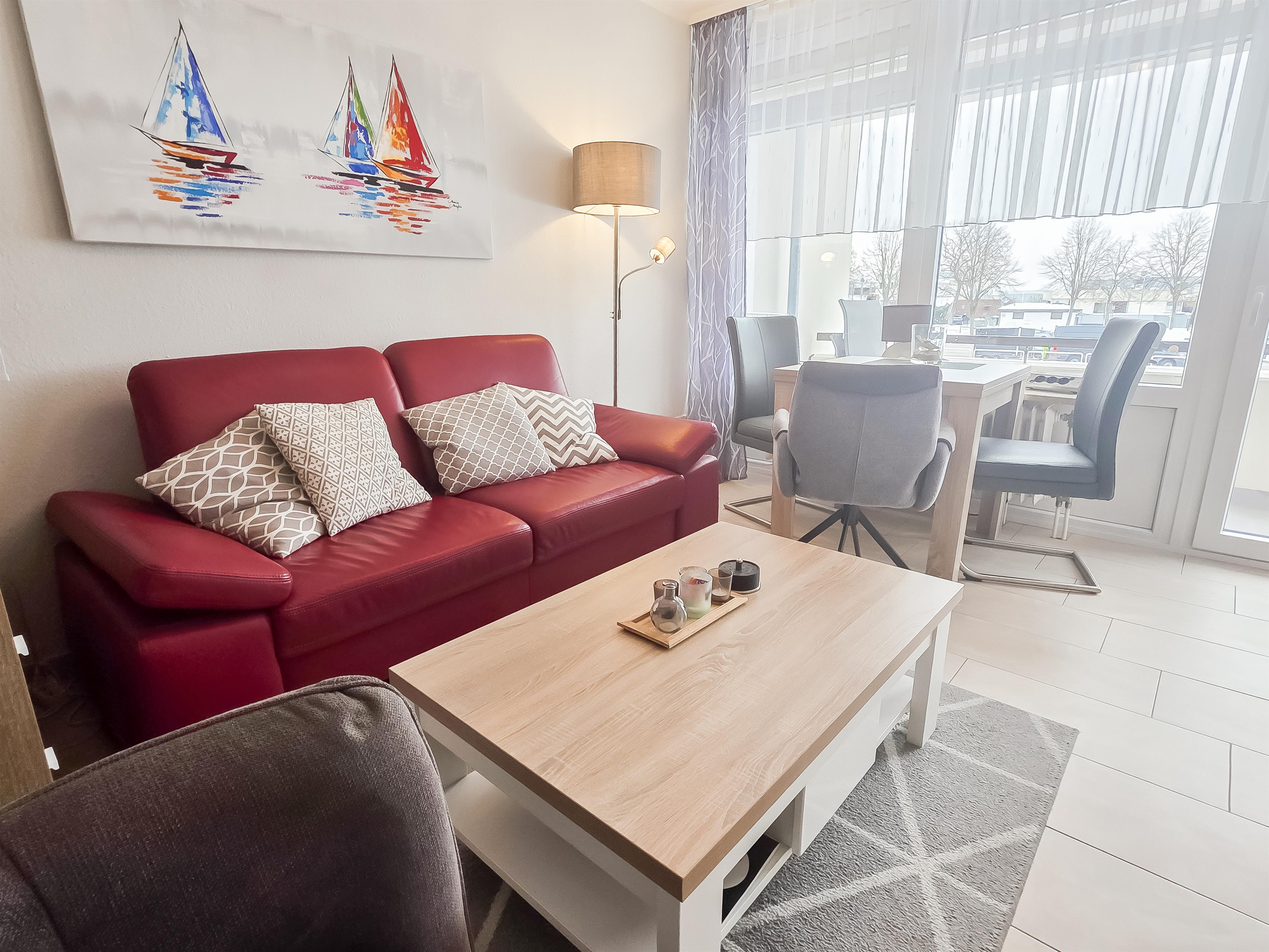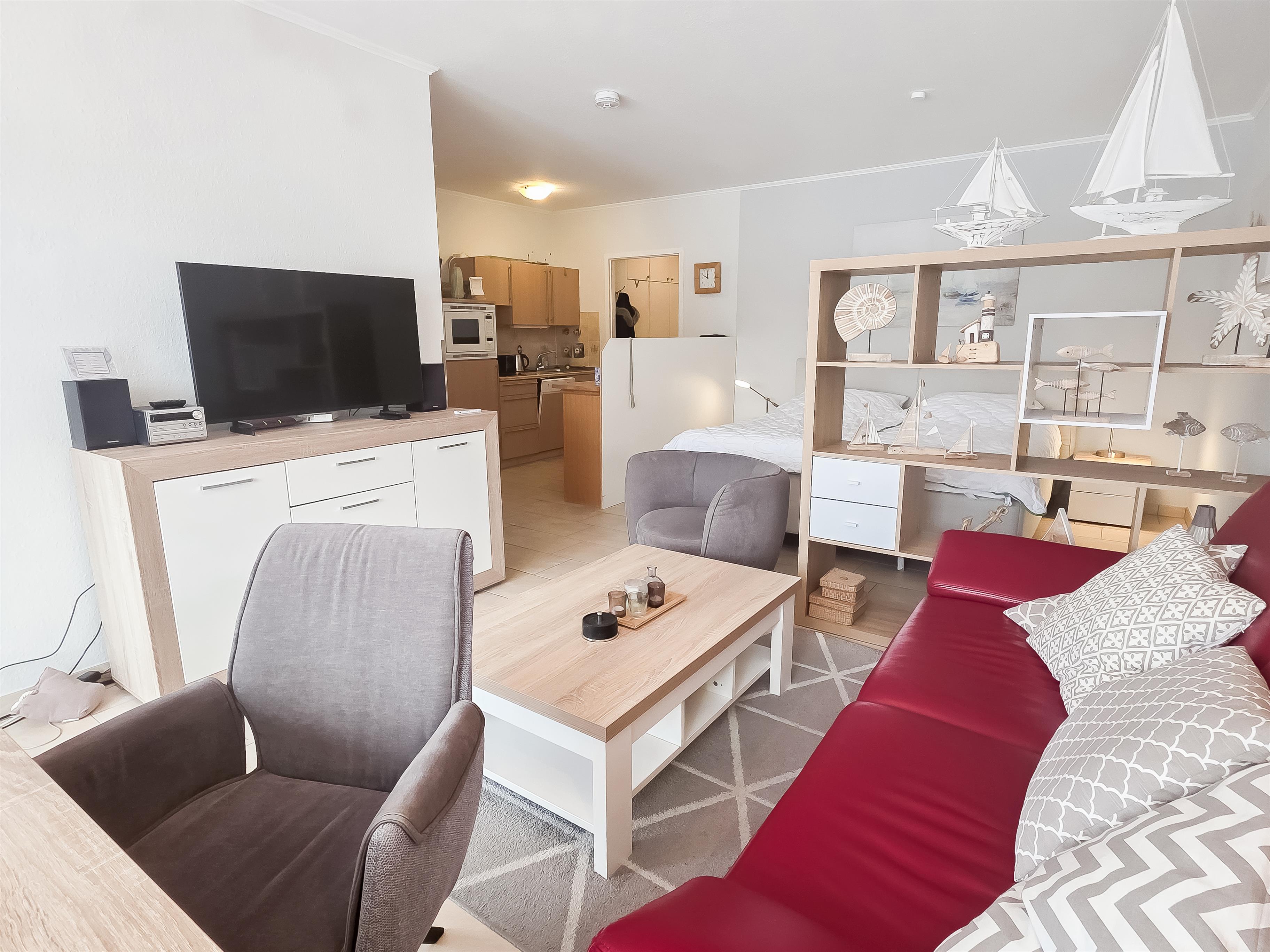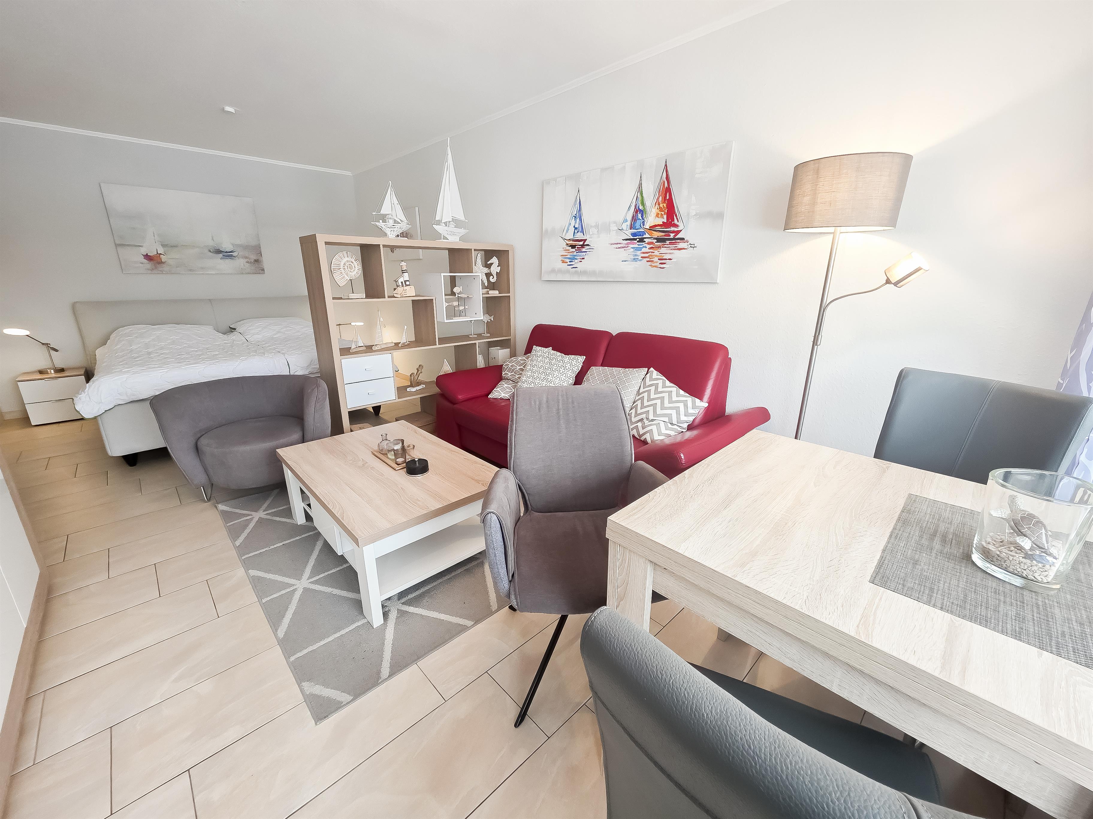Im Wohnbereich befindet sich eine Sofaecke, TV, Essplatz sowie ein optisch abgeteilten Schlafbereich mit Ehebett.