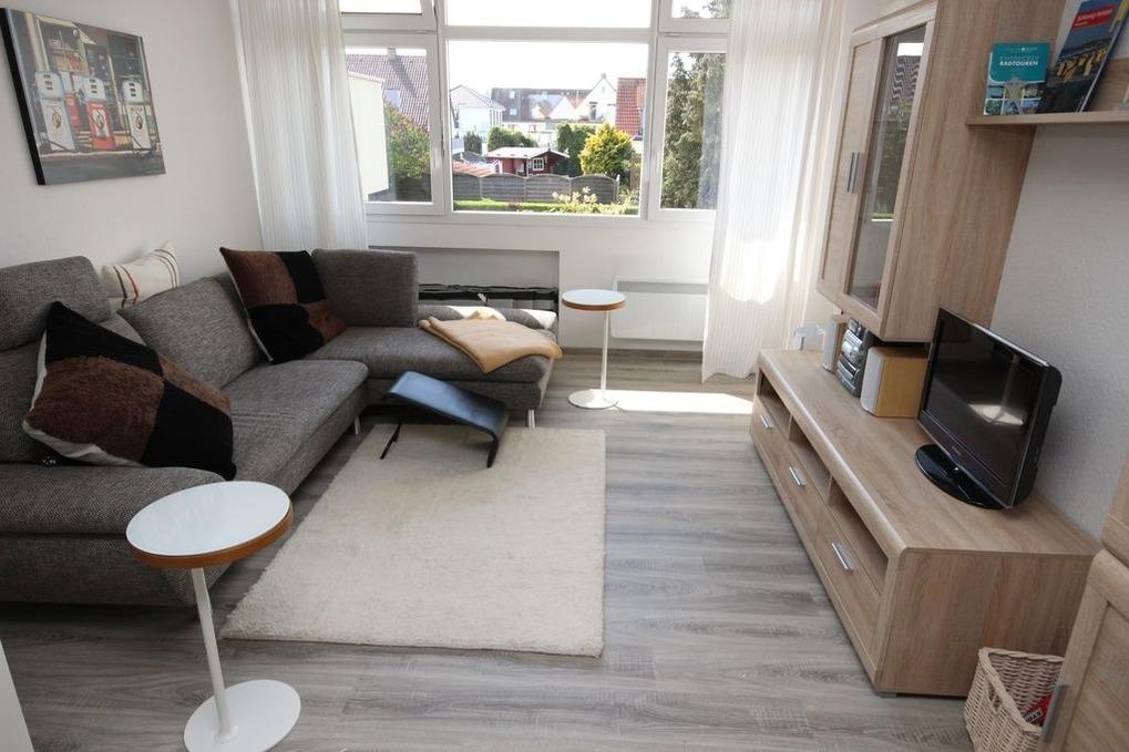 Helle und modern eingerichtete Wohnung, 3 Zimmer mit ca. 68 m² Wohnfläche und sonniger Terrasse für 2-4 Personen. Zum Strand sind es rund 350 m.