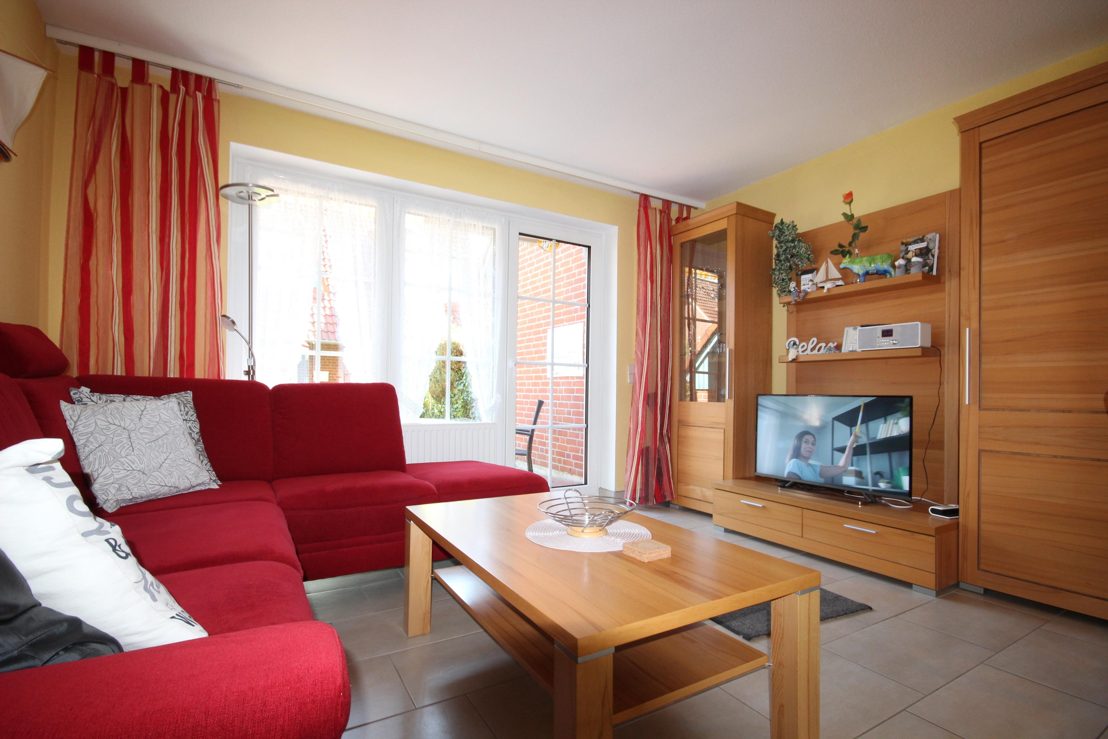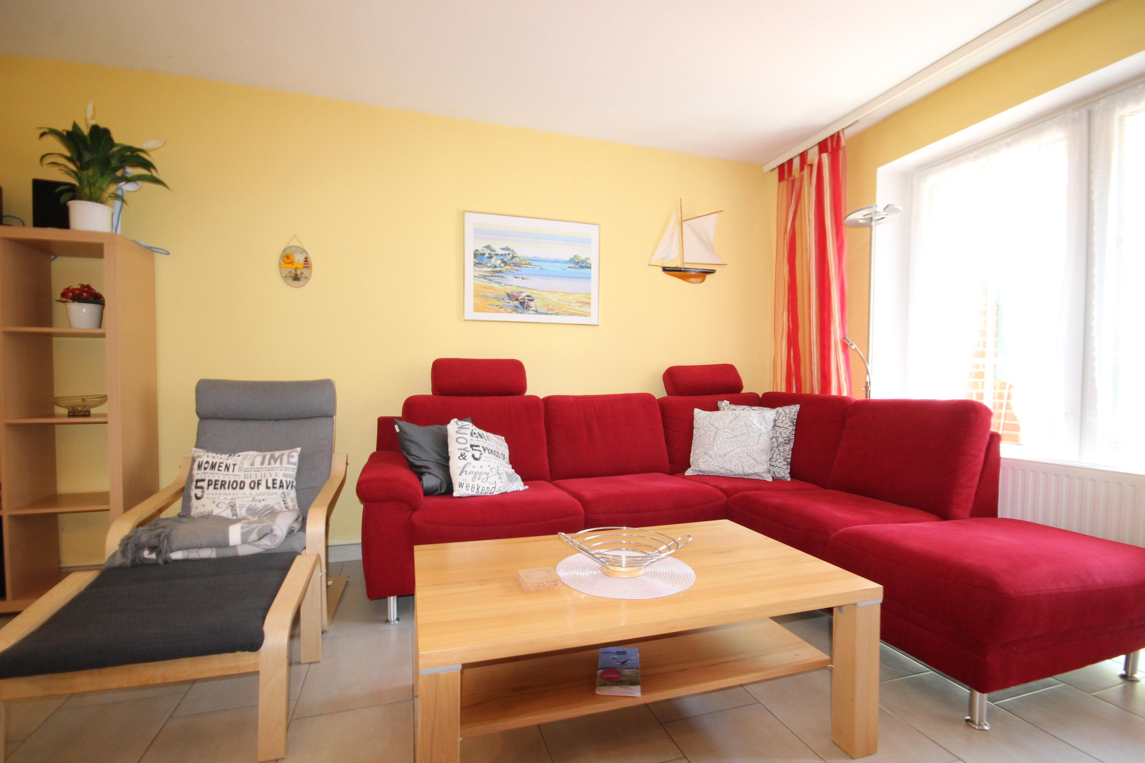 Der großzügige Wohnbereich ist mit einer bequemen Sofagarnitur, Essplatz, TV & Radio optimal eingerichtet.