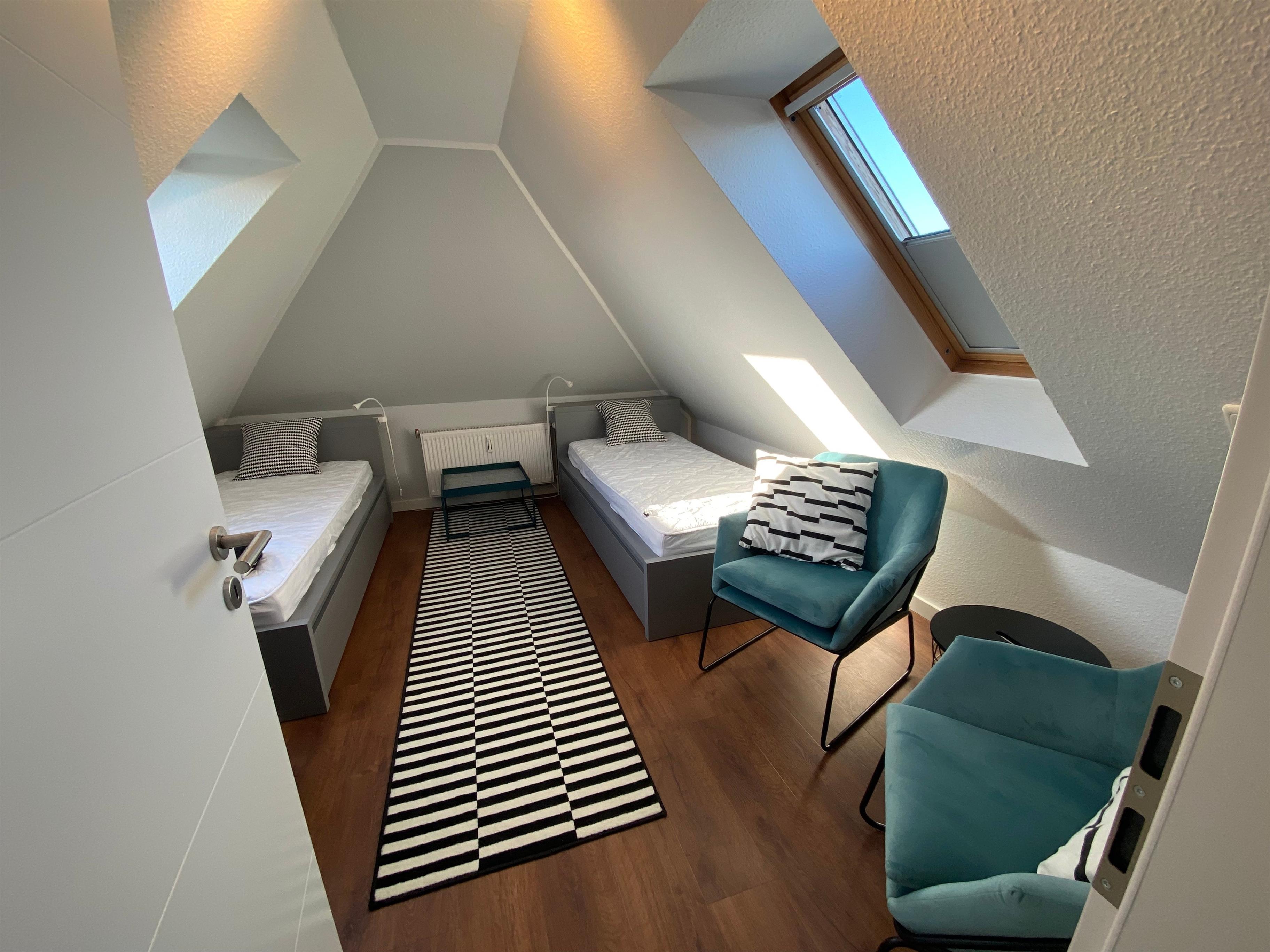Im DG befindet sich das 2. Schlafzimmer mit zwei Einzelbetten (90x200), 2 Kommoden und 2 Sesseln.