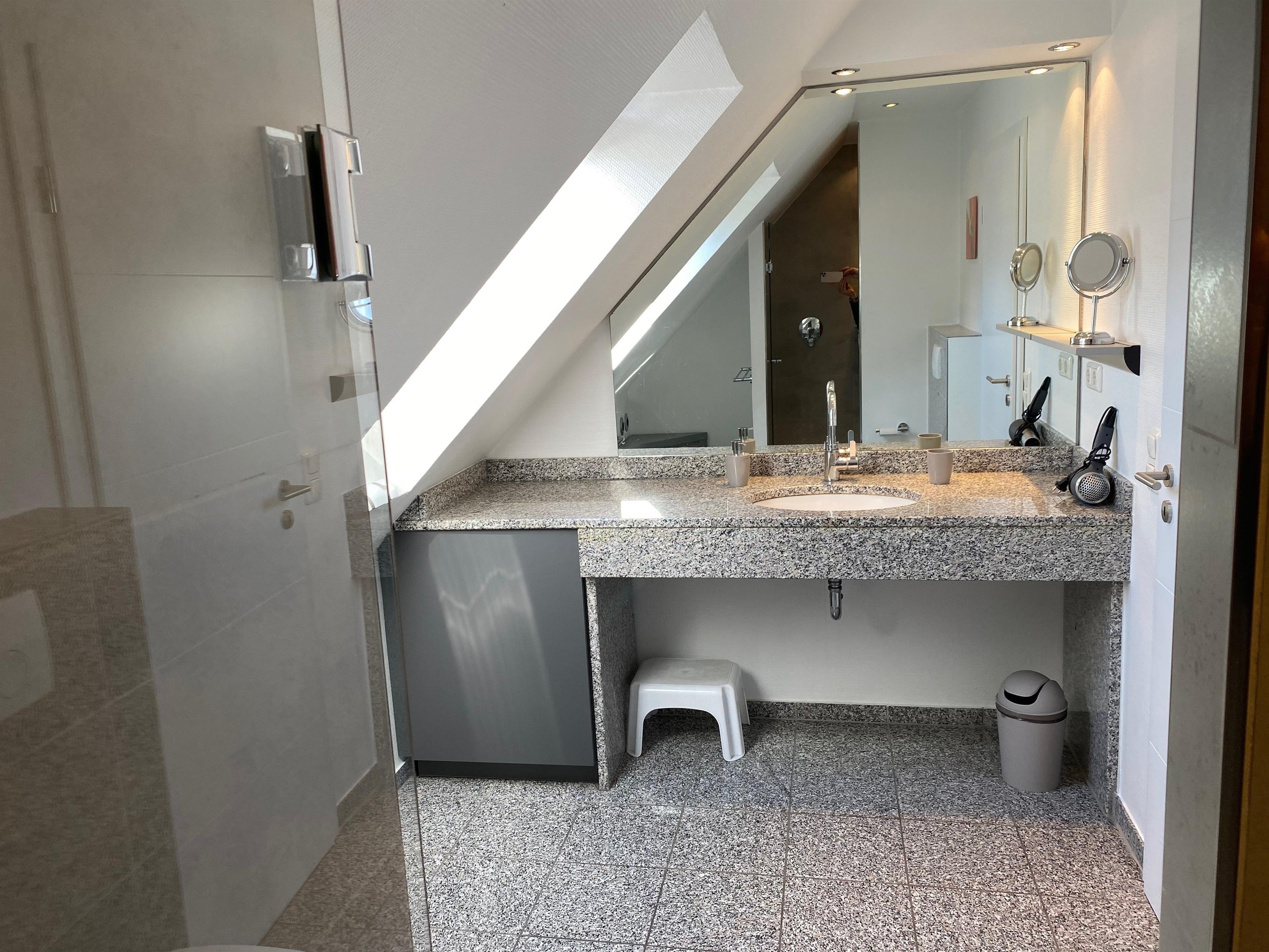 Das helle, komfortable Bad hat einen Granitboden, Granitwaschtisch, WC, Duschkabine und Föhn.