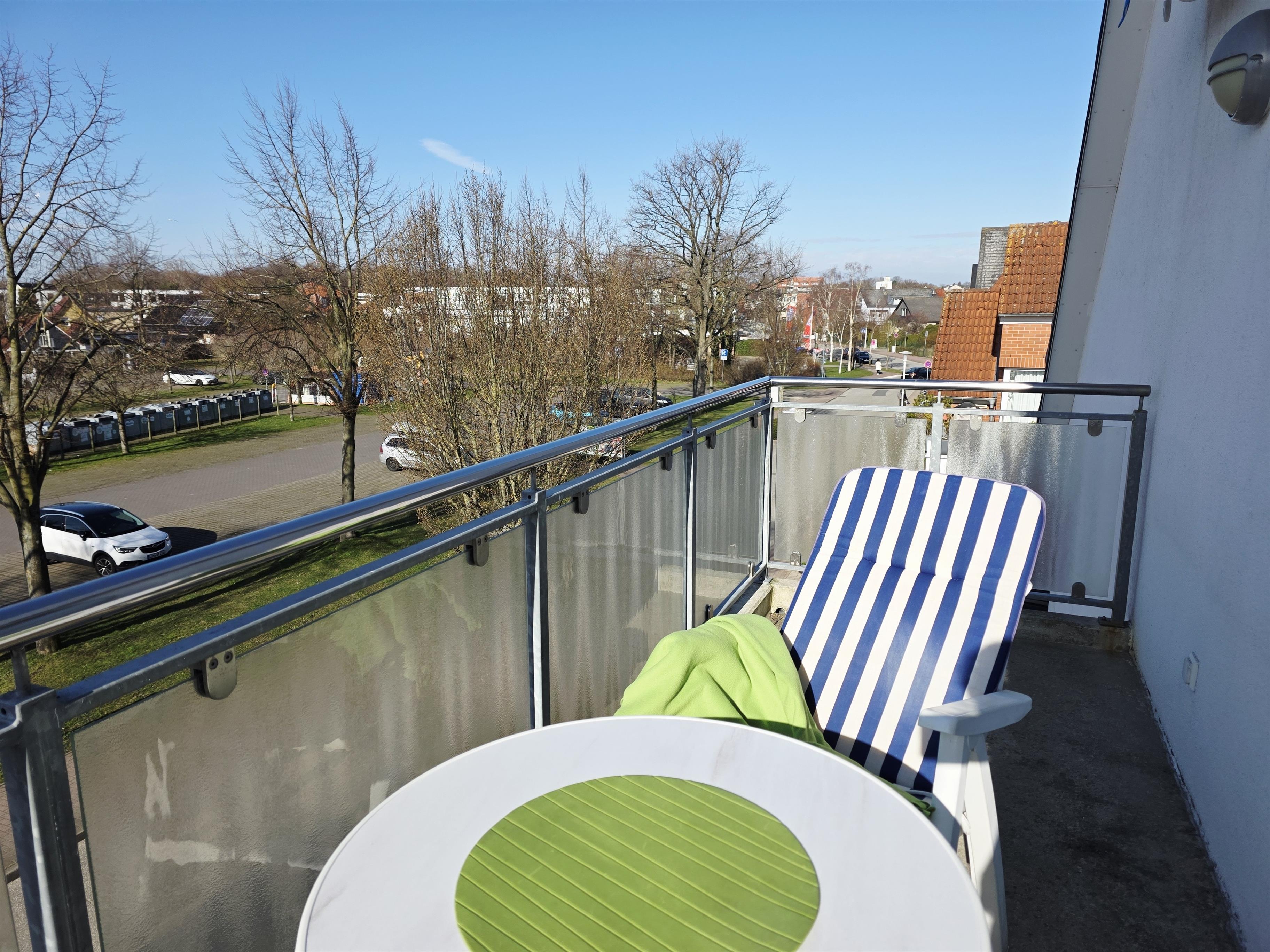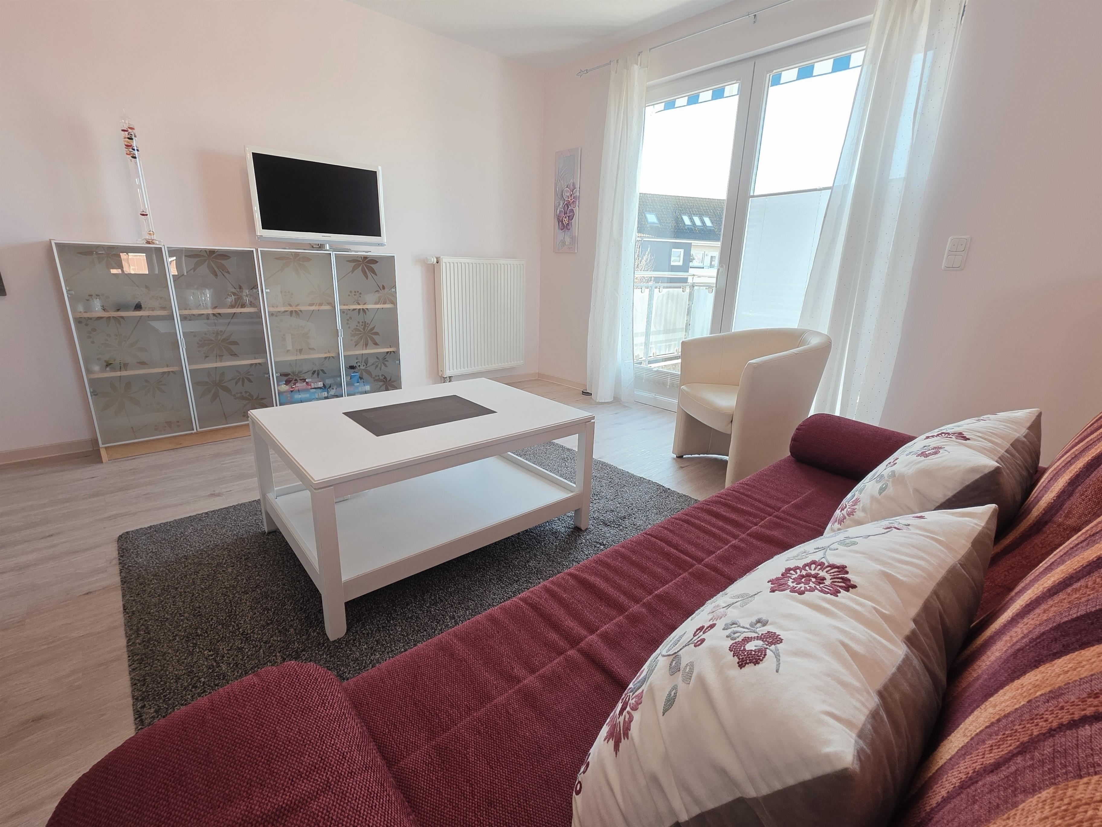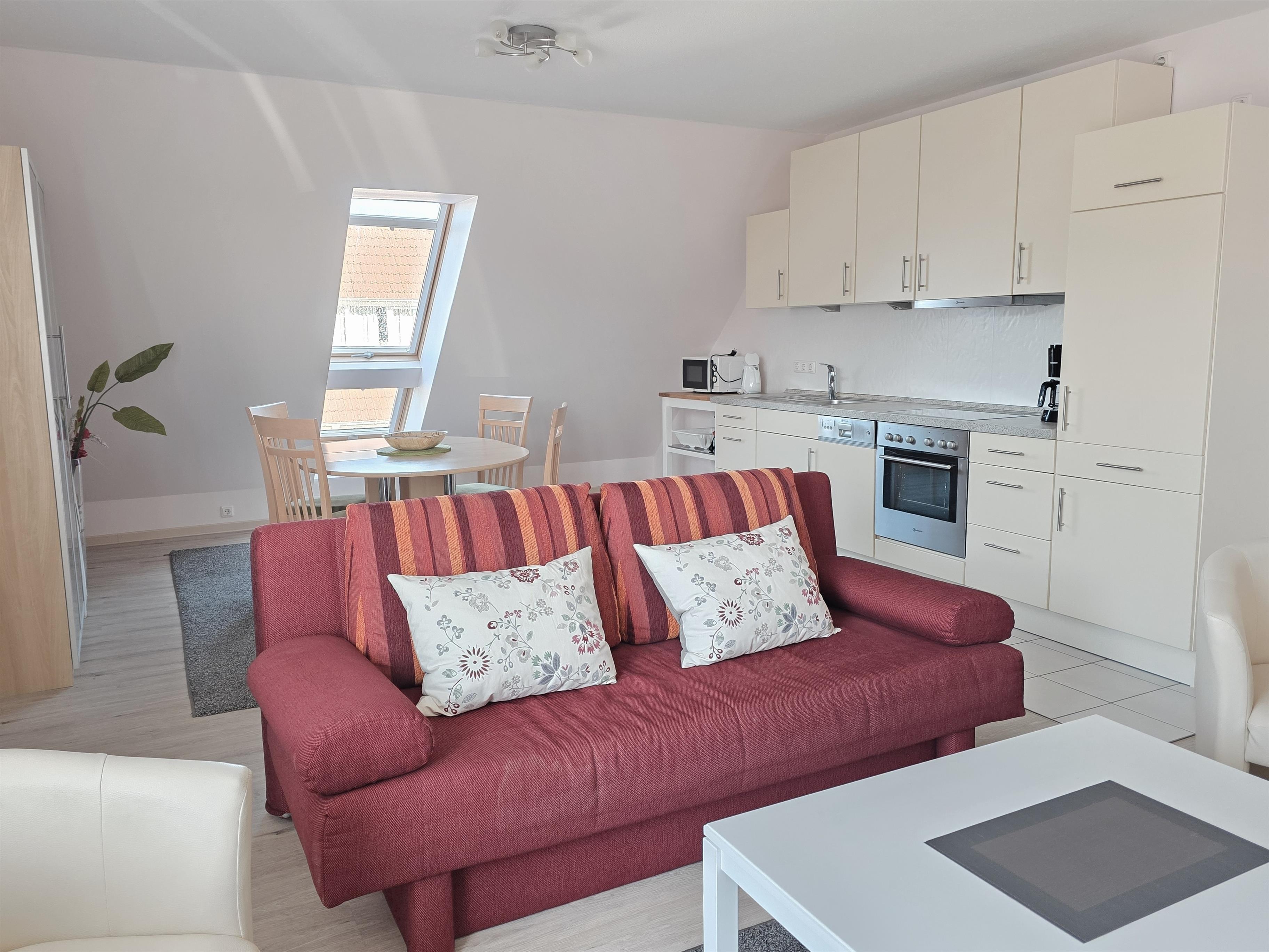Diese Wohnung über 2 Etagen bietet einen hellen Wohnbereich mit Couch (ausziehbar als Bett für 2 Pers.) TV, Radio mit CD, Essplatz für 4 Pers und Zugang zum möblierten Süd-Balkon.