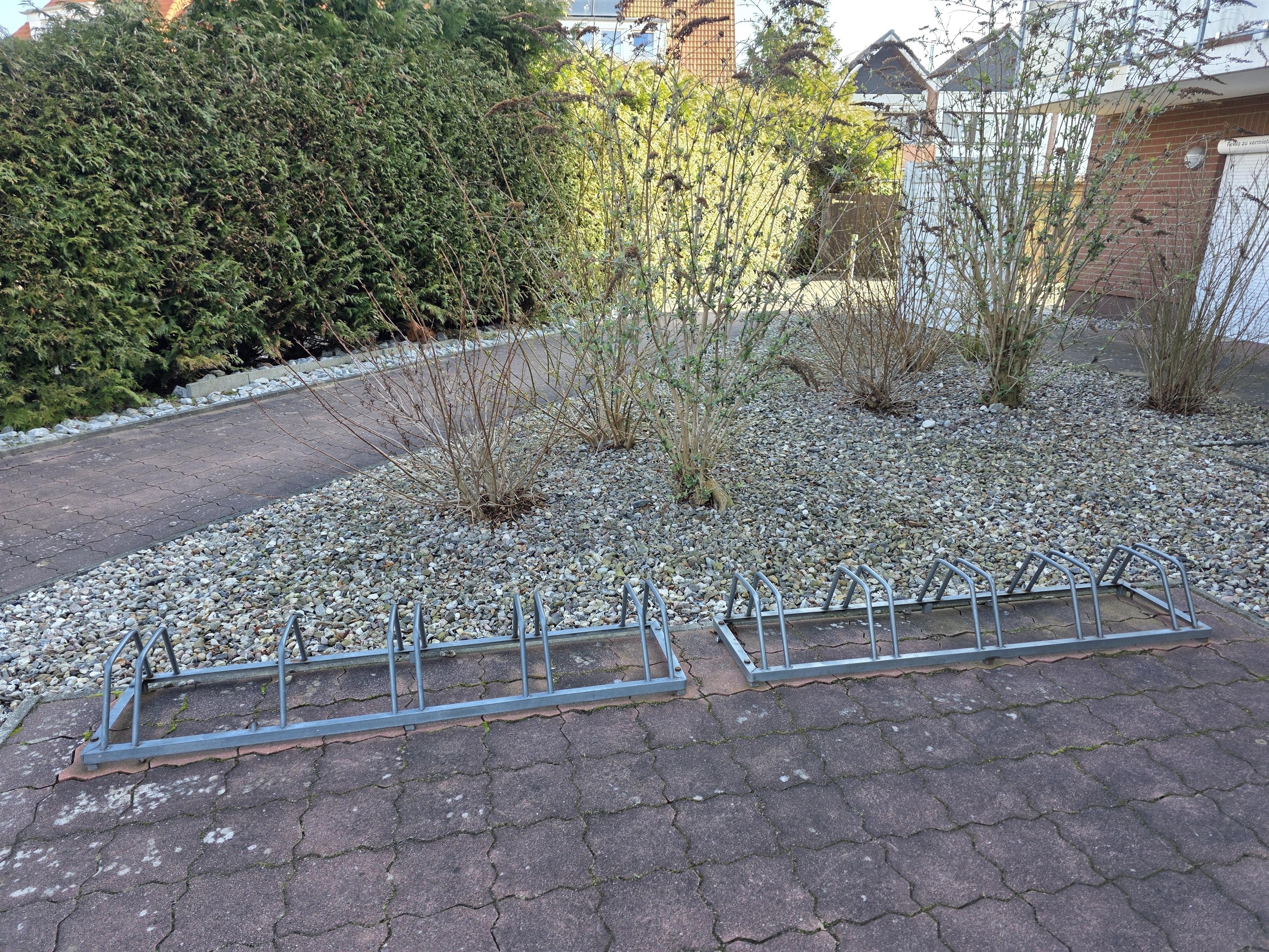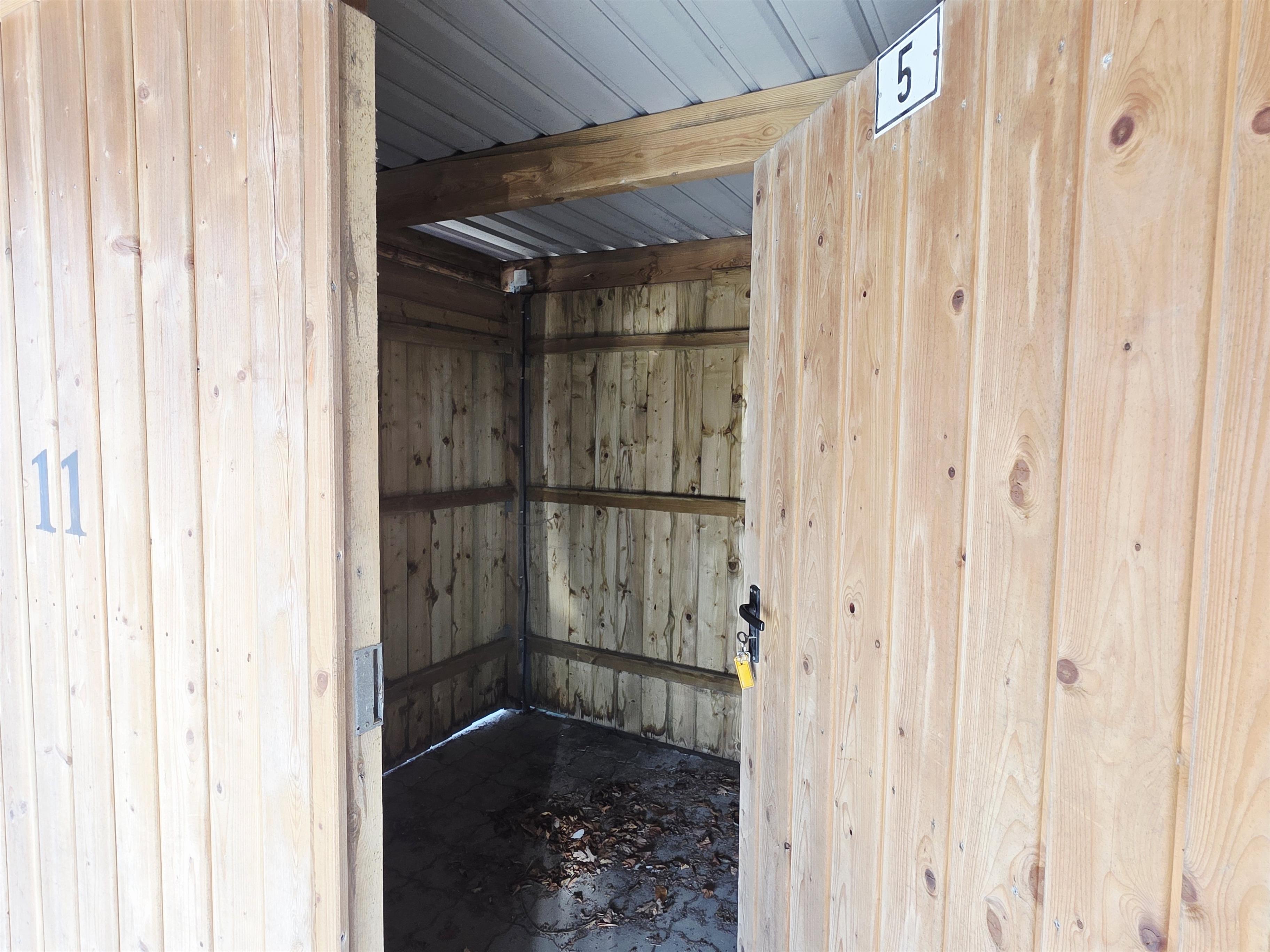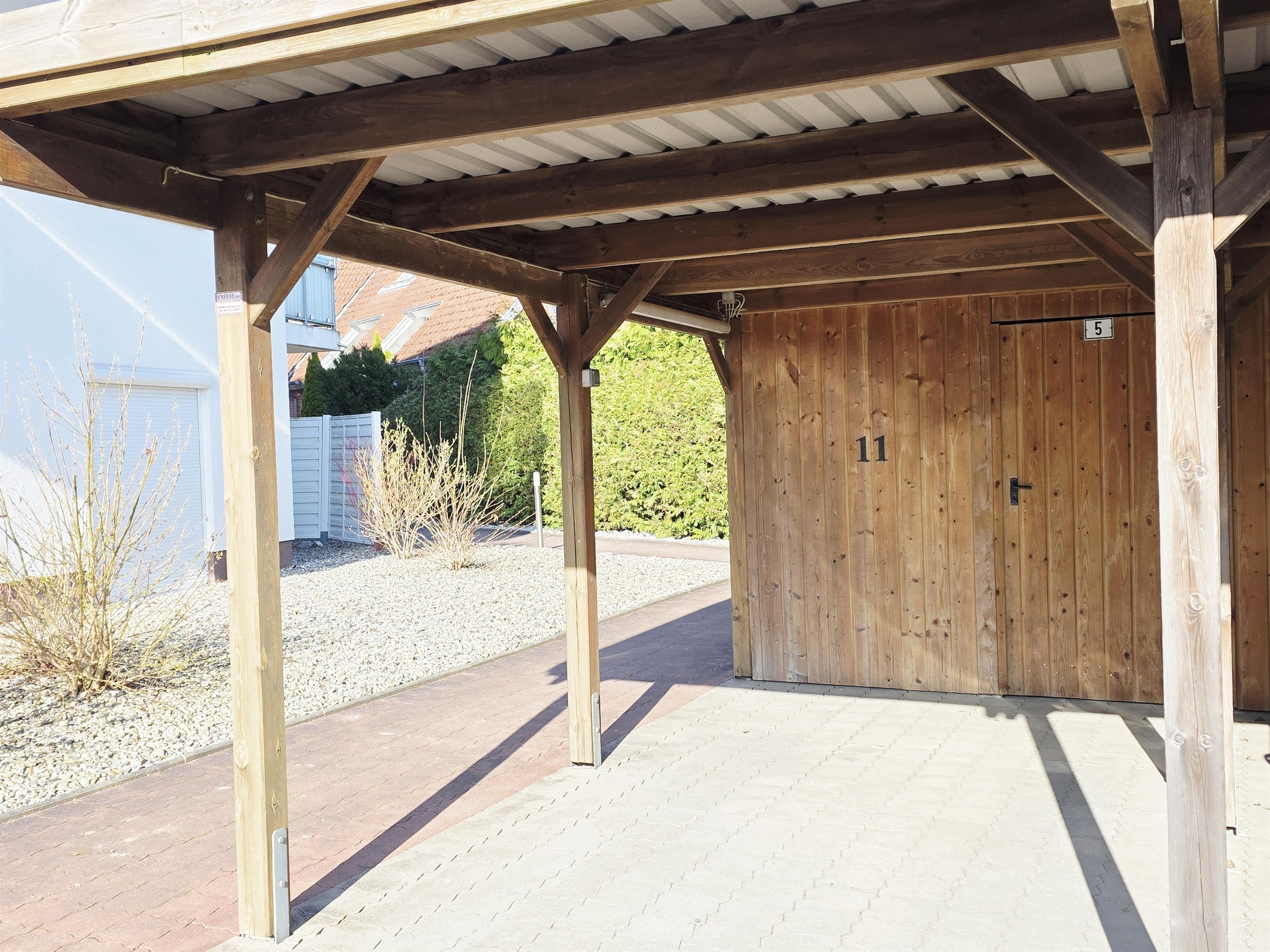 Zur Wohnung gehört ein Carport mit Schuppen für Fahrräder.