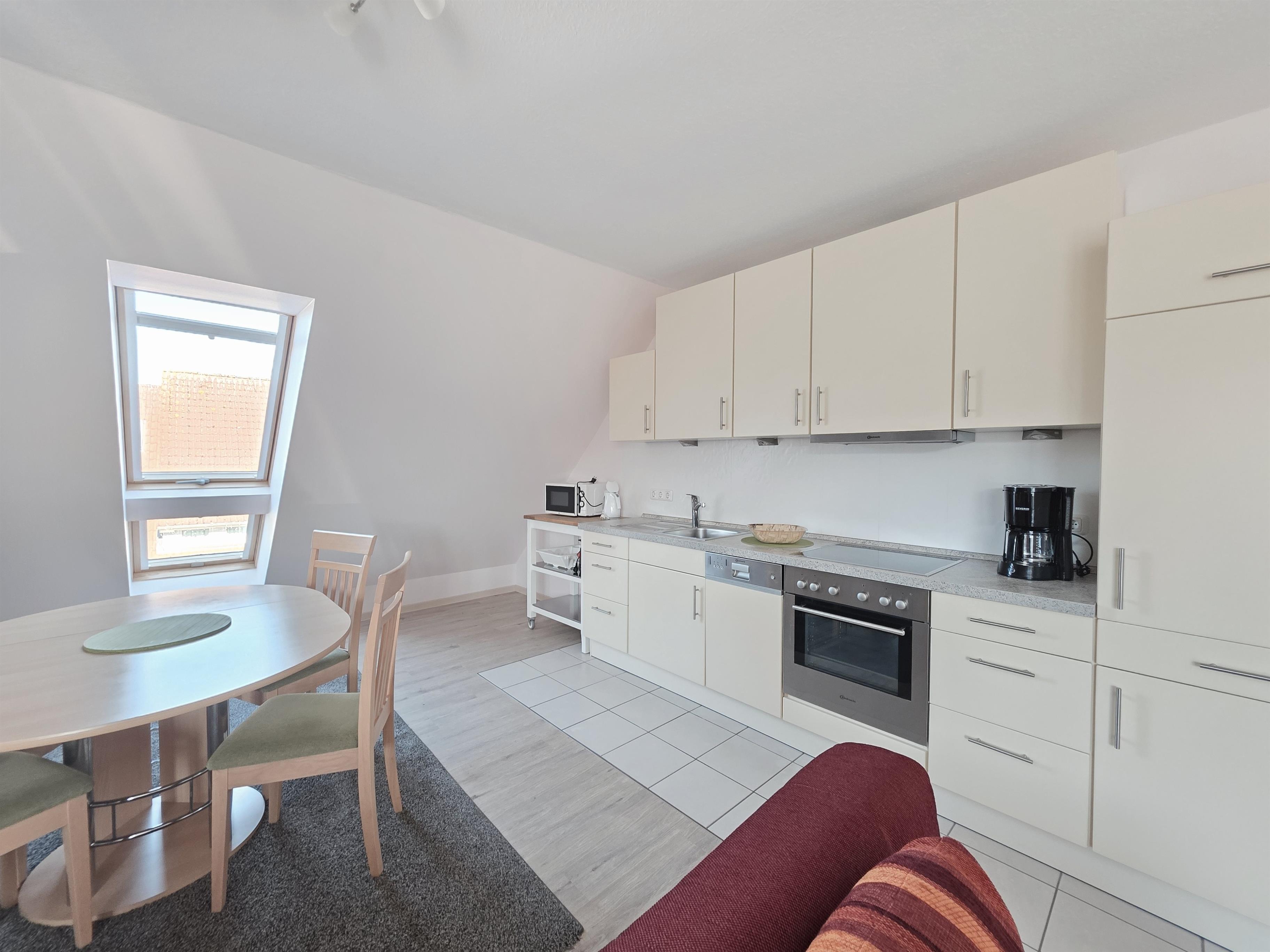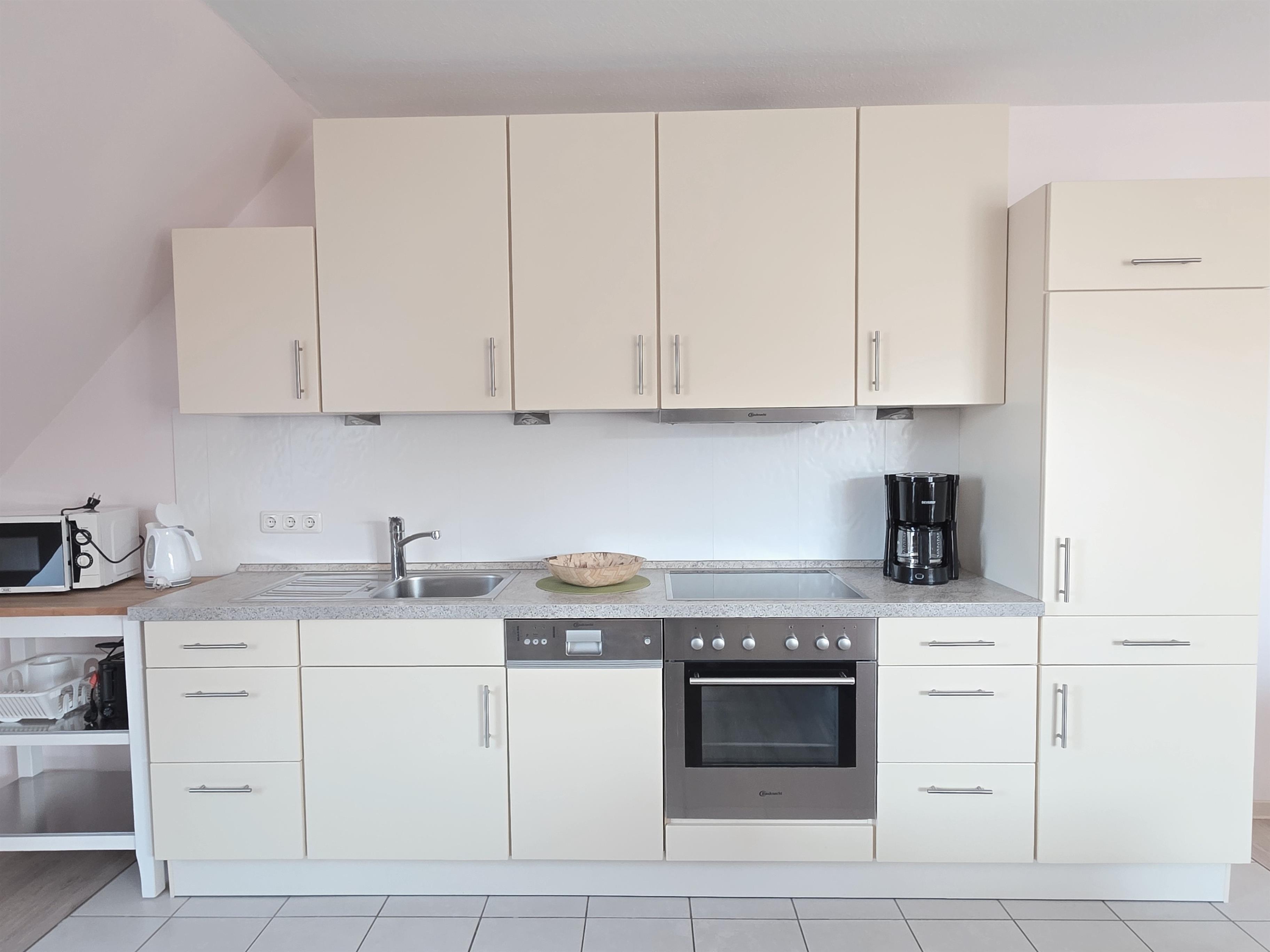 Die offene Küchenzeile ist mit Ceranfeld, Backofen, Mikrowelle, Kühlschrank/ Gefrierfach, Geschirrspüler und den üblichen Küchengeräten sehr gut ausgestattet.