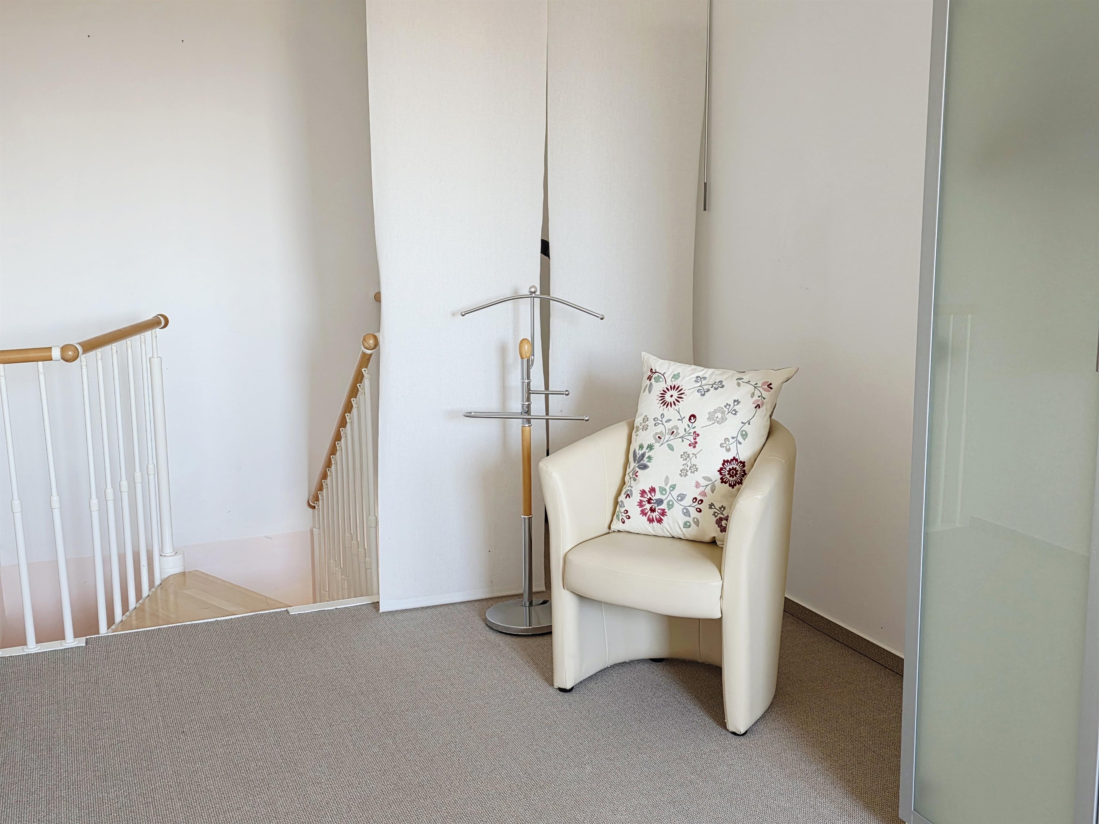 Über die Wendeltreppe erreichen Sie ein geräumiges Schlafzimmer mit komfortablen Doppelbett & Kleiderschrank.